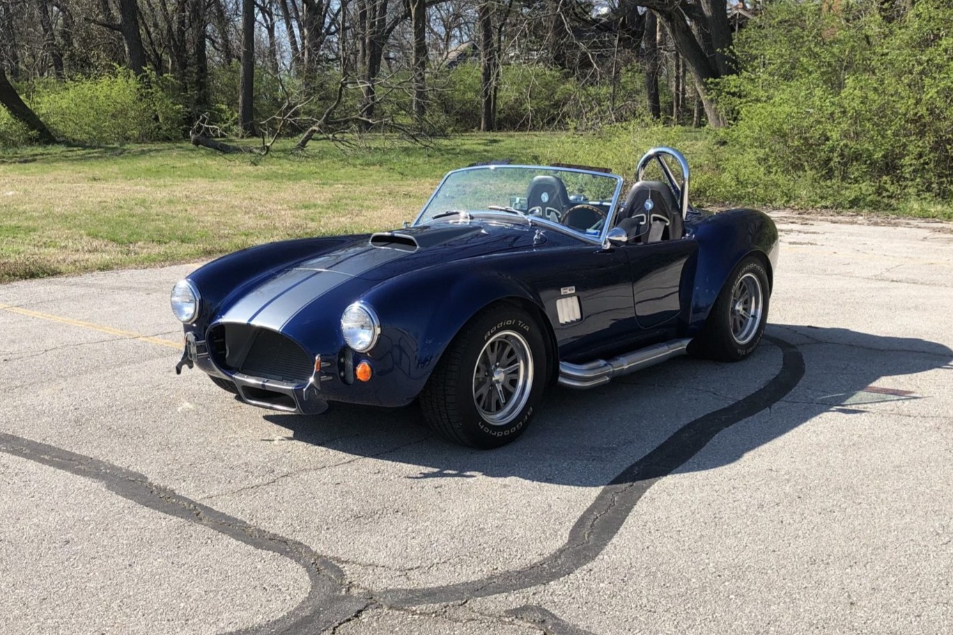 Additional equipment includes a chrome roll hoop, chrome quick-jack points, and wind wings. Four-lug 15″ Halibrand-style wheels measure 12″ wide out back and 8″ up front, and are shod in BFGoodrich Radial T/A white-letter tires. Running gear consists of suspension components from a 1990 Ford Mustang, a three-link rear end with coilovers, and a steering rack with aluminum bushings sourced from Whitby Motorcars.