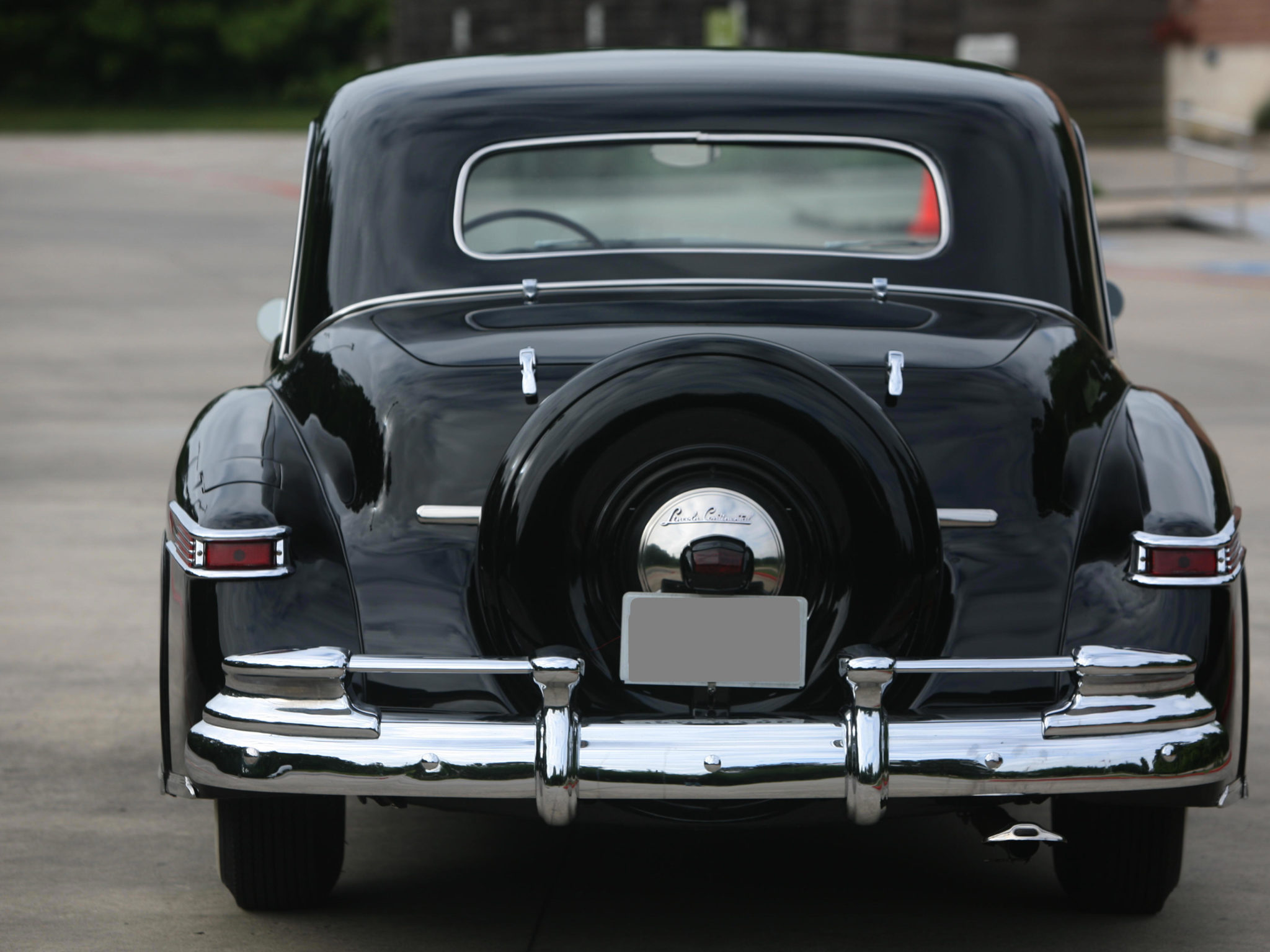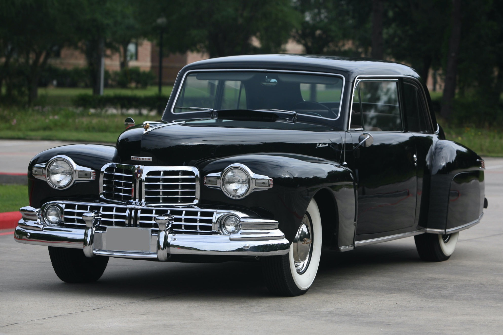 Steel 15″ wheels are fitted with chrome beauty rings, hub caps featuring gold Lincoln scripts, and Firestone wide-whitewall tires. An external spare wheel carrier is mounted behind the trunk. Equipment includes a vacuum-operated antenna that the seller notes does not function, and must be raised and lowered manually.