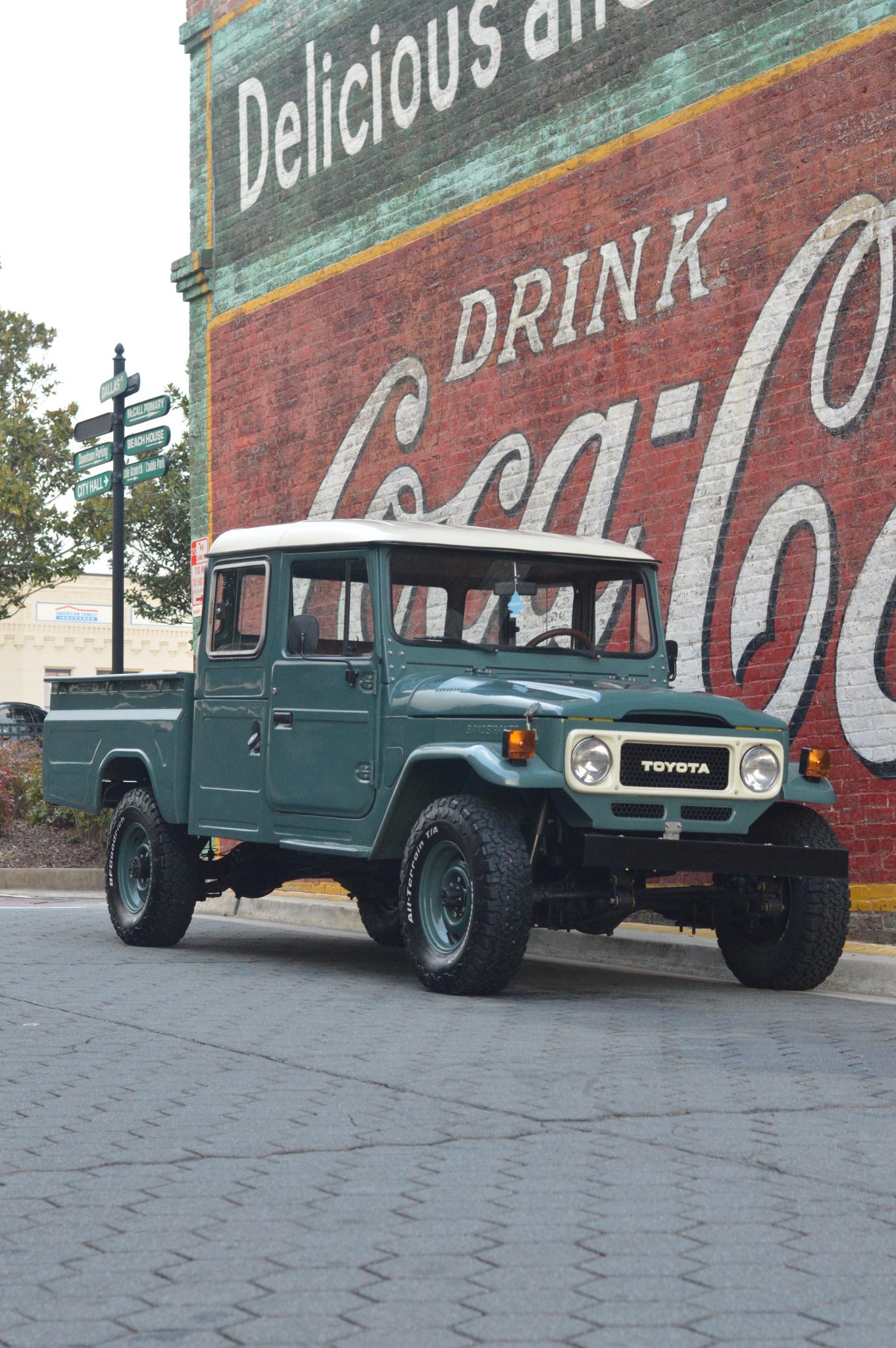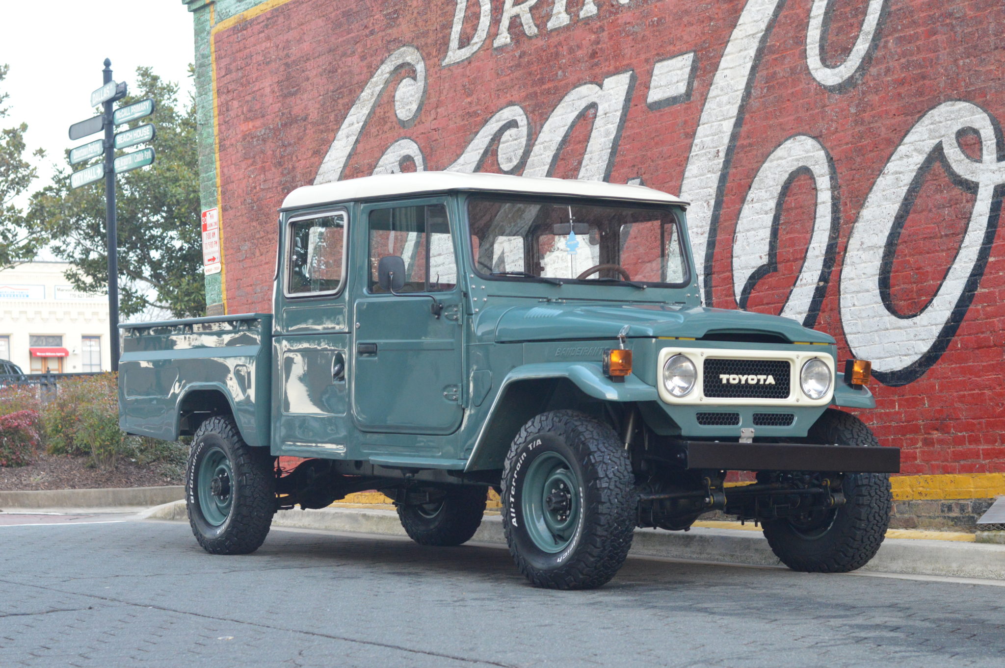 Color-matched 16″ steel wheels are wrapped in 235/85 BFGoodrich KO2 tires. The rear drum brakes were reportedly rebuilt under current ownership, and the front brakes were converted to discs.