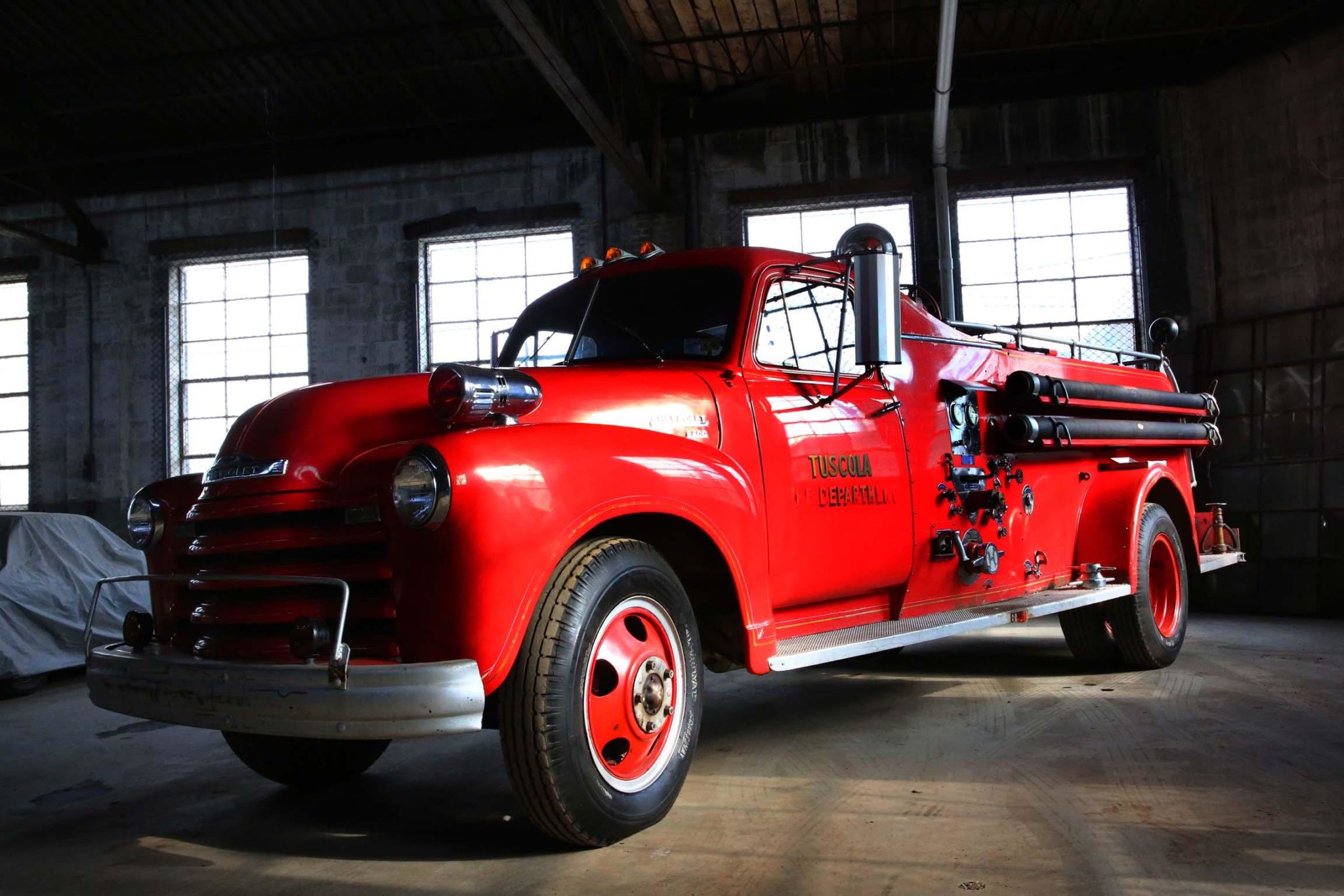Steel wheels measure 20″ in diameter and are mounted with 7.50-20 US Royal Fleetway tires. Braking is handled by four-wheel drums. Photos are provided to show the wooden rear load floor and controls for the untested pump in the gallery below.