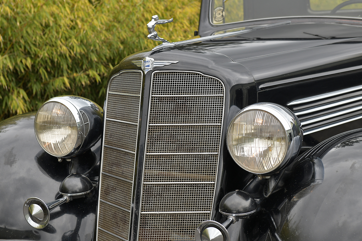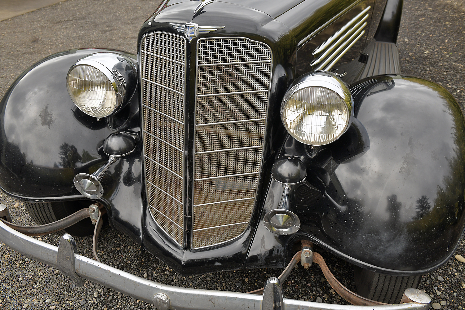 Black 16″ steel wheels are pinstriped and wear Buick-branded hubcaps and Firestone Deluxe Champion tires with pie crust sidewalls, including a matching spare housed within the lockable carrier.