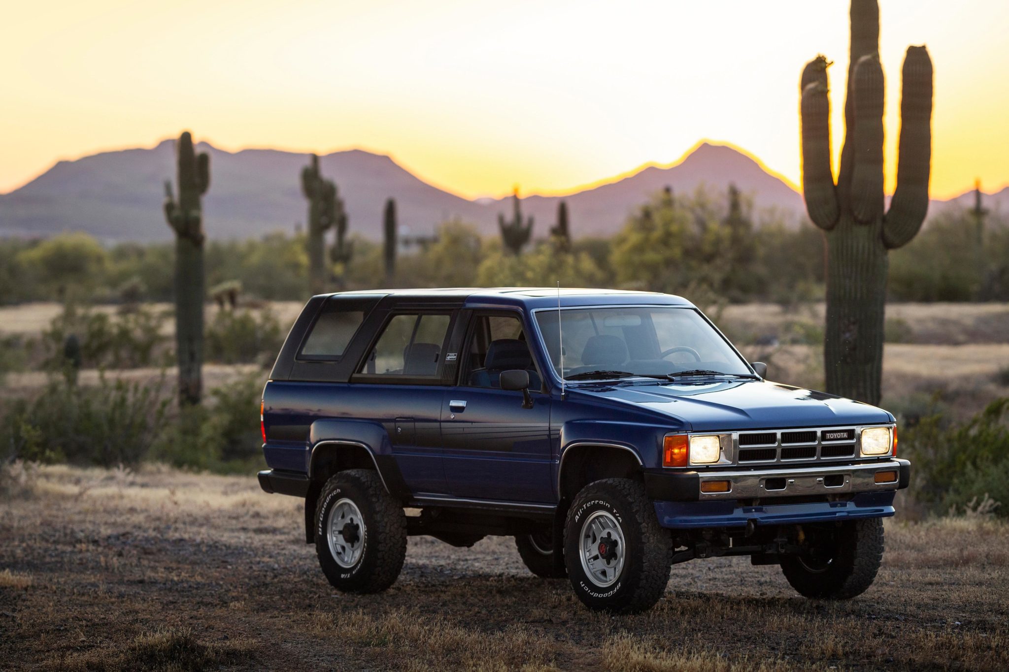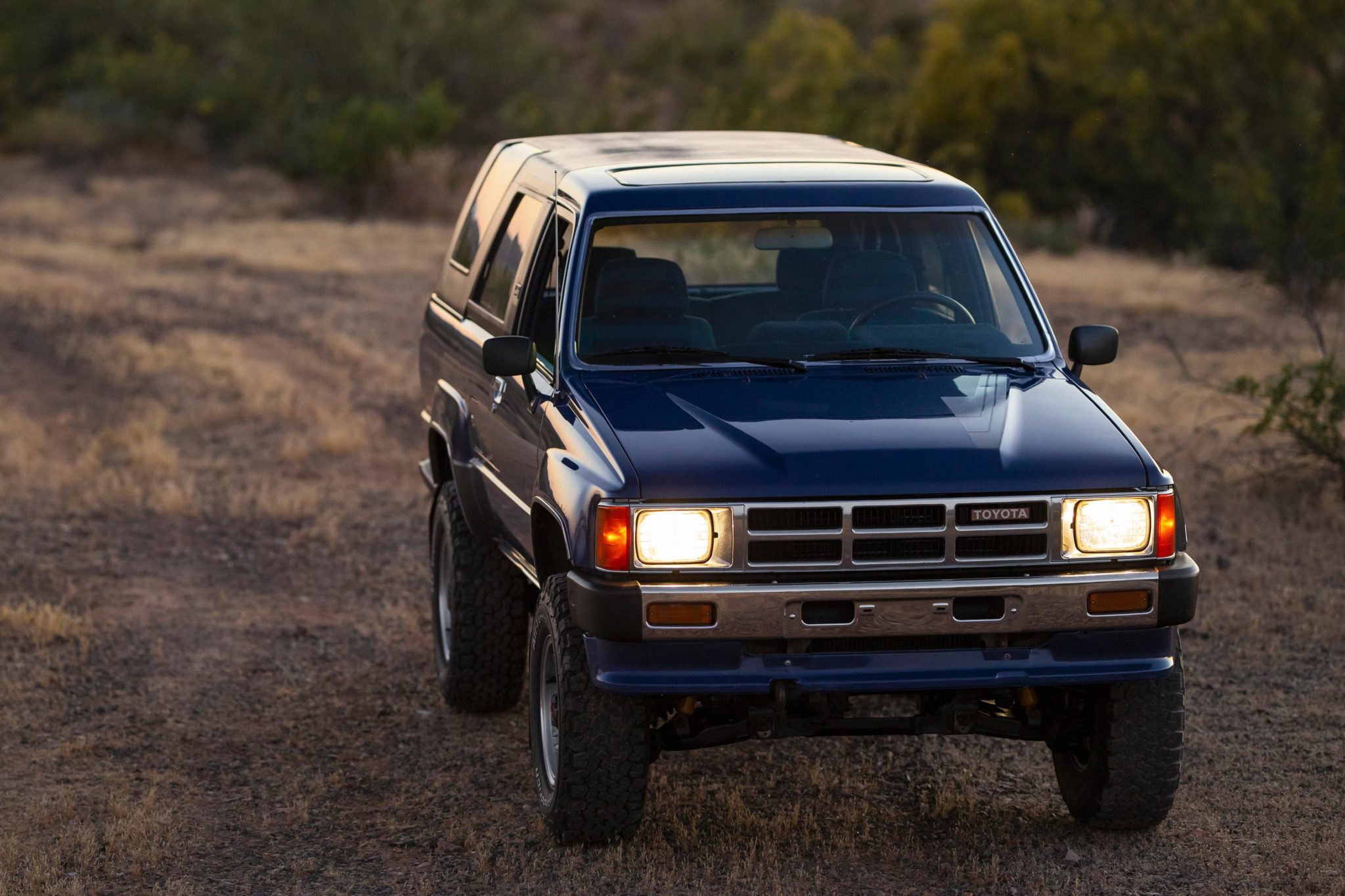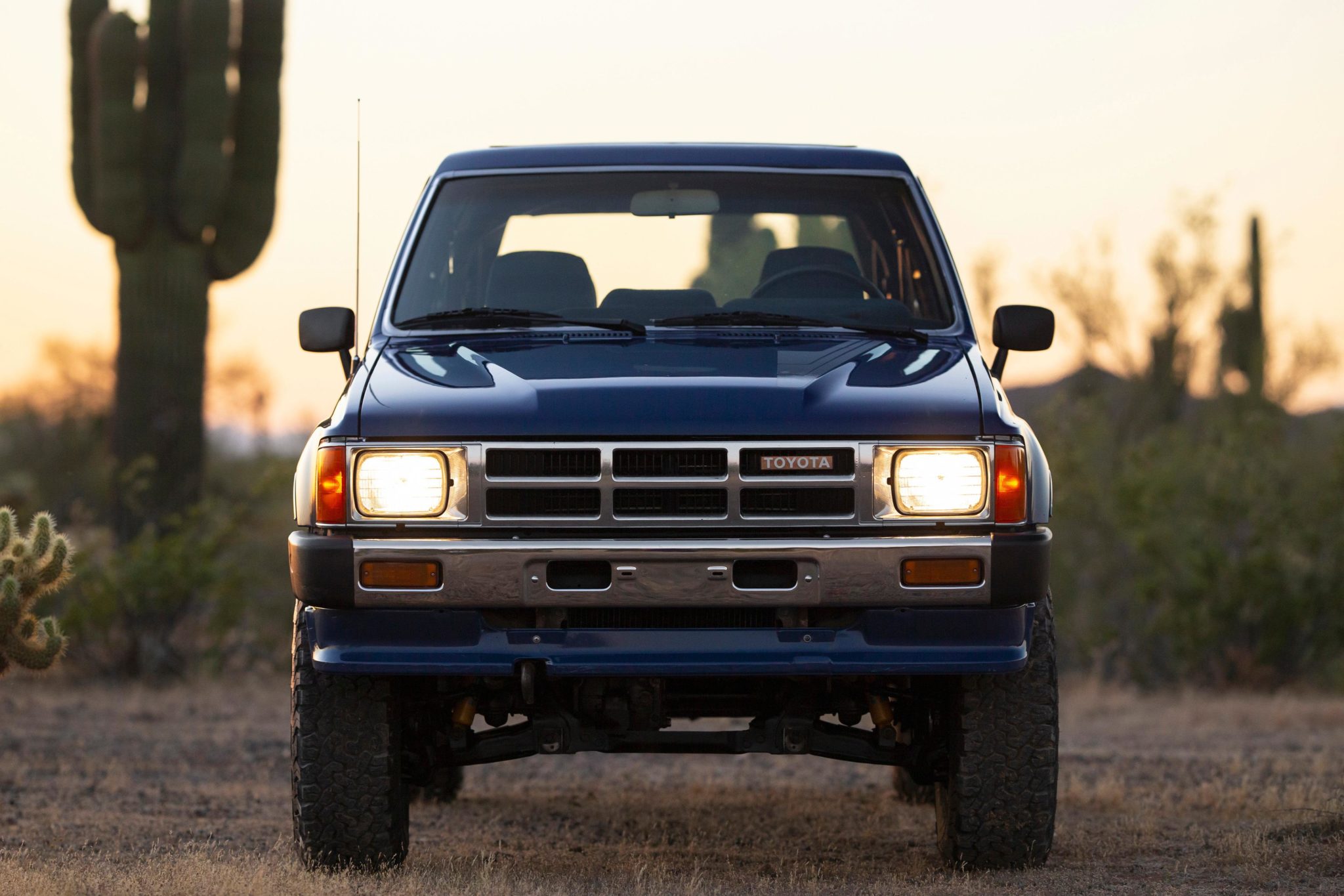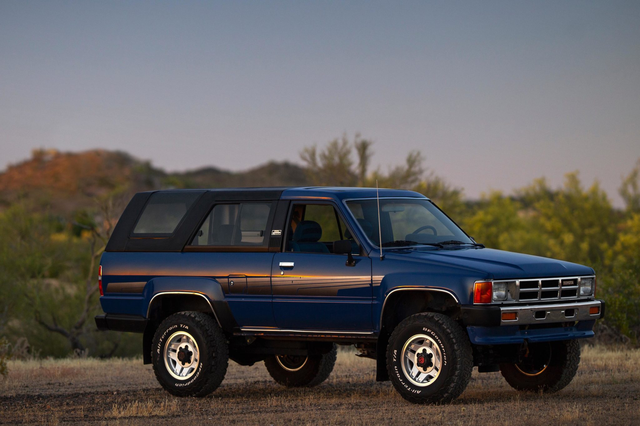 Refinished silver 15″ alloy wheels wear BFGoodrich All-Terrain T/A KO2 tires that were installed in November 2018, and a steel spare is located under the truck. The front axle is equipped with Aisin manually locking hubs, and Bilstein shocks are fitted at all four corners. Front sway bar end links were replaced in preparation for the sale.