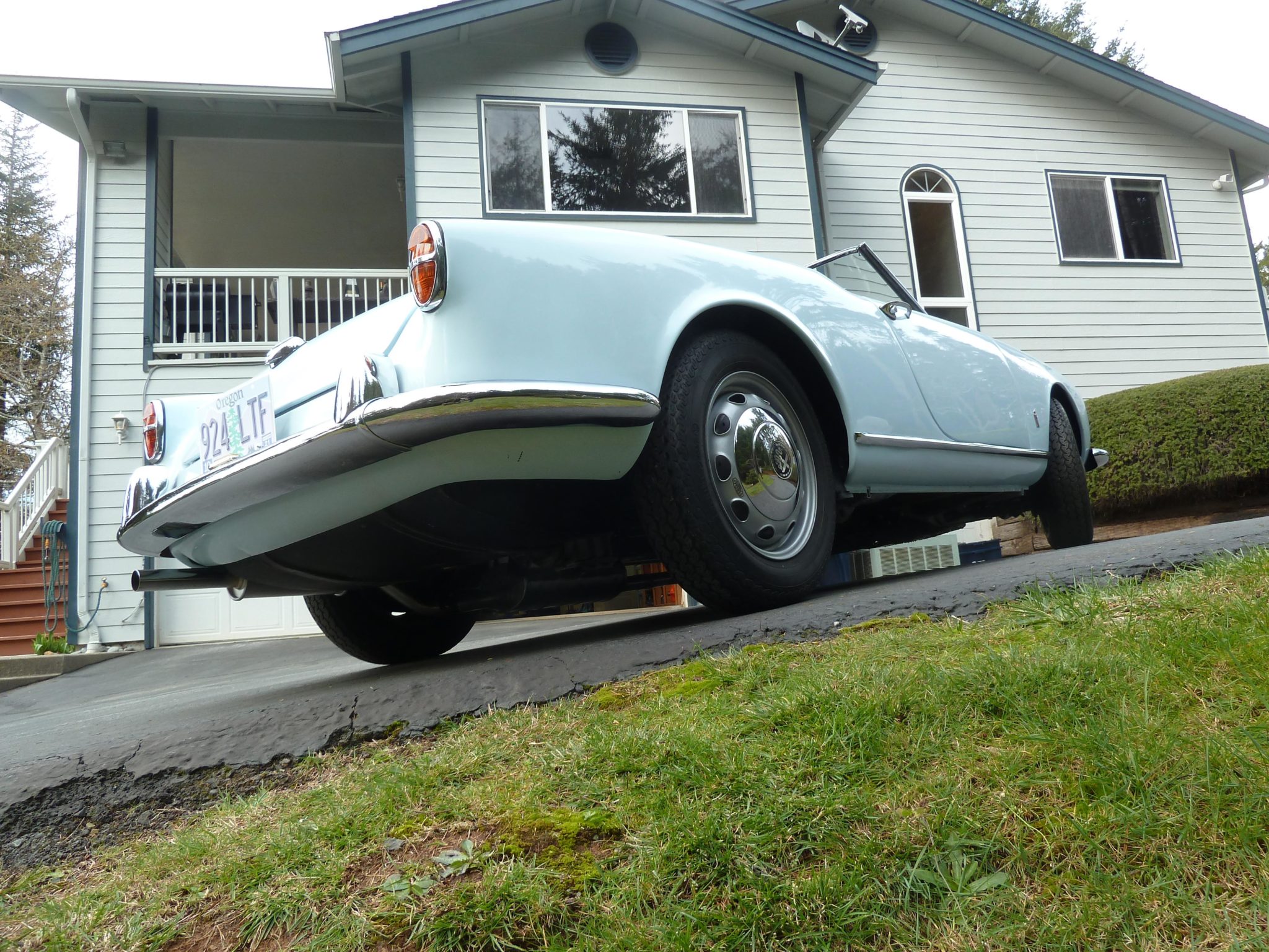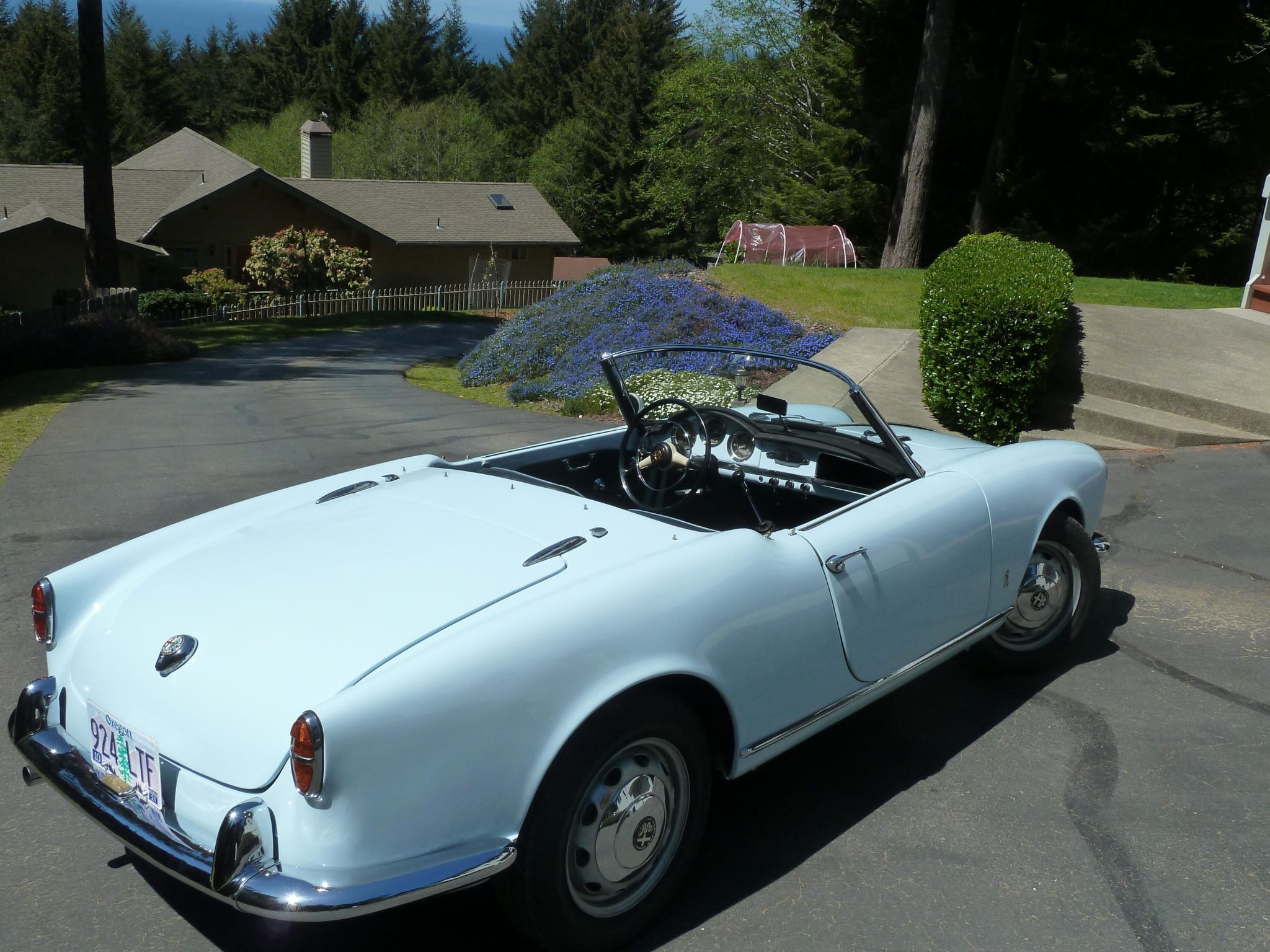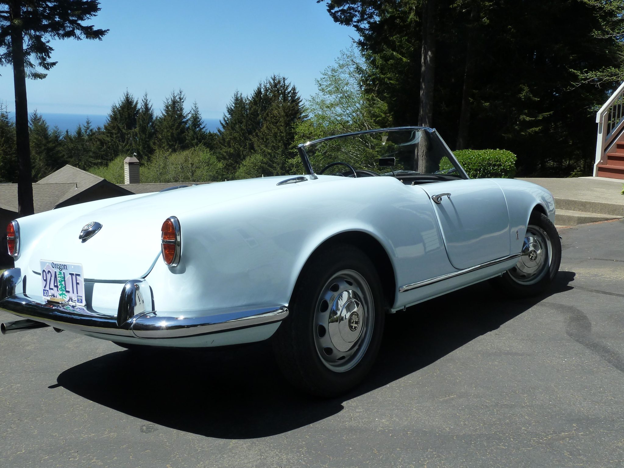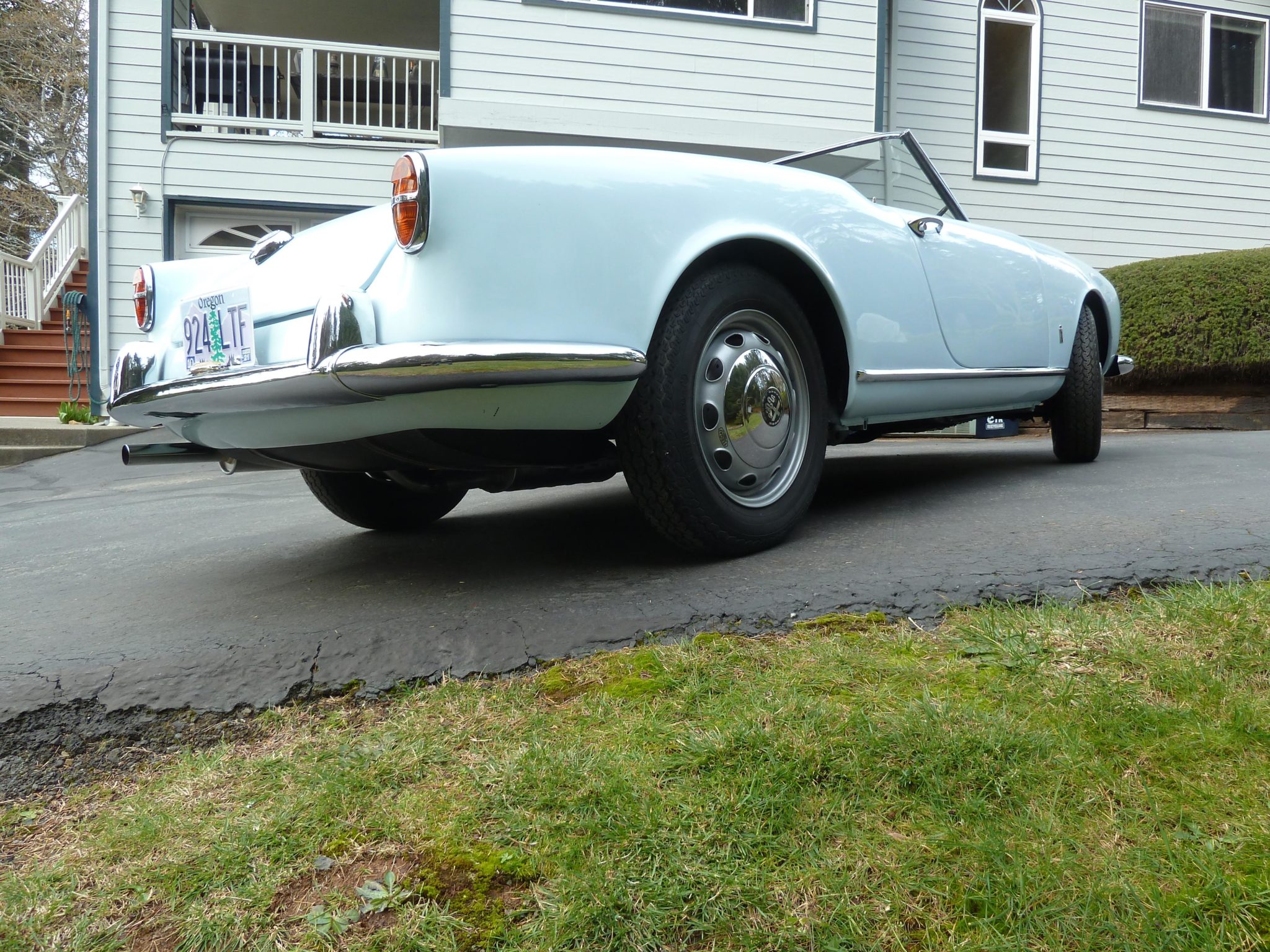 Painted Giulietta Fergat wheels wear chrome hubcaps, and an unmounted matching spare wheel is included in the sale. Older Vredestein Sprint Classic tires should be replaced before road use according to the seller. The front suspension and brakes were rebuilt by Zimmerman Racing of Oceanside, California with bushings reamed to fit mating pins as well as replacement tie rod ends, wheel bearings, seals, hydraulics, and brake shoes. Koni shocks were fitted along with a chassis alignment and further brake and suspension adjustments by Hooligan Racing.