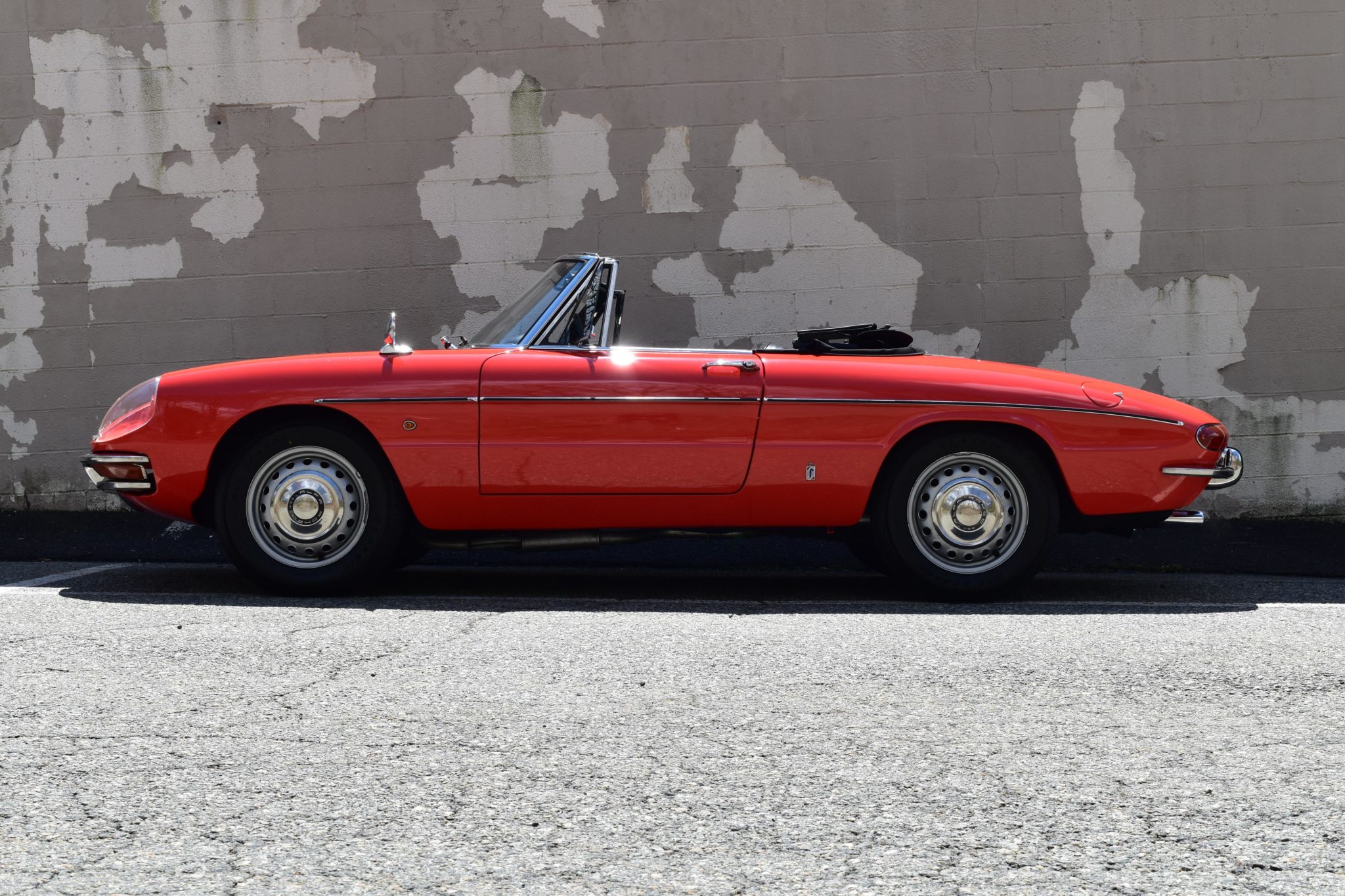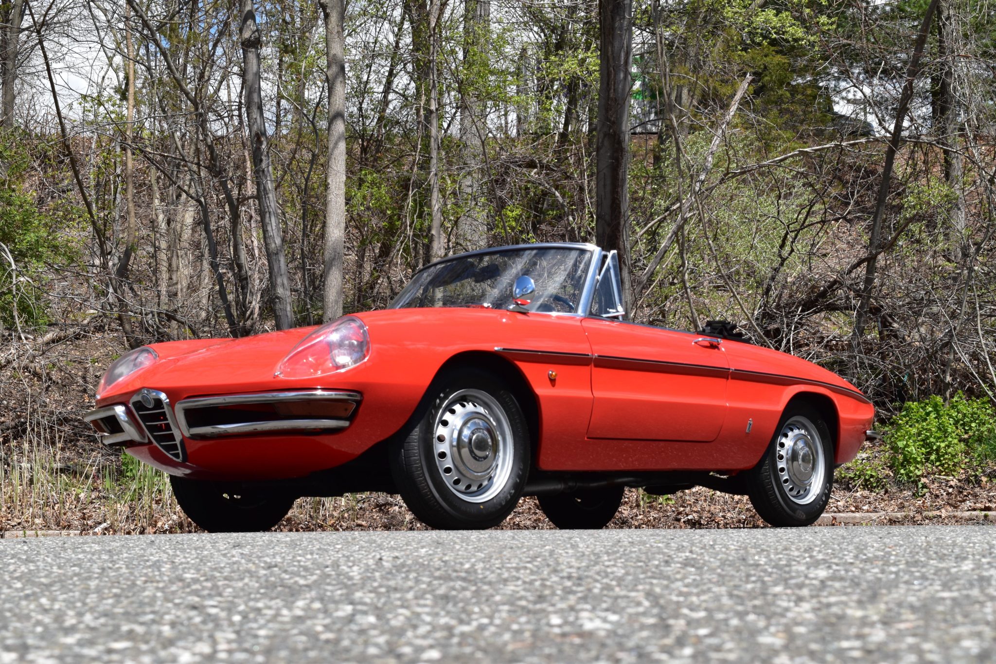 Painted 15″ steel wheels feature Alfa Romeo hub caps and wear 165/80 Classic LL800 all-season tires. The convertible top was replaced during previous ownership.