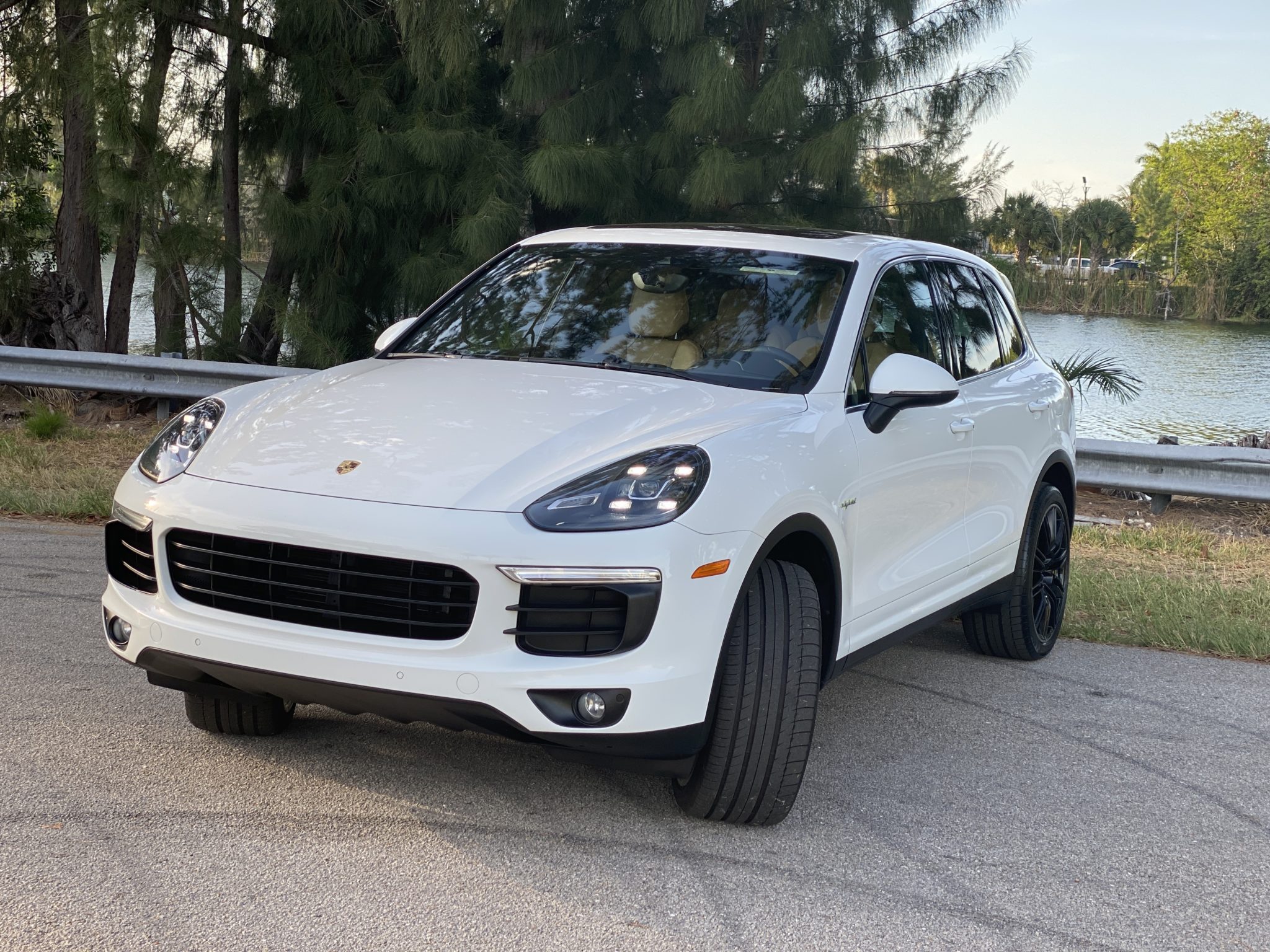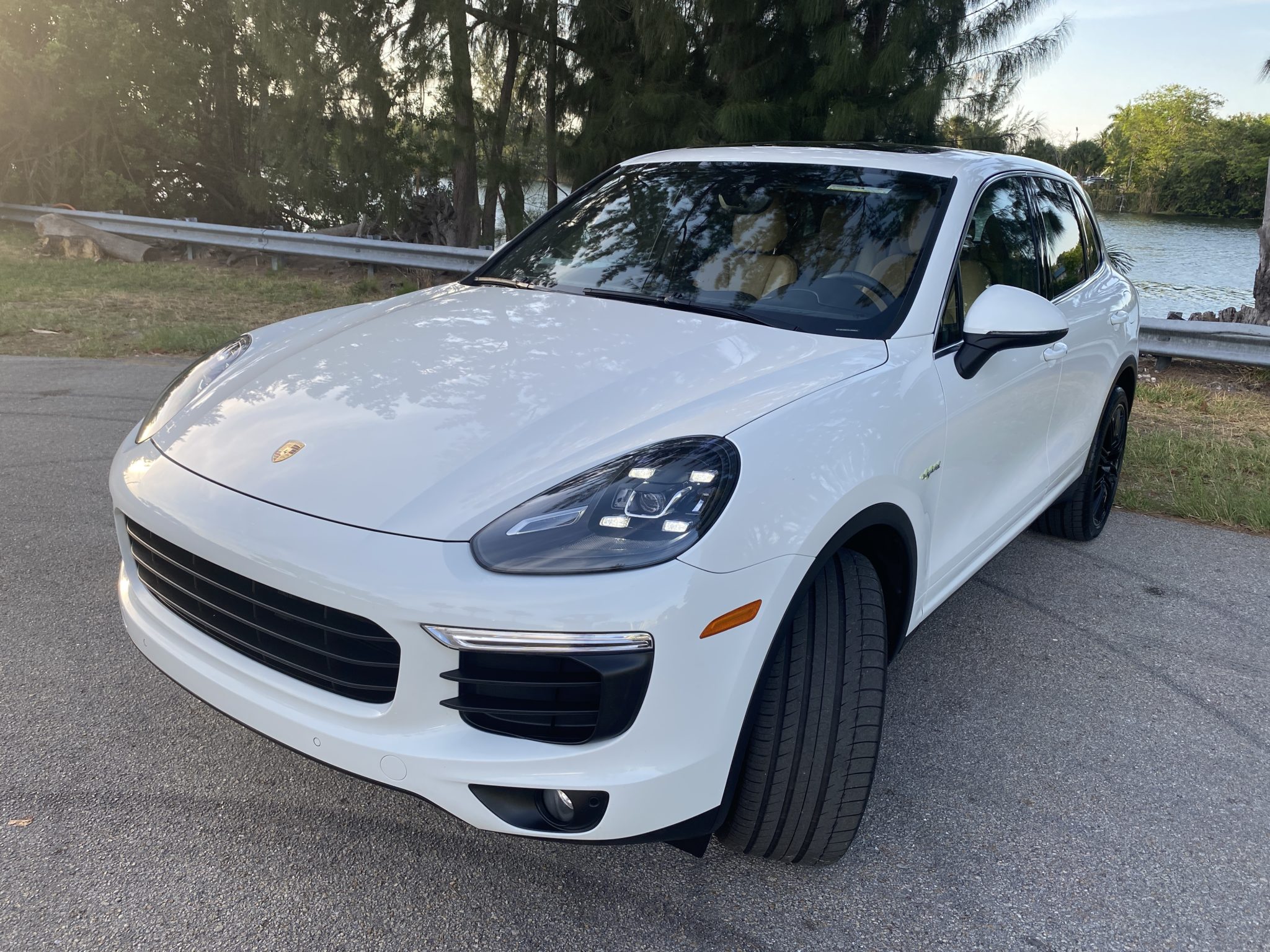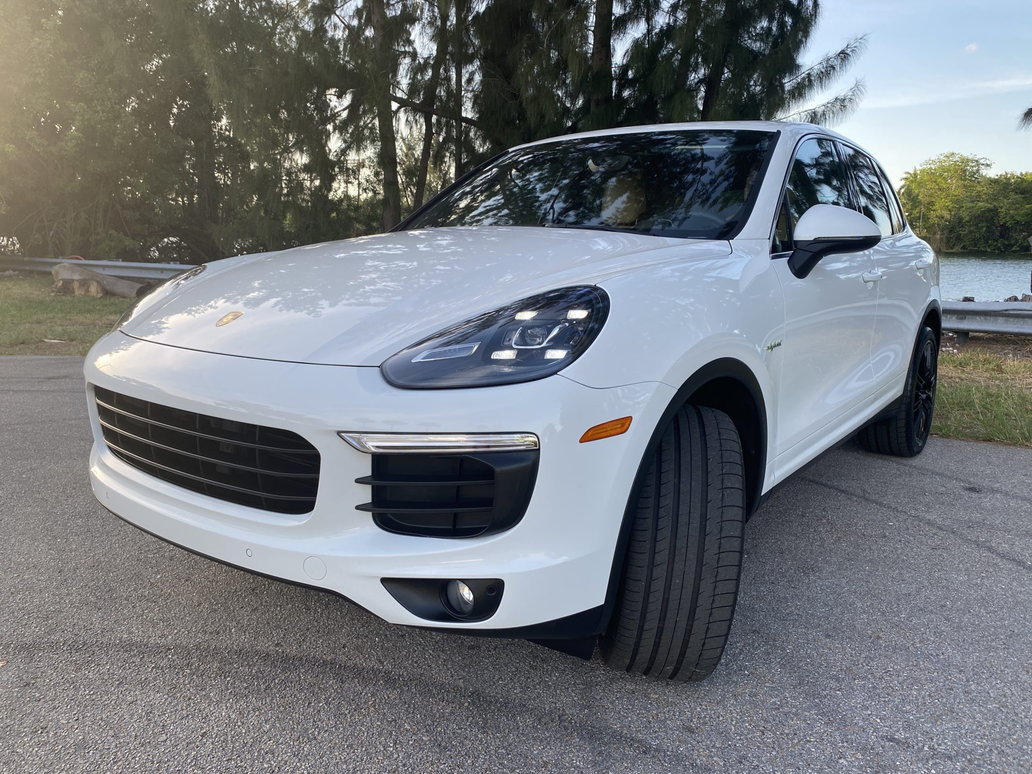 Black 21″ SportEdition wheels feature silver lips and colored Porsche crest center caps, and wear 295/35 Michelin Latitude Sport tires showing 2019 date codes. Green brake calipers and PASM sport suspension were standard on the E-Hybrid.