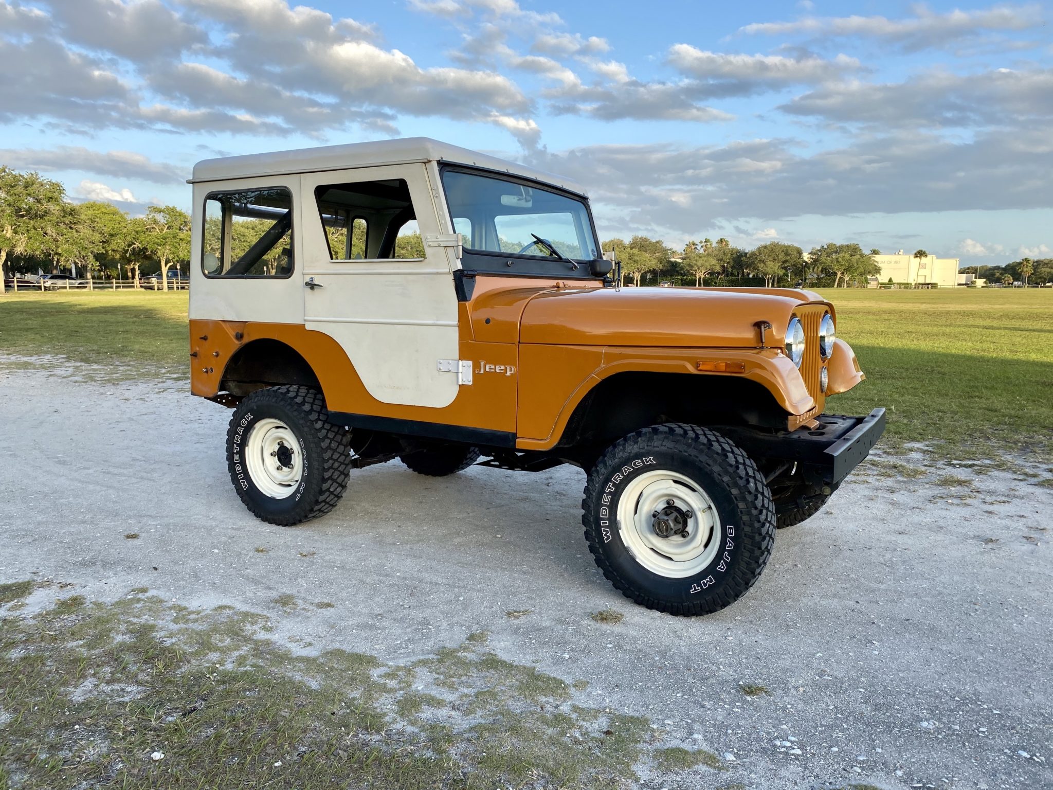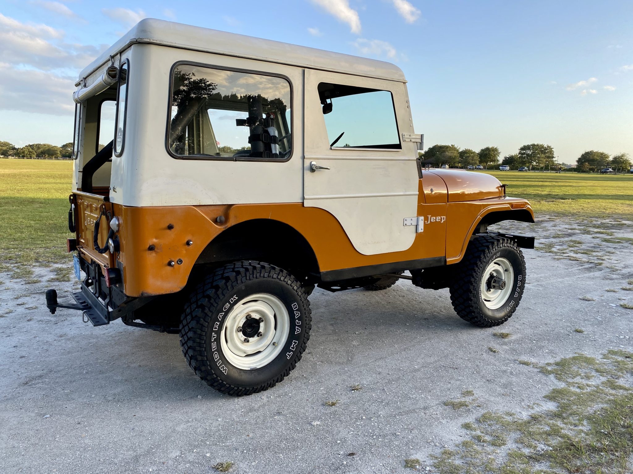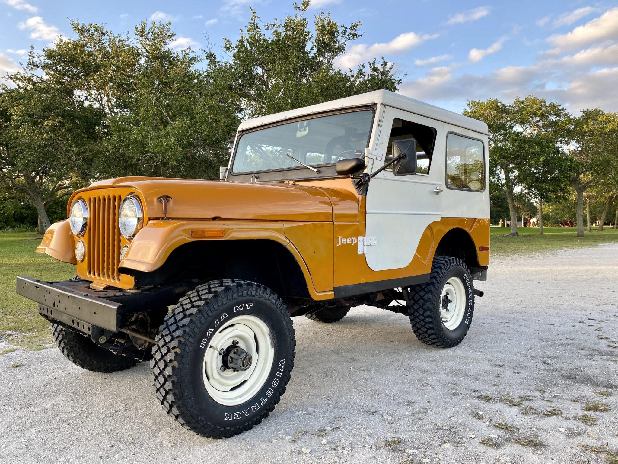 Steel 15″ wheels are wrapped in Dayton Widetrack Baja MT tires sized 235/75. The seller states that the brakes were rebuilt with new wheel cylinders, shoes, and rear drums.