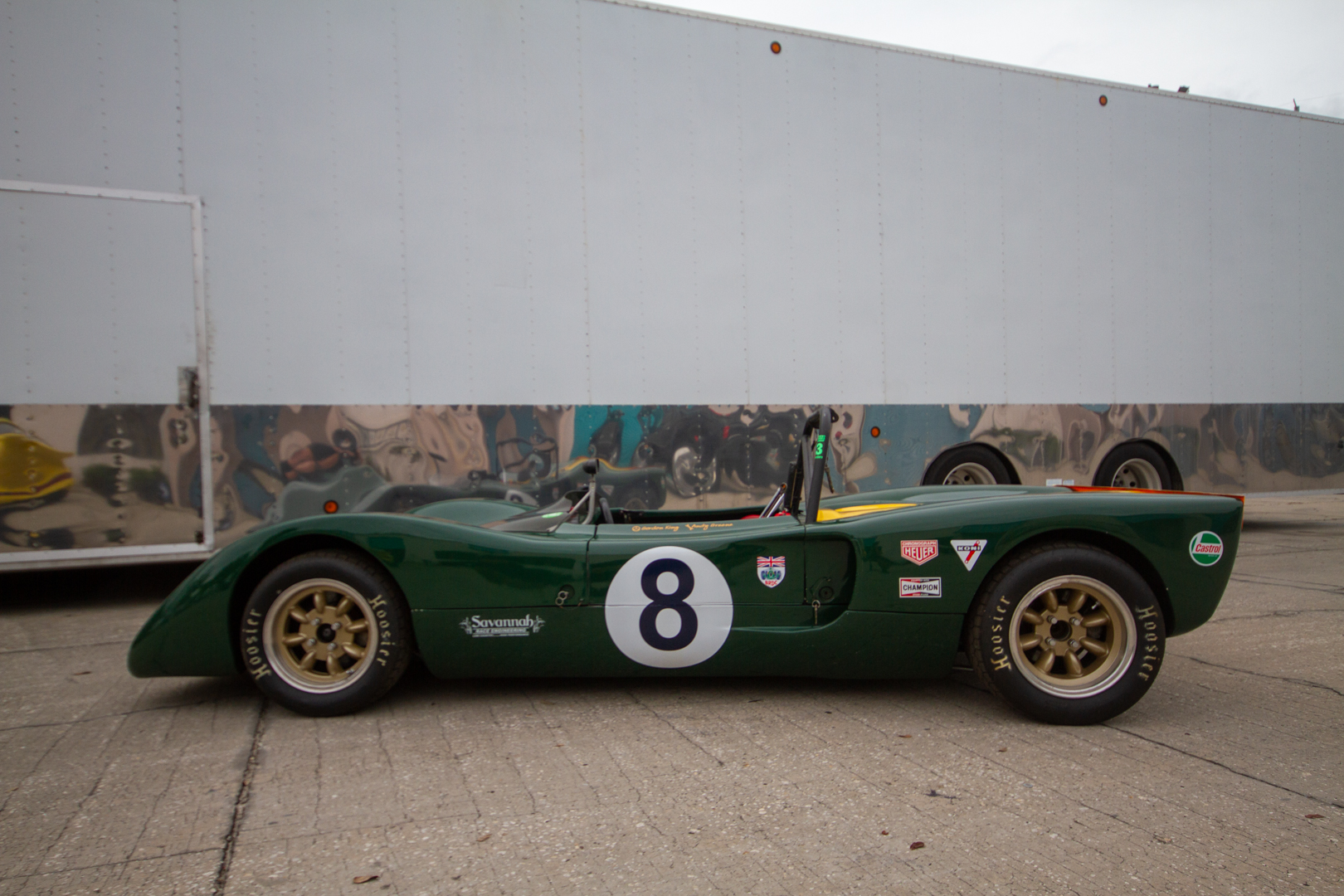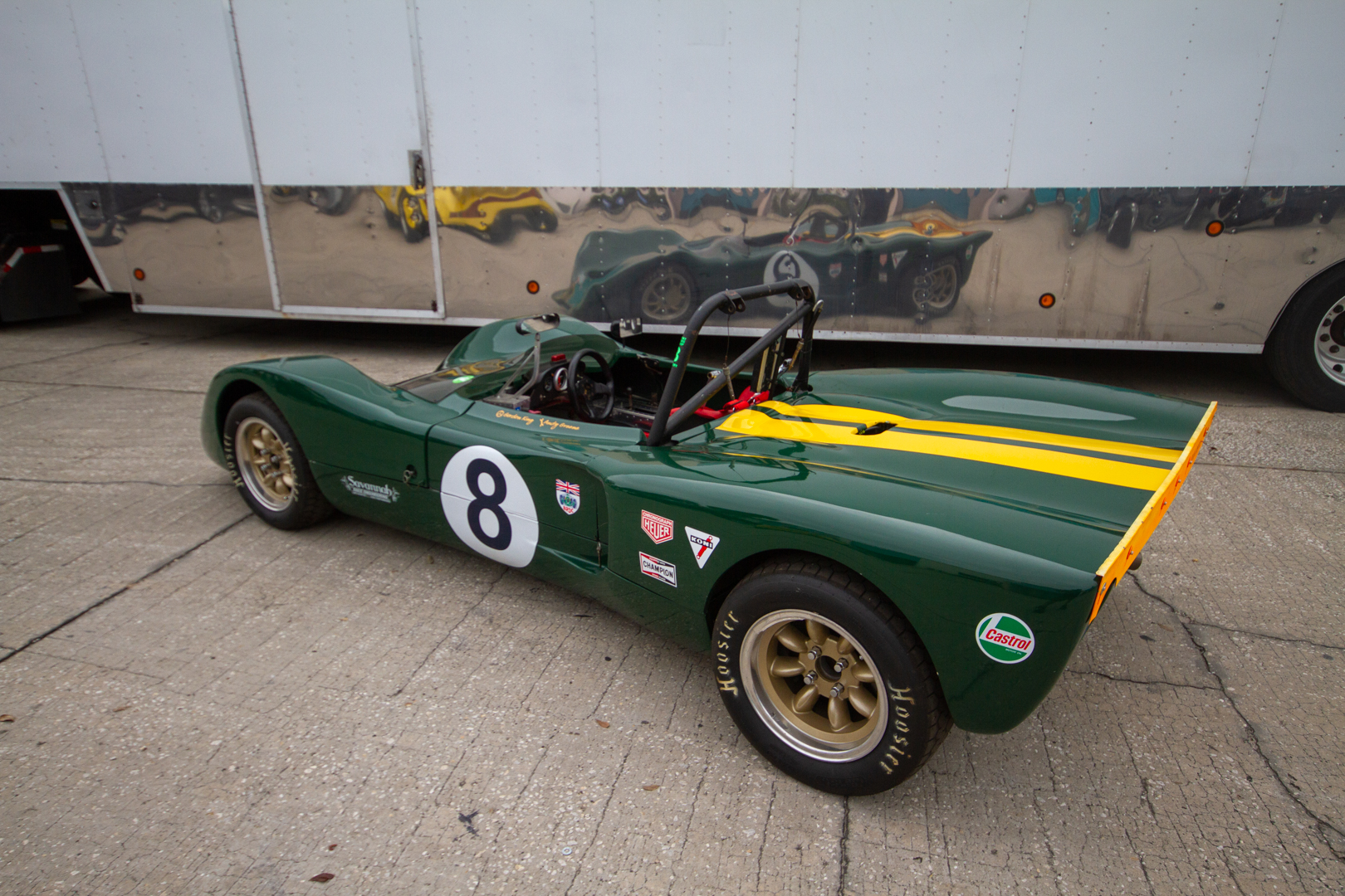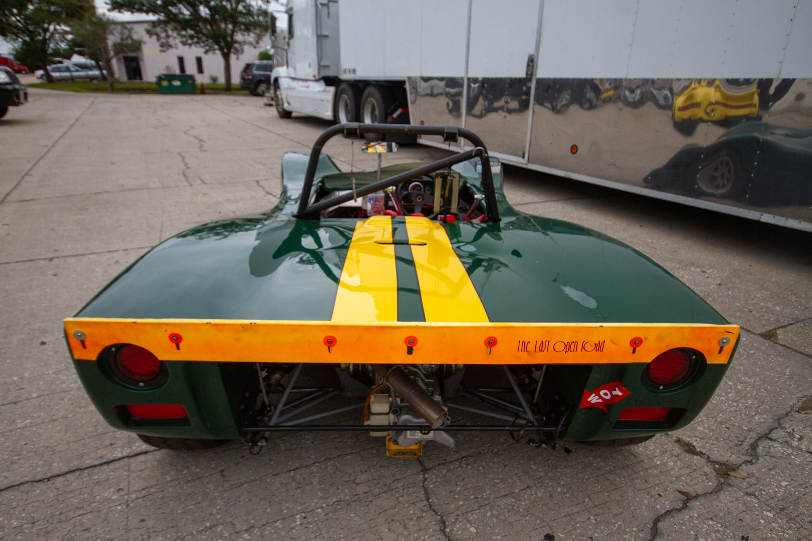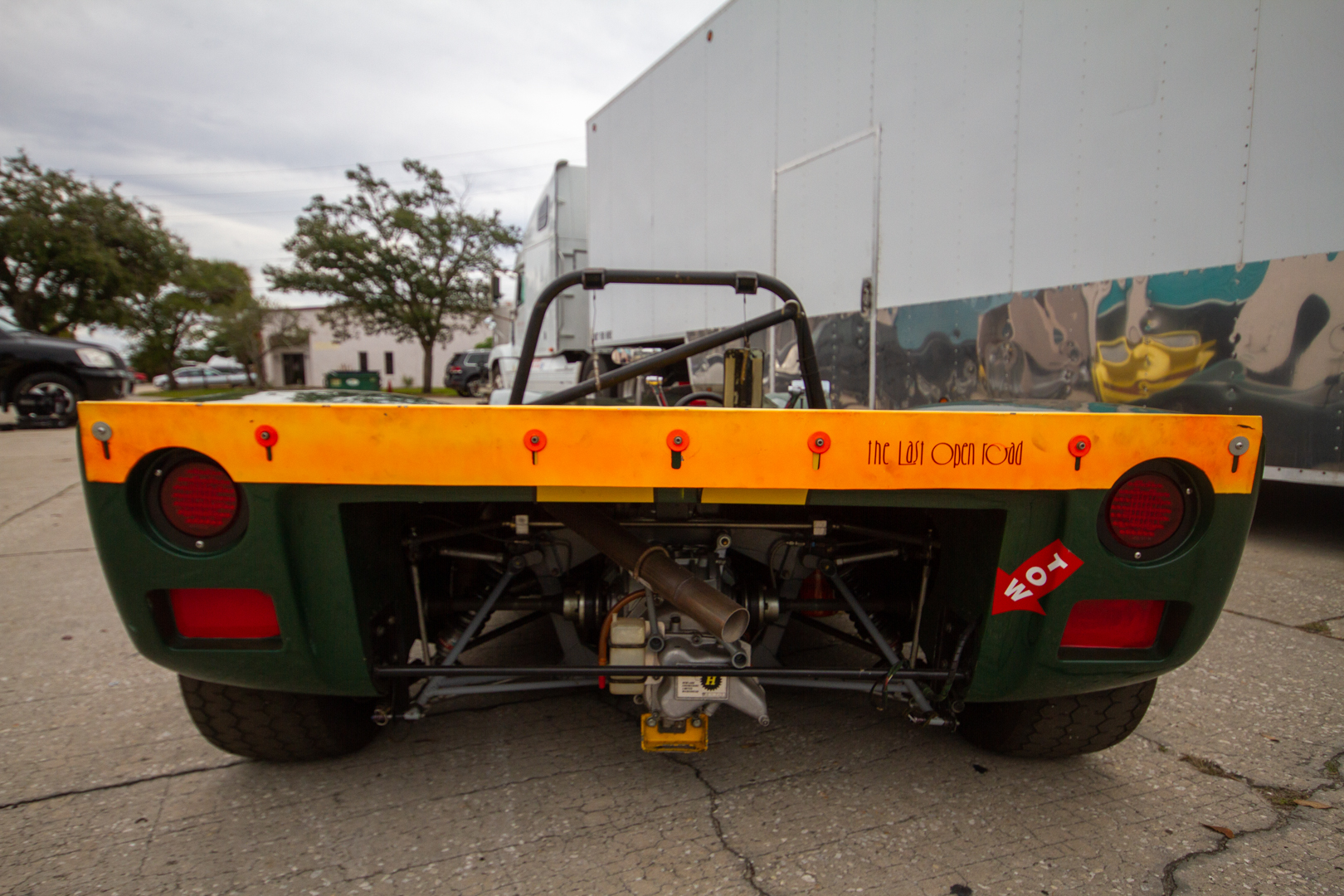 Beneath the composite bodywork is a semi-monocoque steel tube and aluminum plate chassis with adjustable control arms, sway bars, and Koni coilover shocks. The Panasport-style wheels are wrapped in Hoosier TD rubber, and braking is managed by discs with aluminum calipers at each corner.
