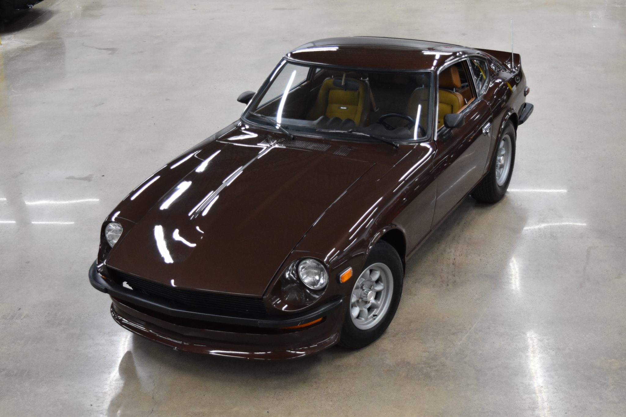 Minilite 14″ alloy wheels are wrapped in Semperit Spider radial tires said to have been installed in 1978, while a black 14″ steel spare wheel wears a Bridgestone tire. Additional equipment includes matte-black plastic bumper covers, a painted front valance, and a heated rear window, plus chrome-accented door handles, window trim, and Z emblems.