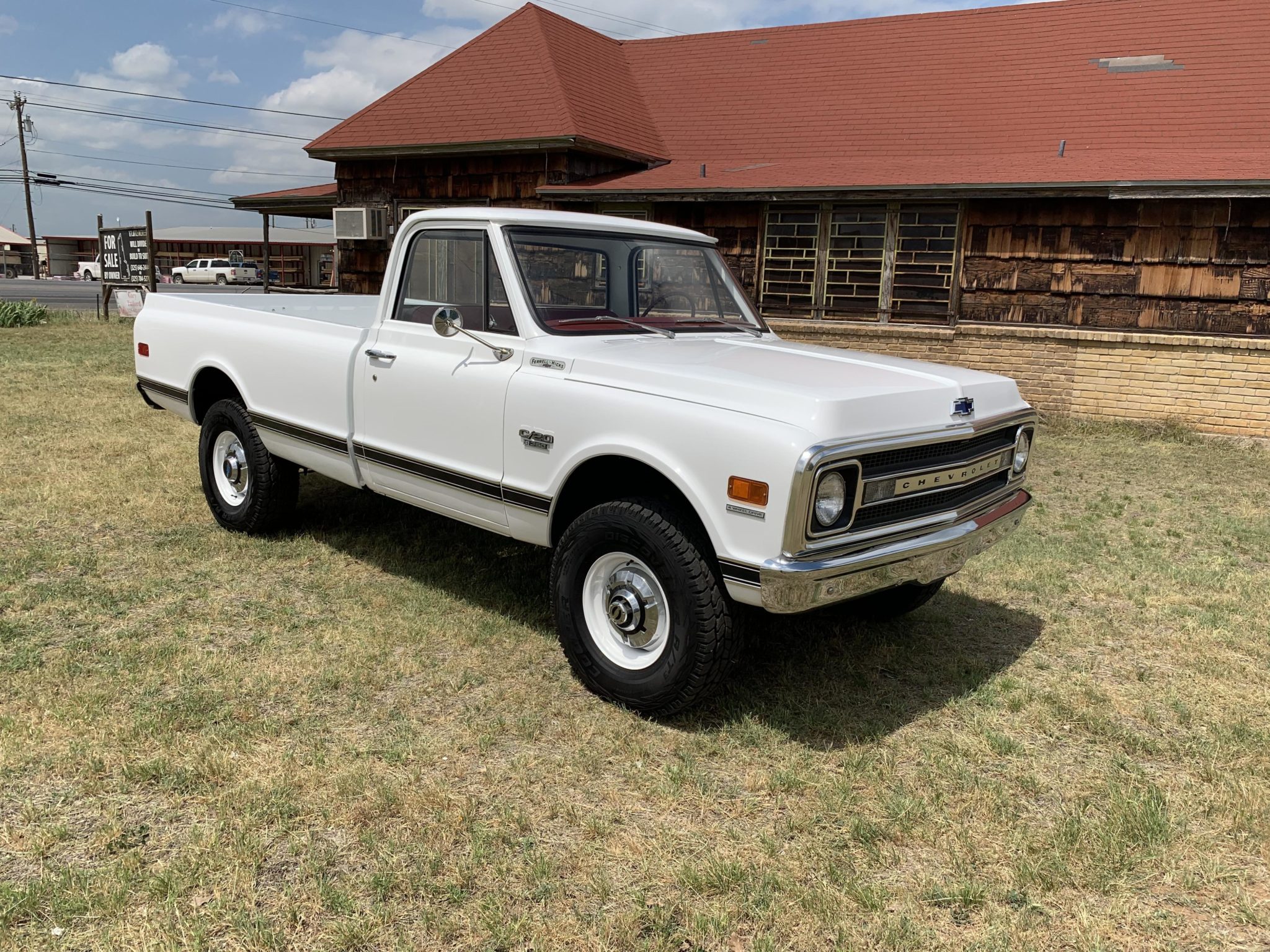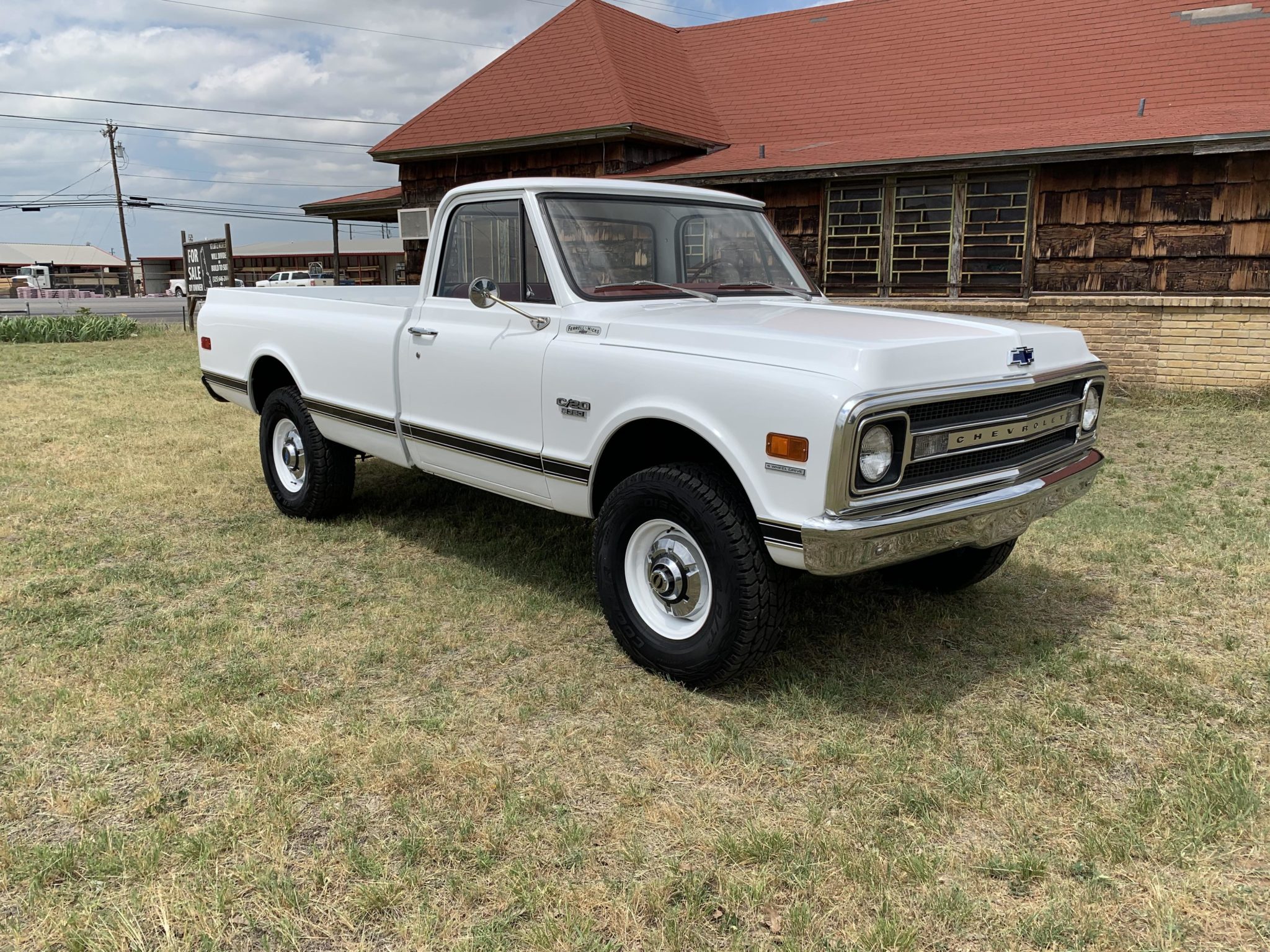 White 16″ steel wheels wear chrome hubcaps and Cooper Discoverer A/T3 tires. Power steering and brakes were equipped from new, and the truck features manually-locking Warn front hubs though a sticker detailing operation of Dana Spicer versions is found on the dash. C20 badges have been fitted to the front fenders, which also wear Ferrell-Hicks Chevrolet decals.