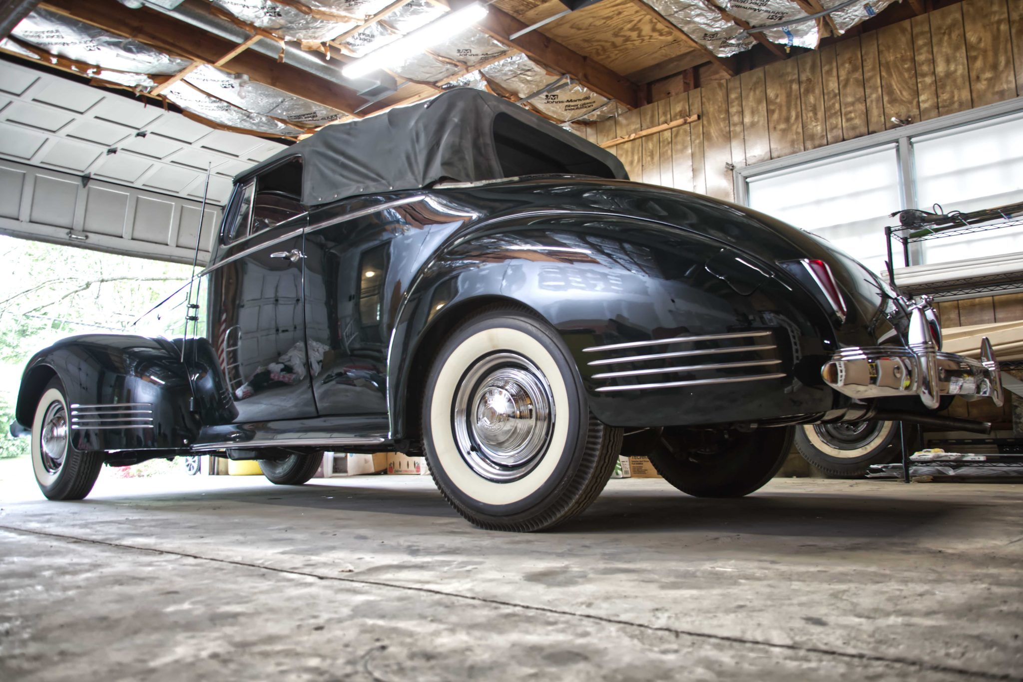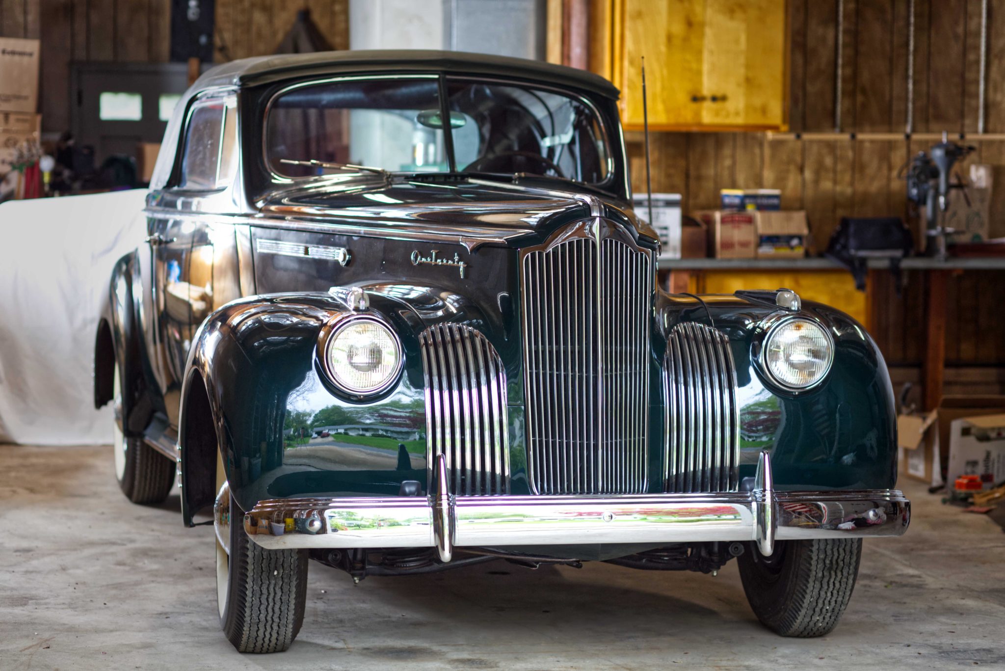 Whitewall tires are fitted on 15″ steel wheels with Packard-branded chrome covers and accent trim rings. Braking is handled by four-wheel drums. One-Twenty models featured coil springs up front with a leaf-sprung live axle at the rear.