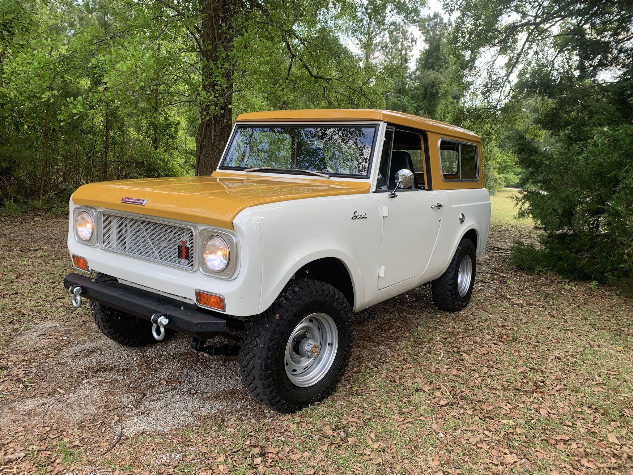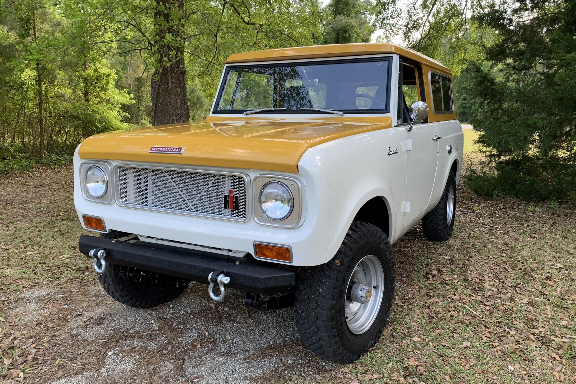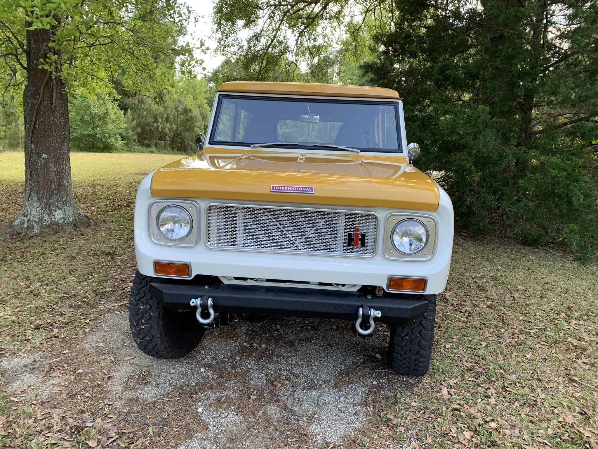 Steel front and rear bumpers with recovery shackles and a receiver hitch have replaced the stock versions. Painted 15″ steel wheels wear 30″ Falken Wildpeak tires and are mounted over repacked manually-locking Warn hubs up front. A refinished stock drop-down carrier for a spare is fitted at the rear, and the truck will come with a refinished fifth wheel without a tire. A power-assisted steering conversion using a Scout II gearbox has been carried out, and front disc brakes have been added along with new rear drum brake components.