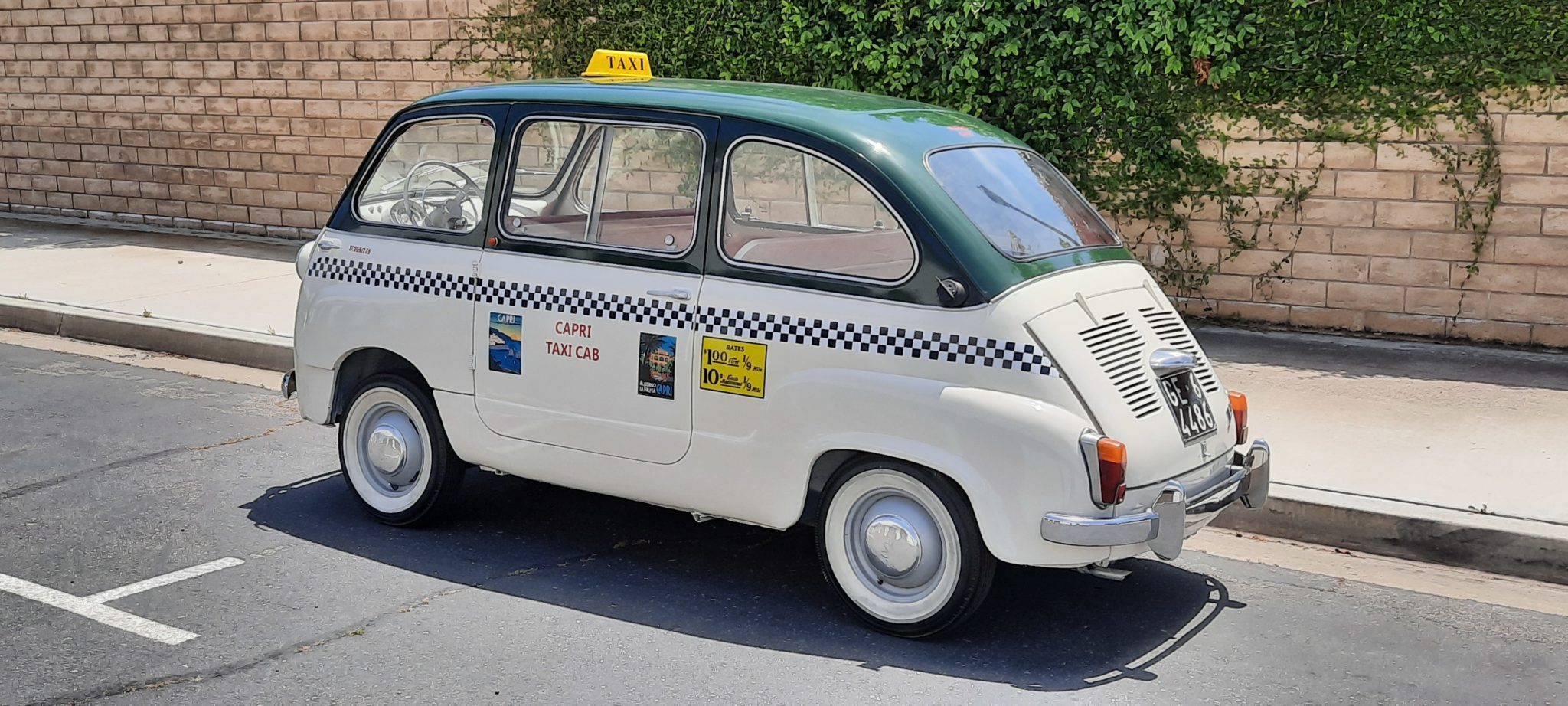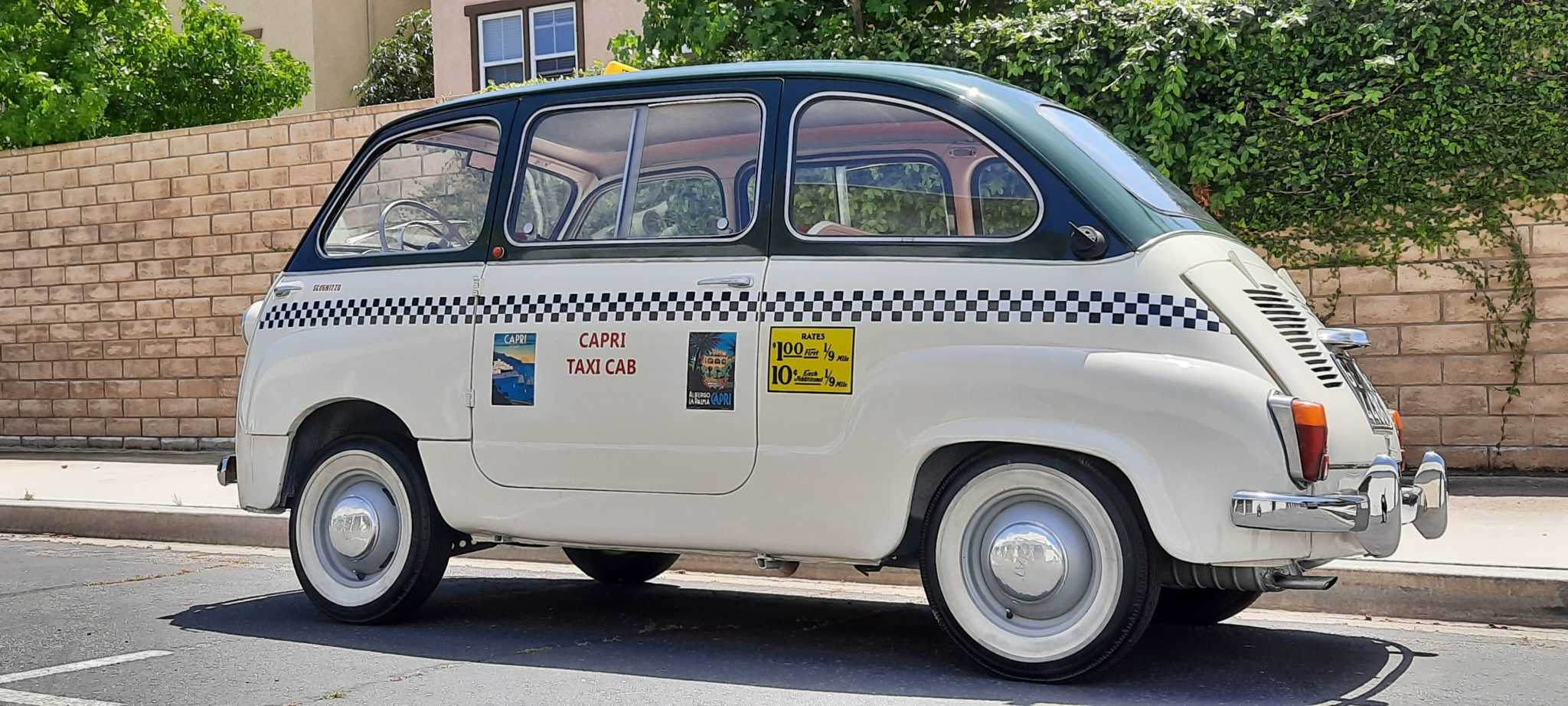 Steel 12″ wheels are finished in gray and wear polished dog-dish hubcaps and 5.20-12″ whitewall tires. The Multipla model shared its rear trailing arm suspension with other 600 models, but borrowed front suspension components from the larger Fiat 1100, featuring double wishbones, coil springs, and an anti-sway bar.