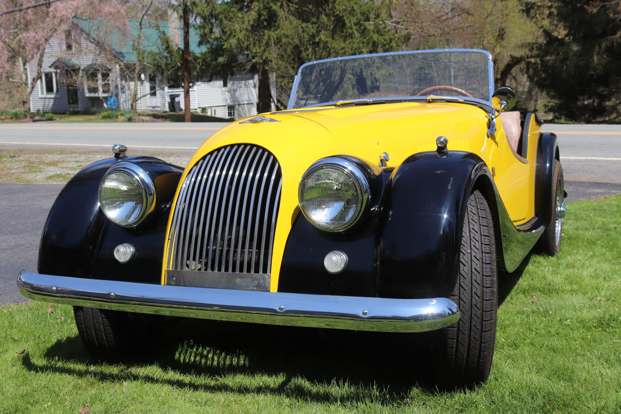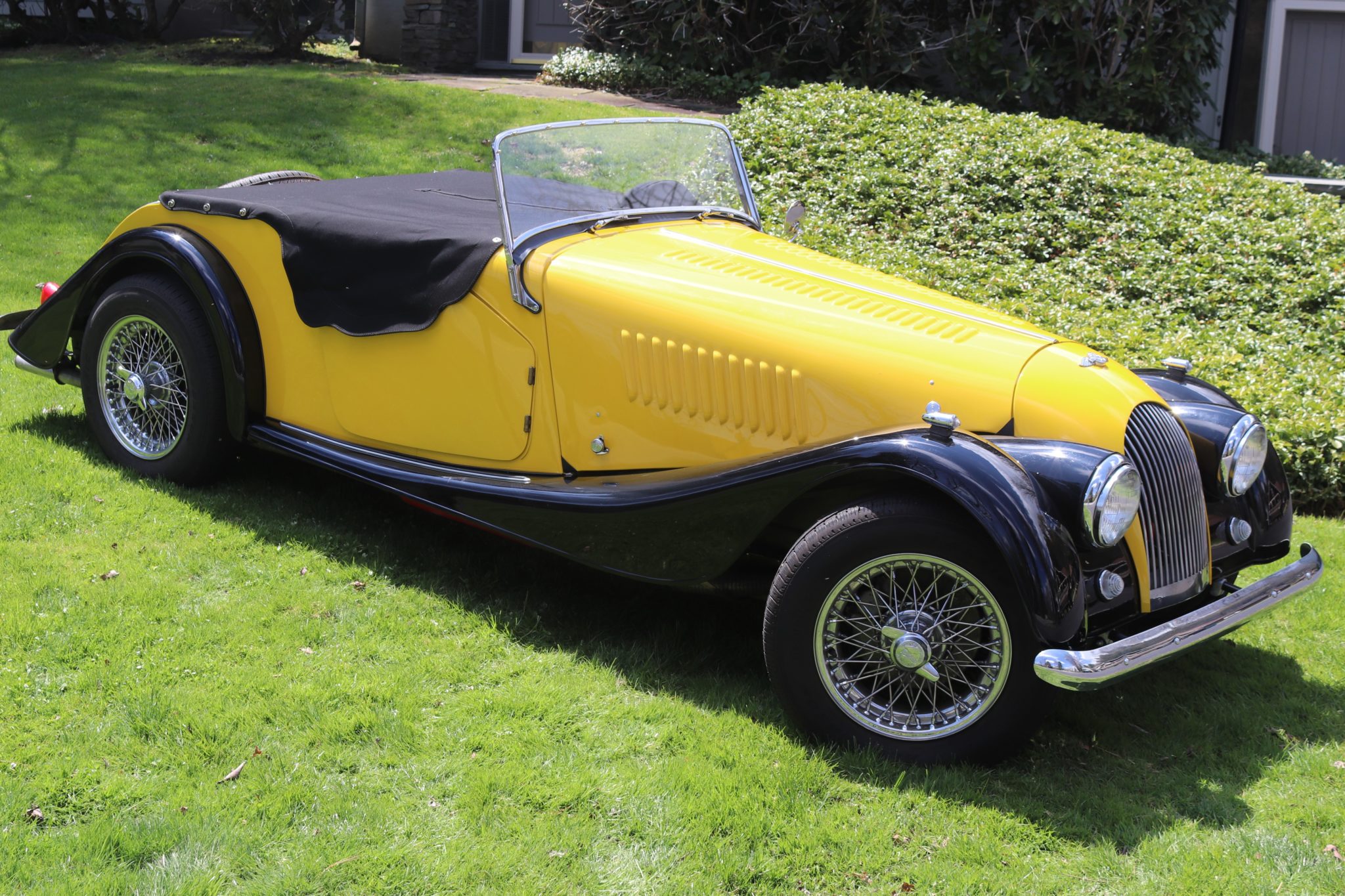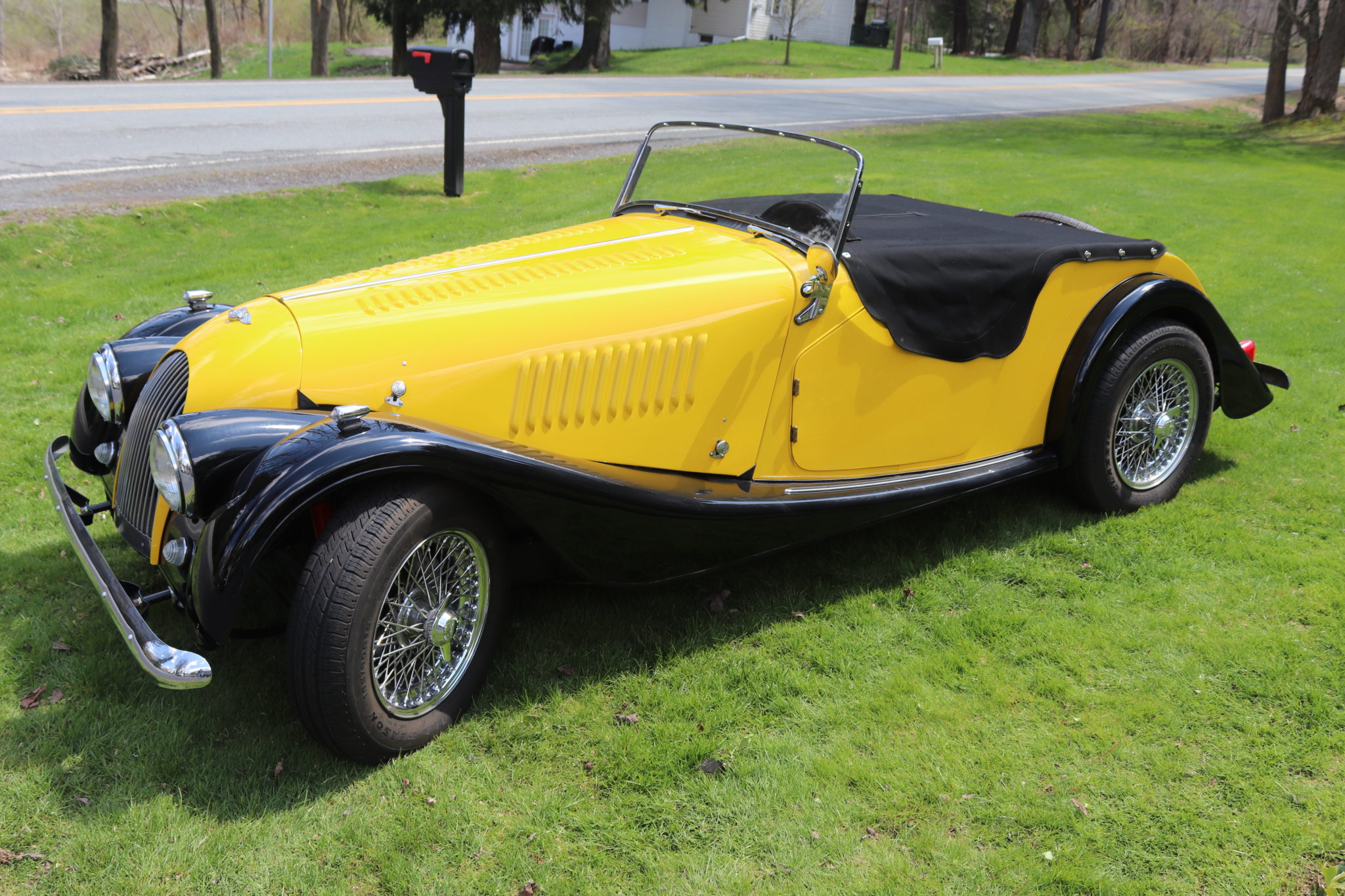 Chrome 15″ knock-off wire wheels were added during the refurbishment and wear Classic All Season tires measuring 165/80. Factory front disc brakes have been retained, while the seller has fitted front Koni shocks, stainless steel brake reaction bars, and Morgan spinners.