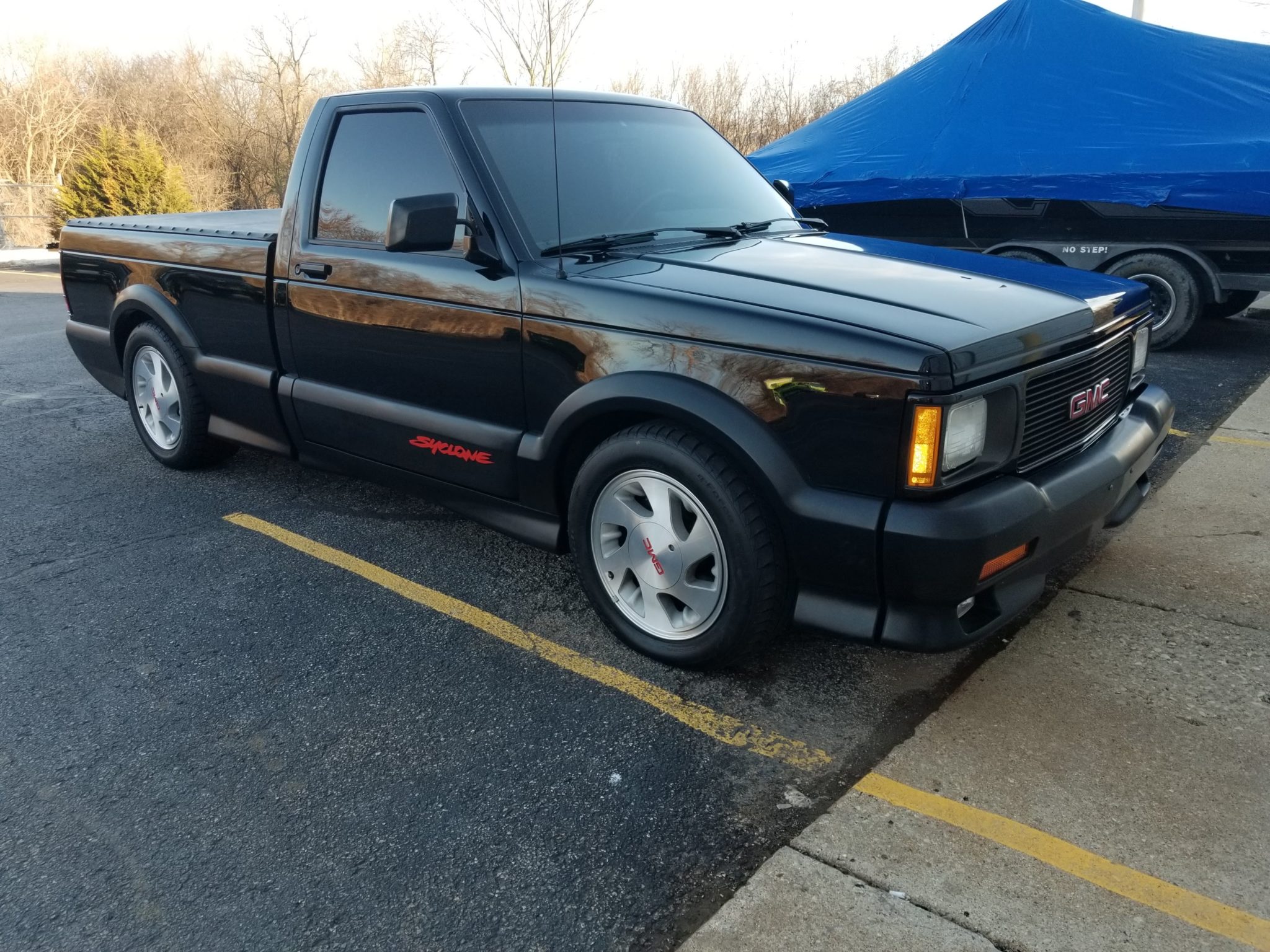 Stock 16″ wheels are wrapped in 245/50 BFGoodrich g-Force Sport COMP-2 tires. A steel spare wearing a Firestone tire is mounted under the bed. A black vinyl snap-on tonneau cover has been added, and the side and rear windows are tinted.