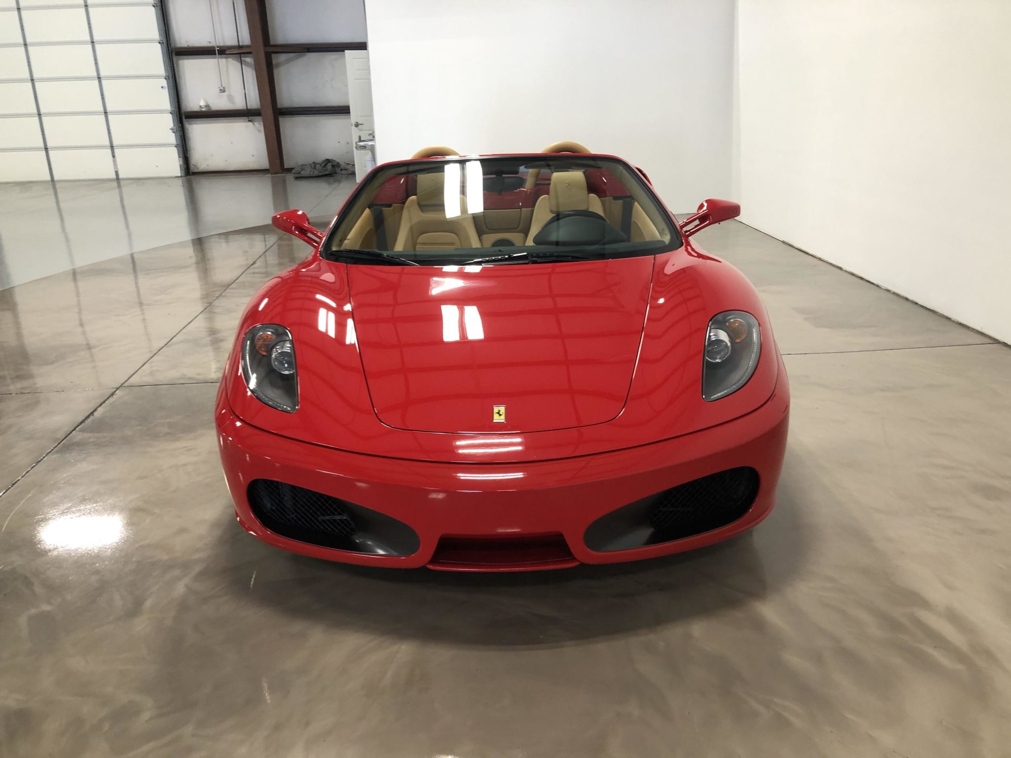 Factory 19″ split-spoke wheels are wrapped in Bridgestone Potenza RE050A tires that show 2008 date codes. The braking system utilizes optional red-painted calipers with white Ferrari decals as well as drilled and vented rotors all around.