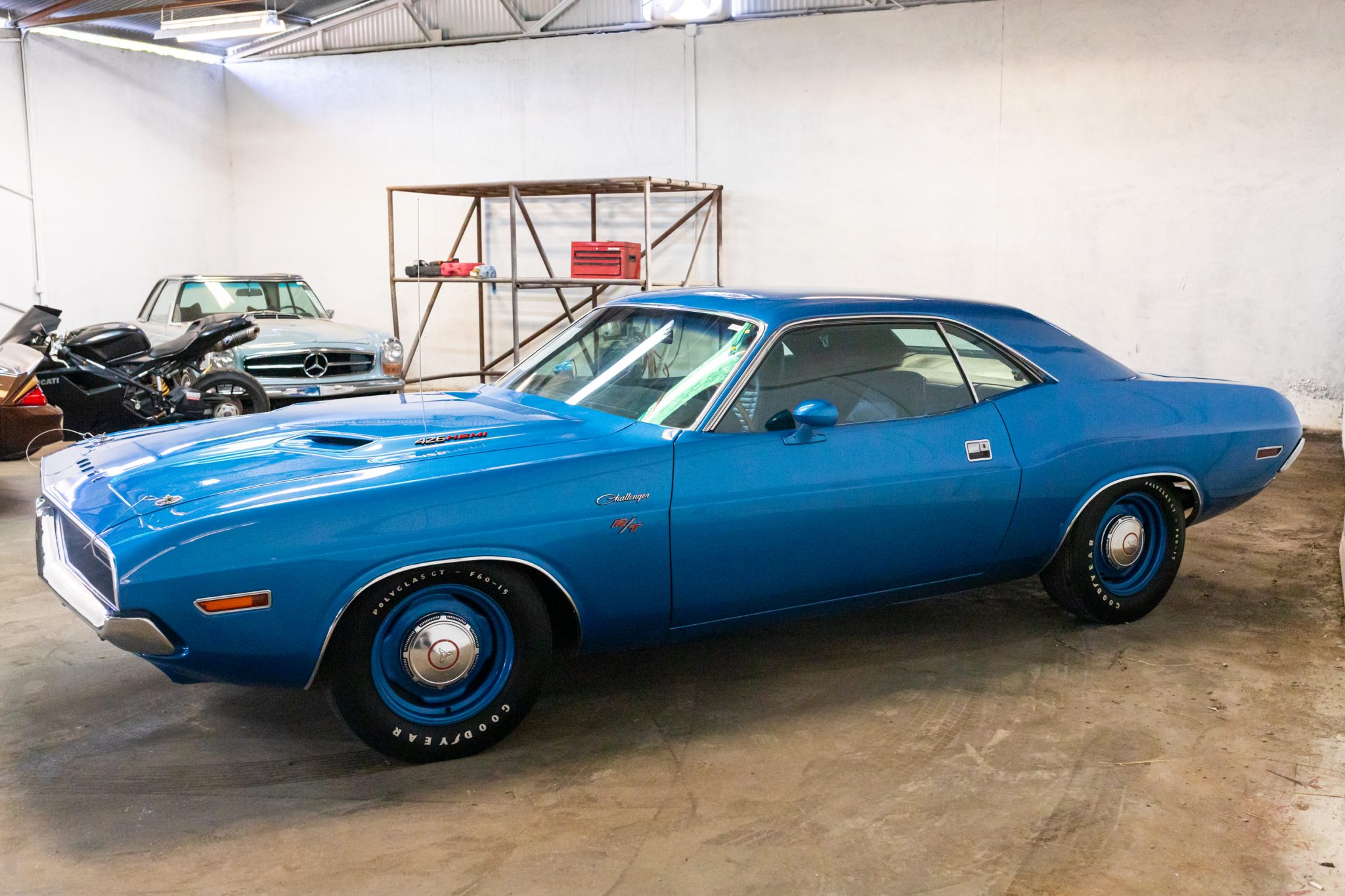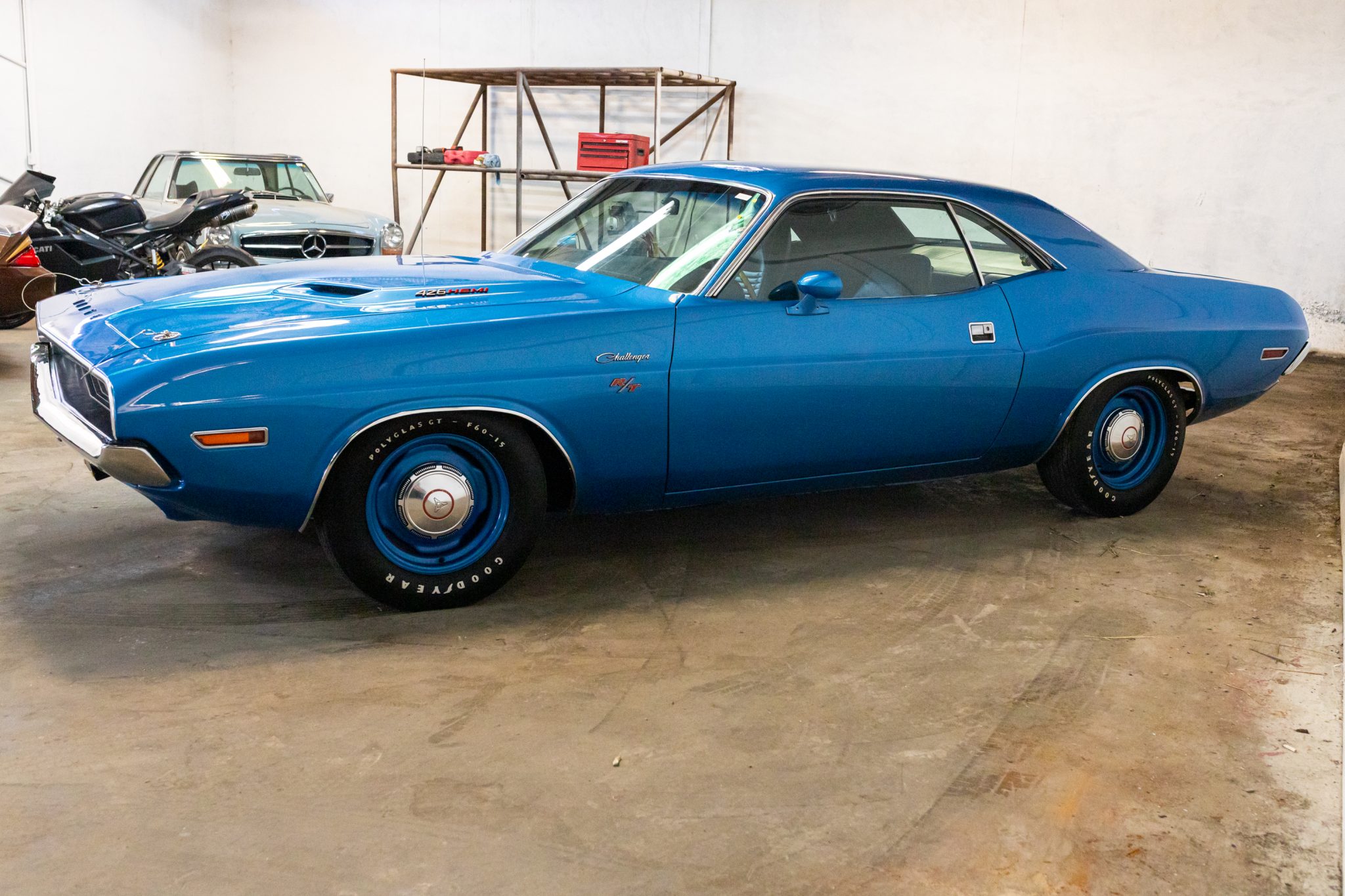 Painted 15″ steel wheels wear dog-dish hubcaps and are shod with Goodyear Polyglas GT F60 white-letter tires.