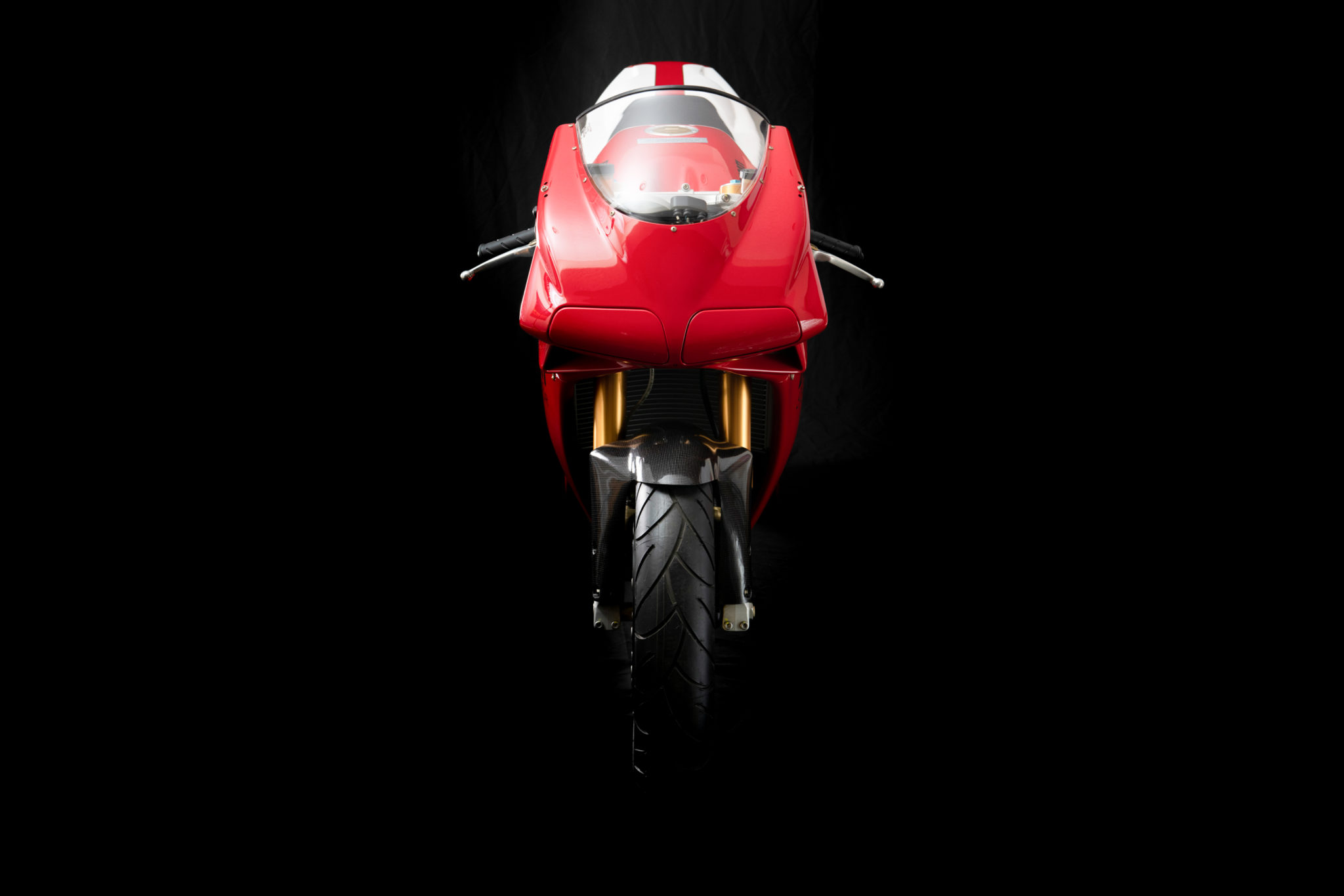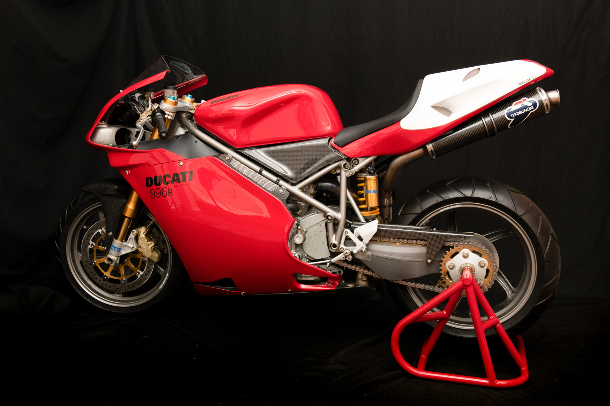 Lightweight 17″ Marchesini wheels are shared with the race bikes and are mounted with Michelin tires. Suspension is fully adjustable and includes front forks, a rear coilover, and a steering damper from Öhlins. Braking is handled by twin 320mm floating discs with four-piston Brembo calipers up front and a single 220mm disc with a two-piston caliper out back.