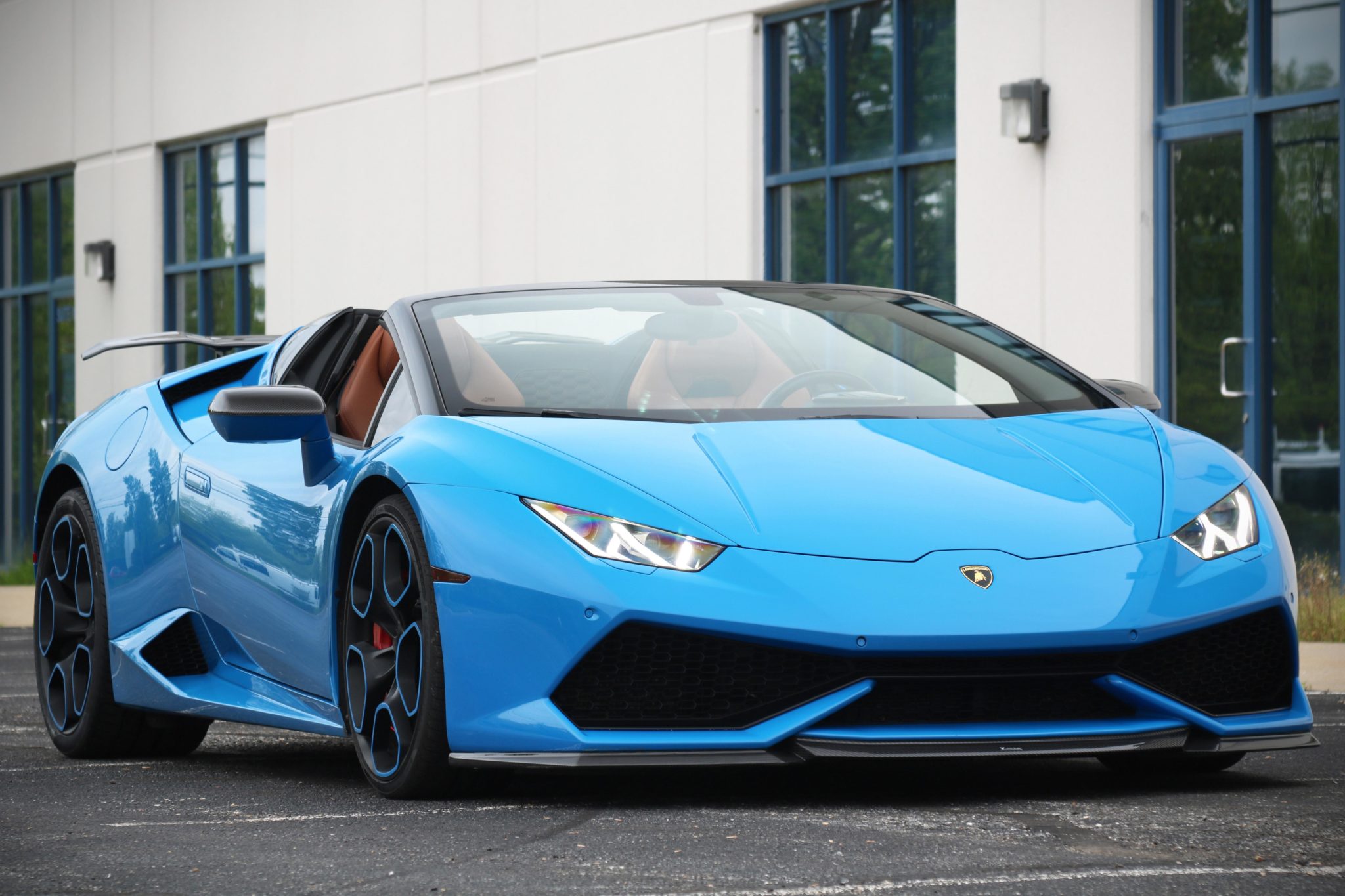 Factory 20″ wheels are finished in black with blue accents and are wrapped in Pirelli P Zero tires. The rear tires were replaced in May 2020, and a four-wheel alignment was also performed. The brake system is equipped with red-painted calipers and carbon ceramic rotors.