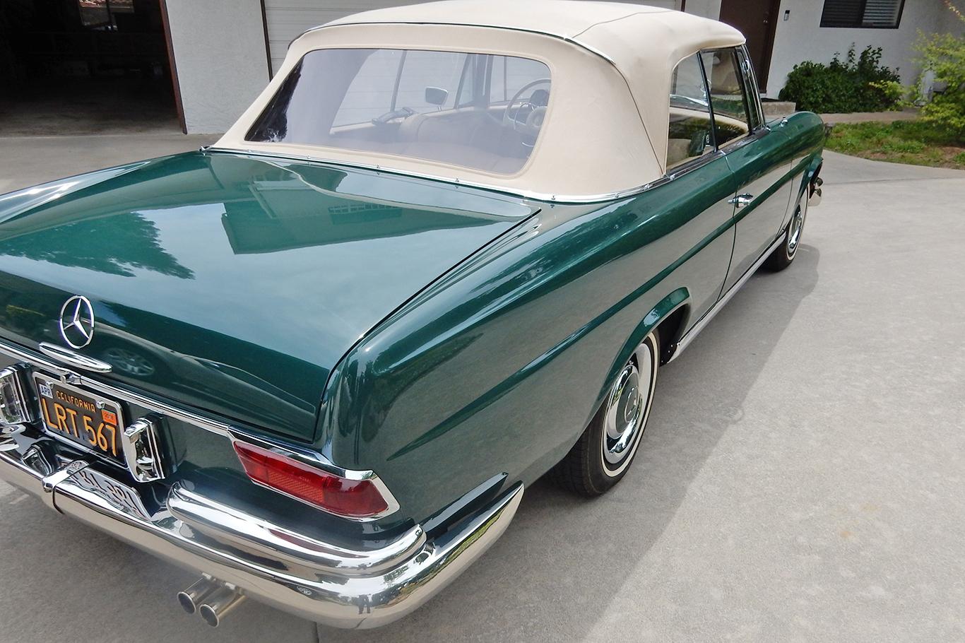 Body-colored 14” steel wheels feature matching hubcaps that were fitted during the restoration, along with chrome trim rings and Cooper Lifeliner GLS whitewall tires. New bumpers were also fitted at the front and rear, and additional brightwork was re-chromed. A java-colored German canvas convertible top was added in place of the original black top, and can be seen in the raised position in the gallery below.