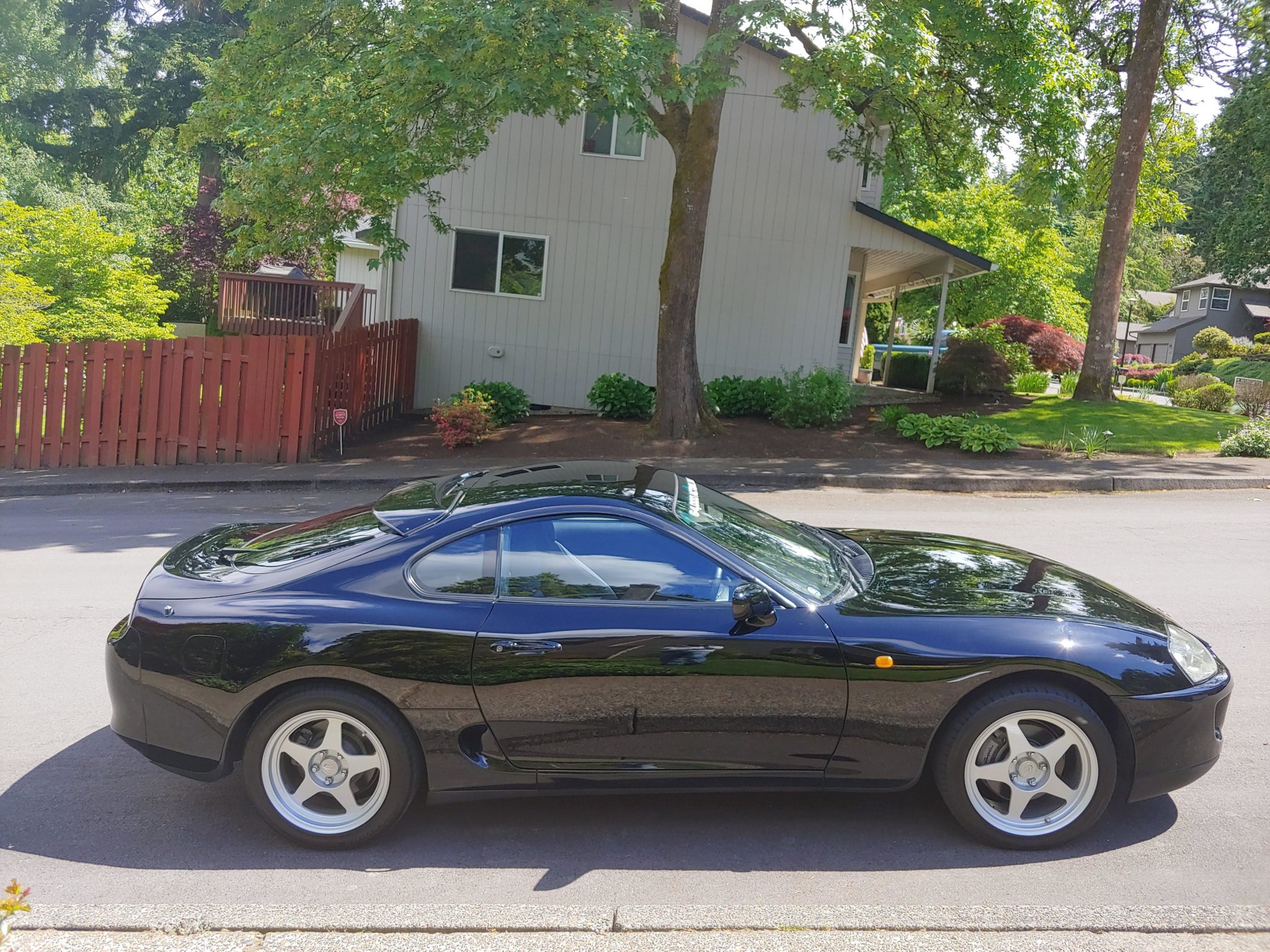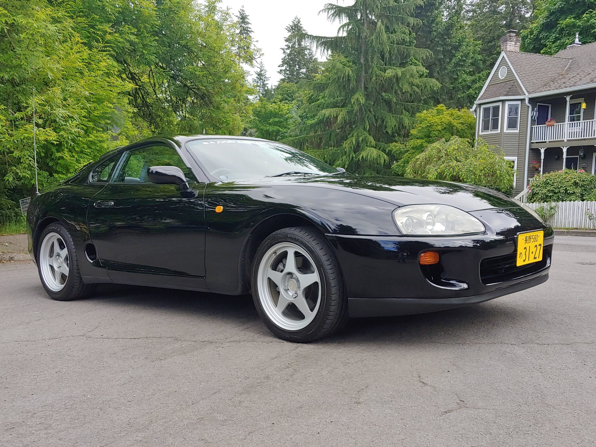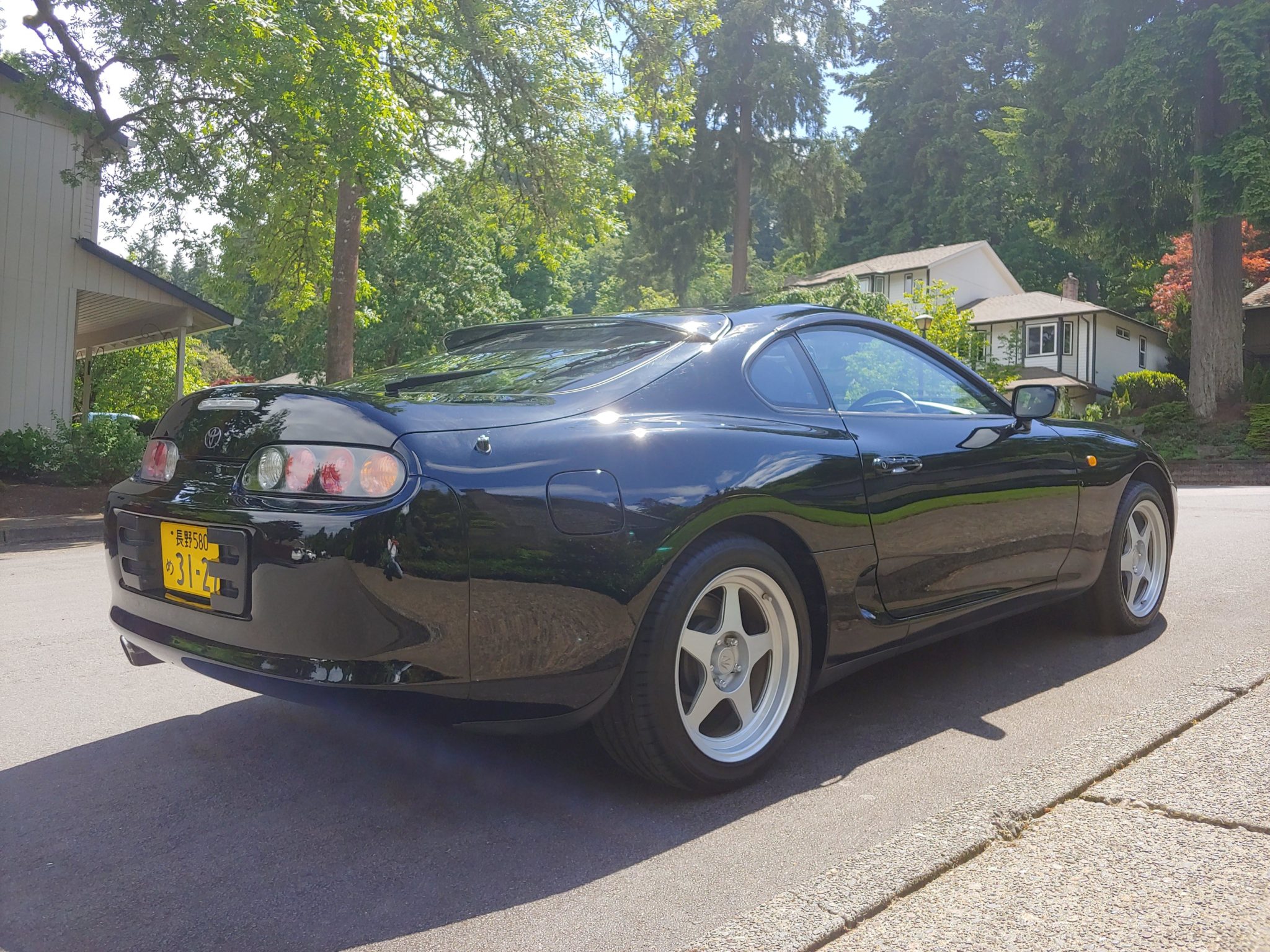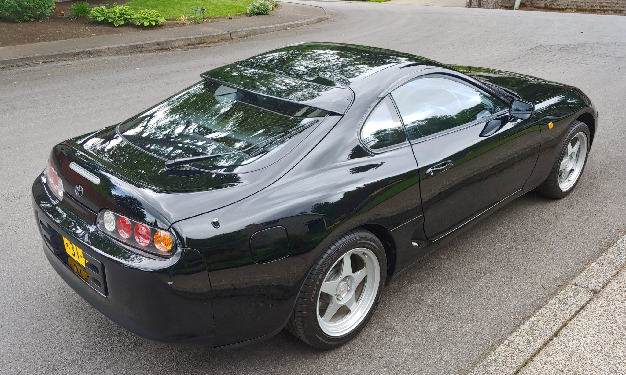 Russian-made 17″ Desmond RegaMaster wheels are mounted with Bridgestone Potenza S001 tires sized 225/45 up front and 245/45 out back. Braking is handled by gray-painted calipers, with the fronts wearing Supra logos. Four-wheel disc brakes with ABS were standard equipment.