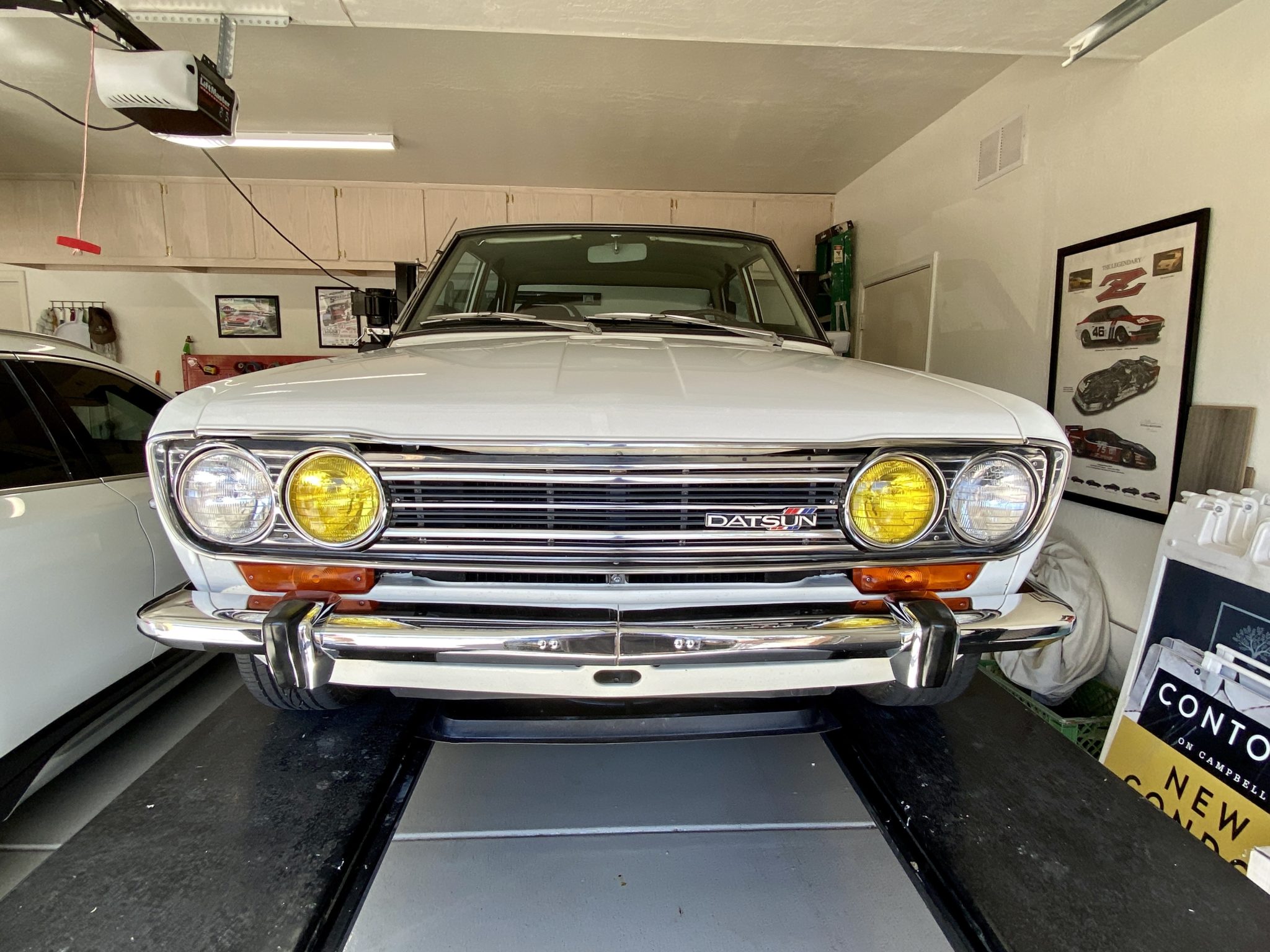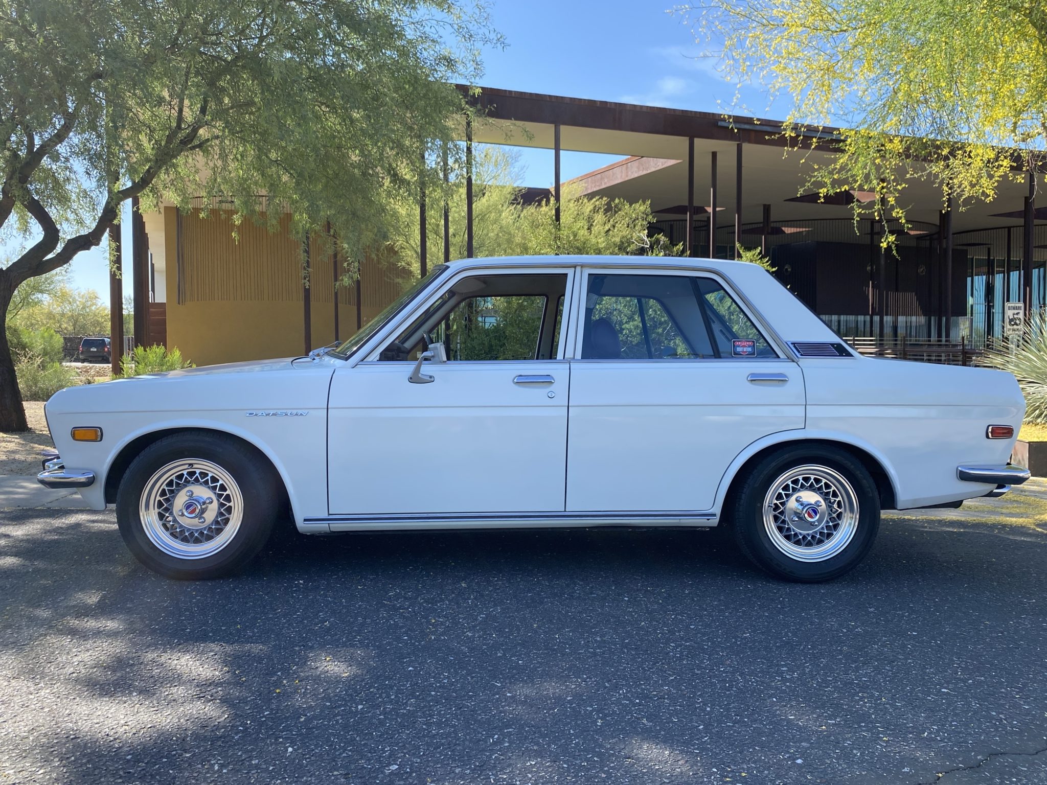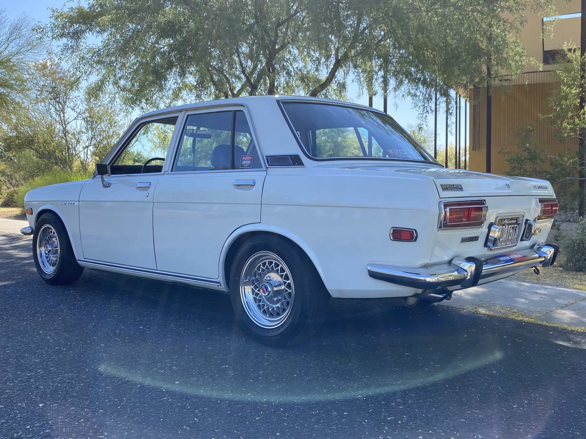 Polished 14” Appliance wheels wear Datsun center caps and are wrapped in Falken Ziex tires measuring 195/60. Tokico shocks and aftermarket springs were reportedly installed during previous ownership.