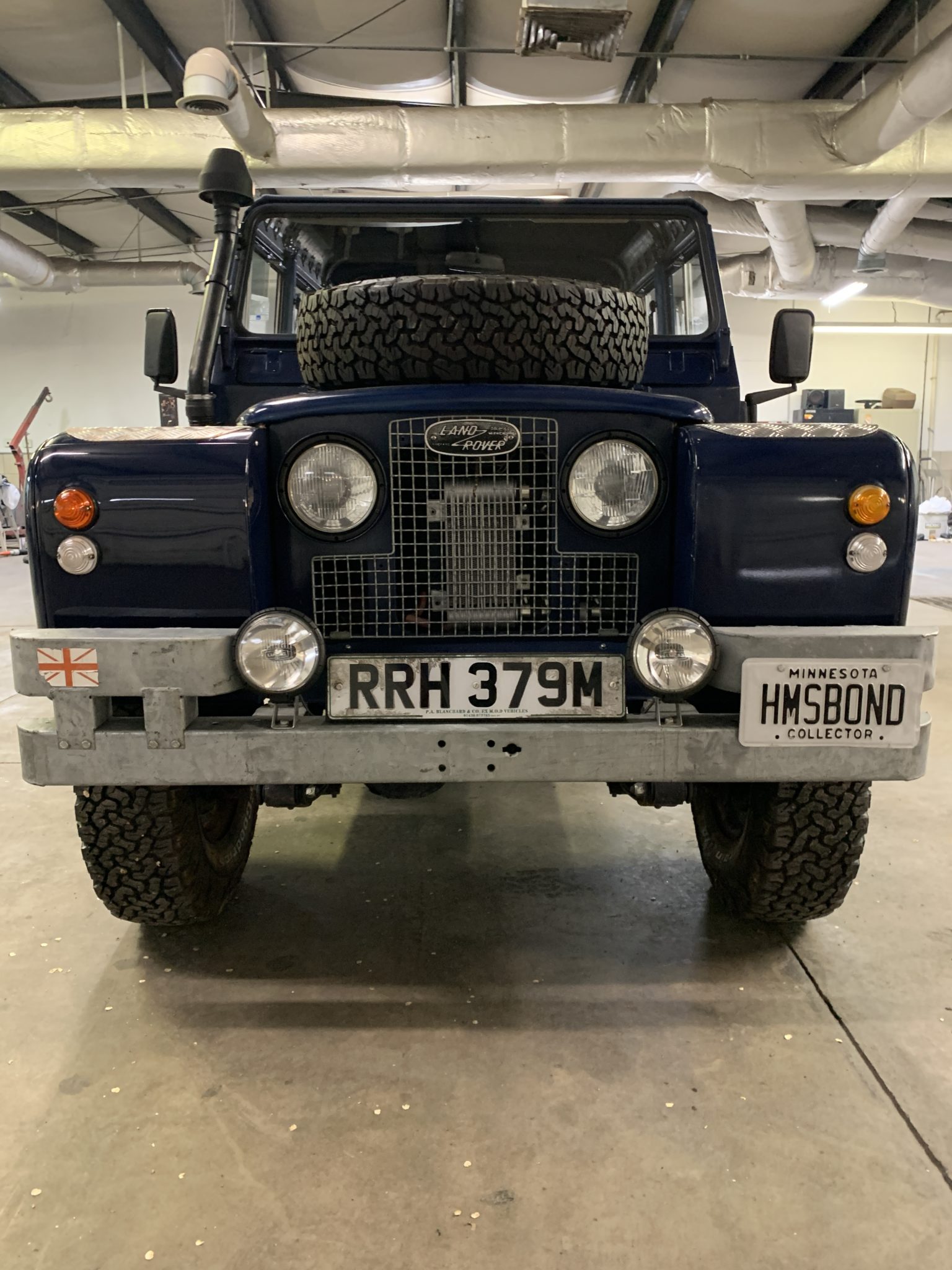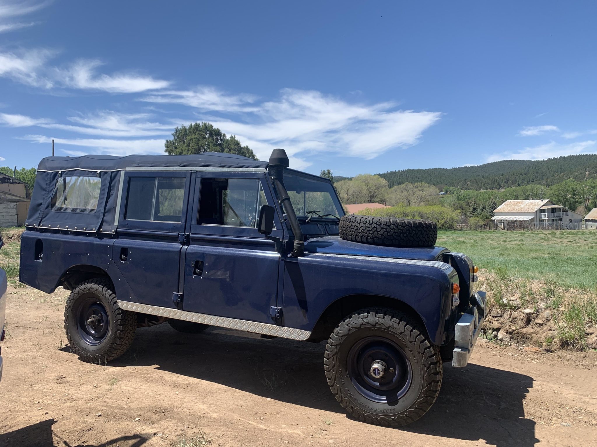 Blue 15″ steel wheels are mounted over Superwinch manually-locking hubs up front and wear BFGoodrich All-Terrain T/A KO2 tires at all four corners. A matching spare is affixed to the hood.