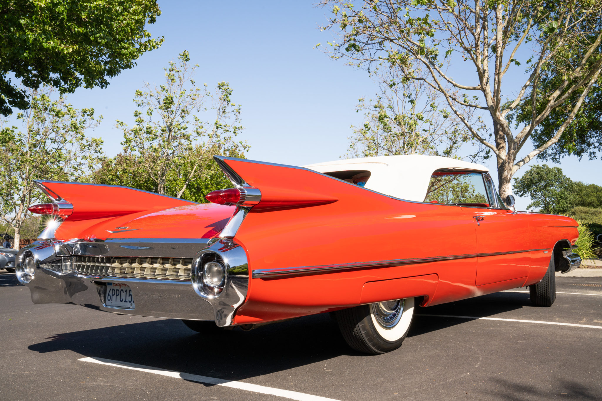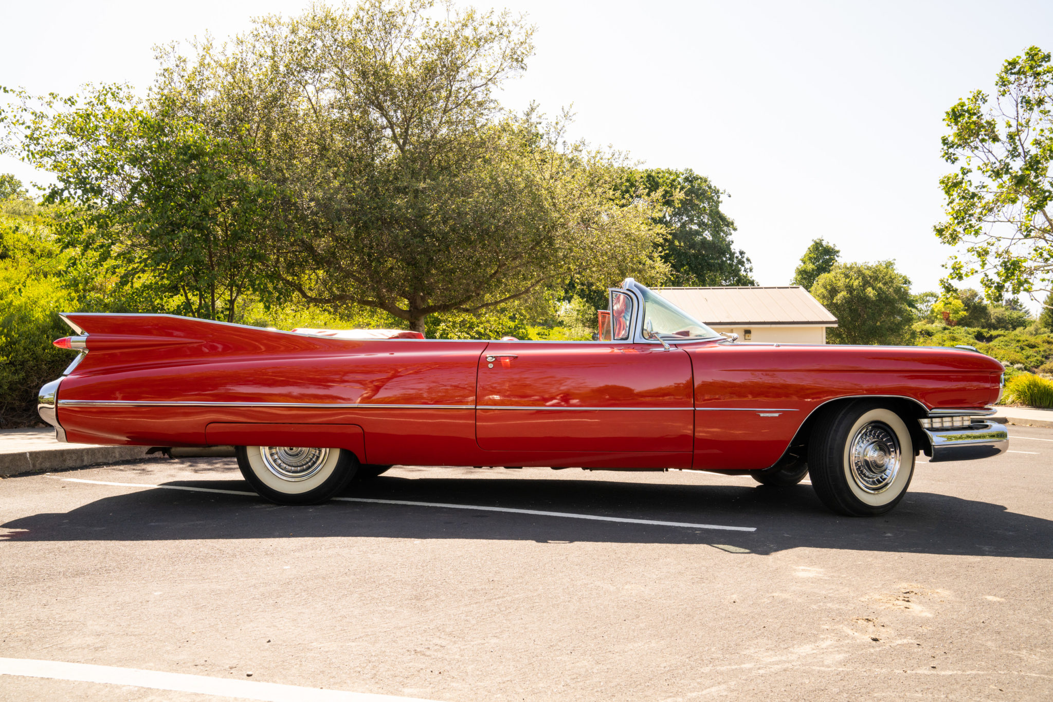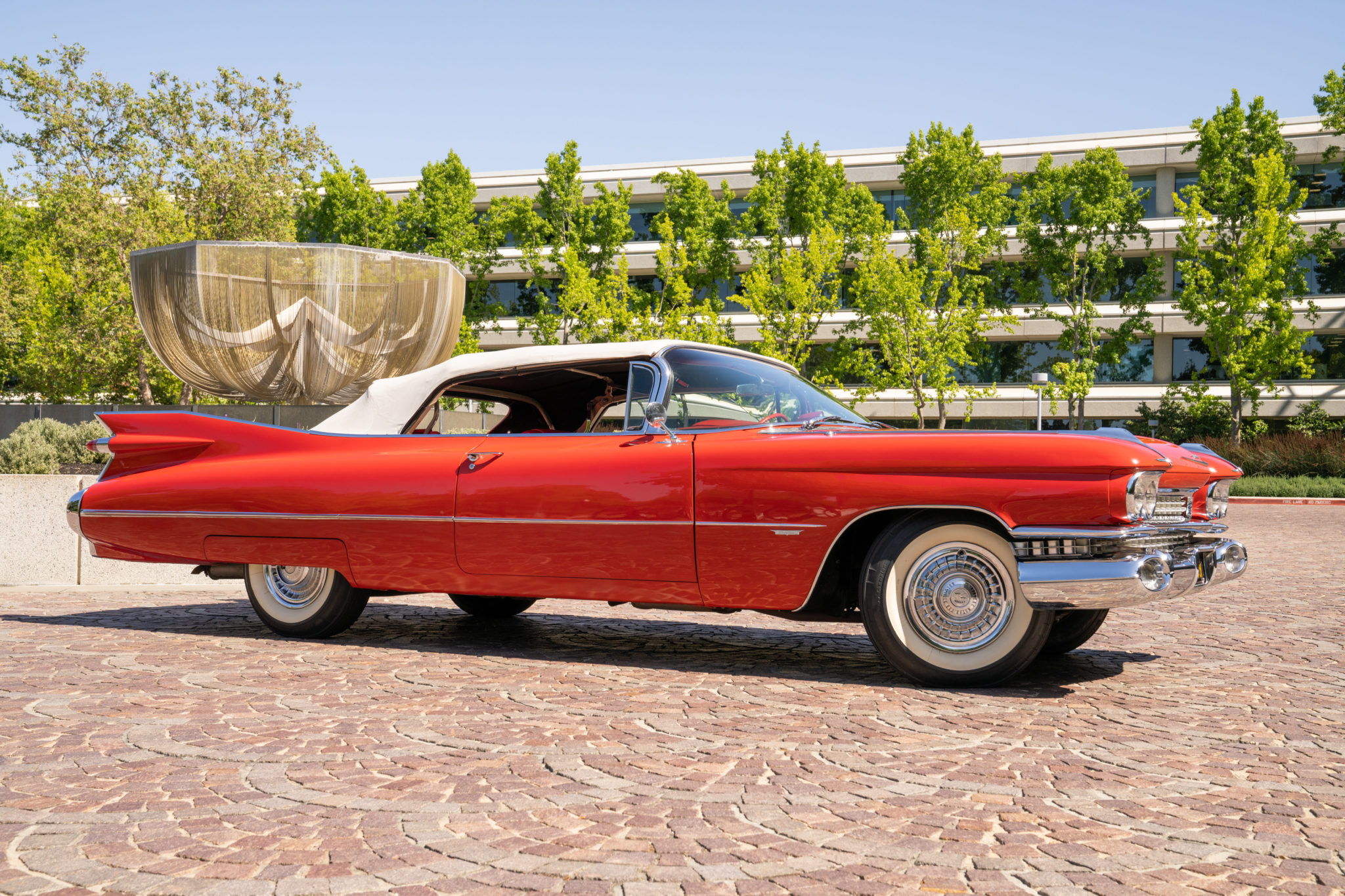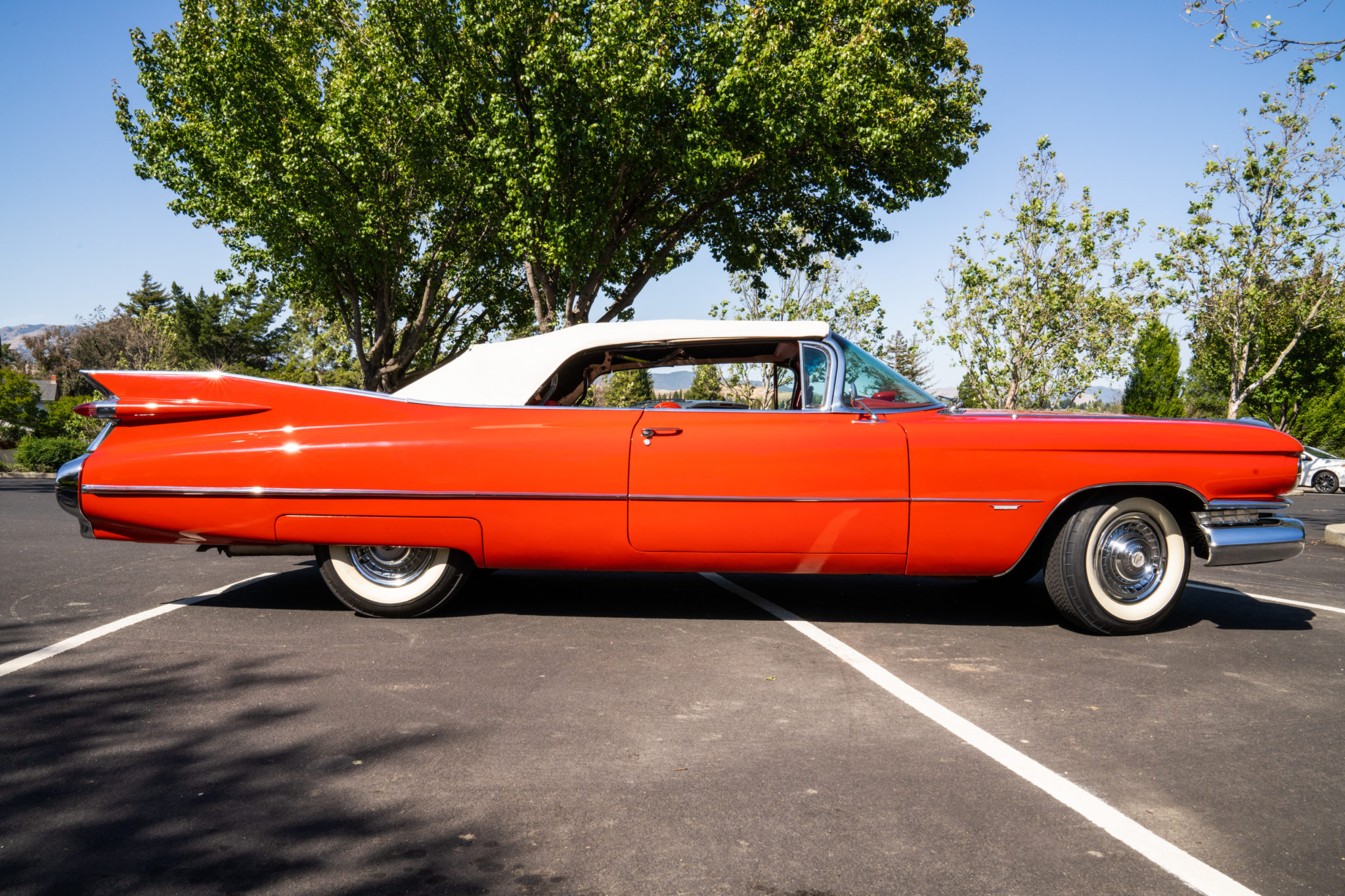 The electrically-operated white soft top features a zip-down rear window and can be seen in both its raised and lowered positions. Steel 15″ wheels wear chrome covers and Firestone wide-whitewall bias-ply tires. Power-assisted steering and four-wheel drum brakes were standard features. Approximately 10” of the rear window stitching is separated from the zipper closure according to the seller.