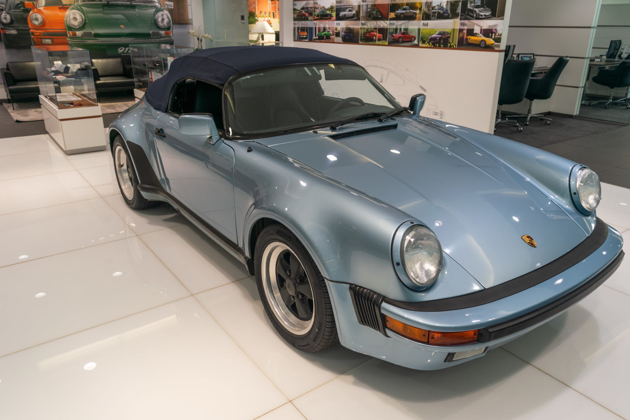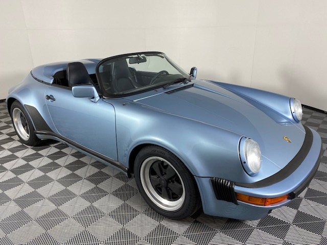 Staggered-width 16″ Fuchs wheels wear Pirelli N Specification tires that were fitted in December 2019. Suspension and brakes are shared with the contemporary Turbo model, and new shocks were installed in 2020. A body-colored, double-bubble fiberglass hard cover conceals the dark blue soft top when it is folded.