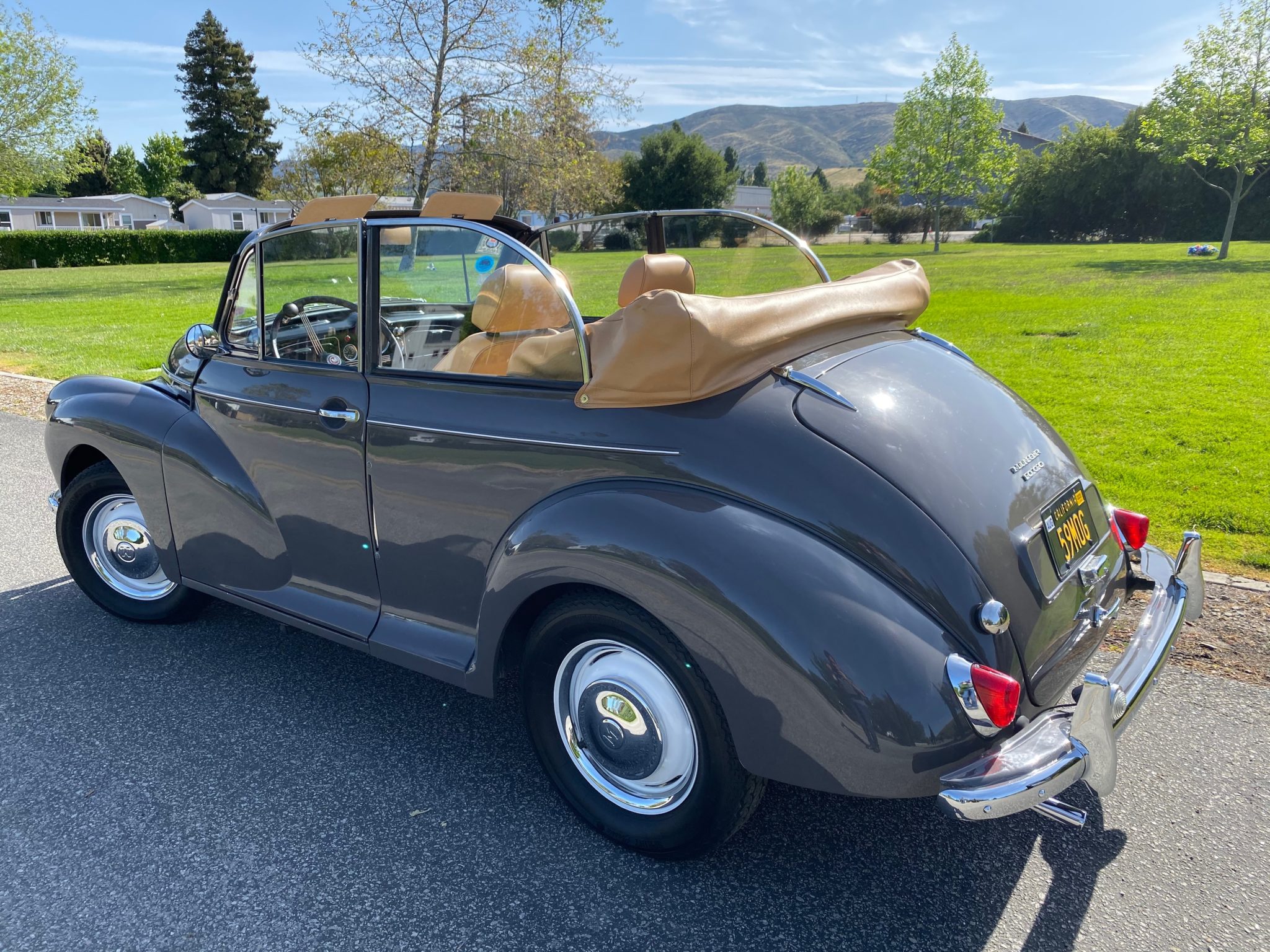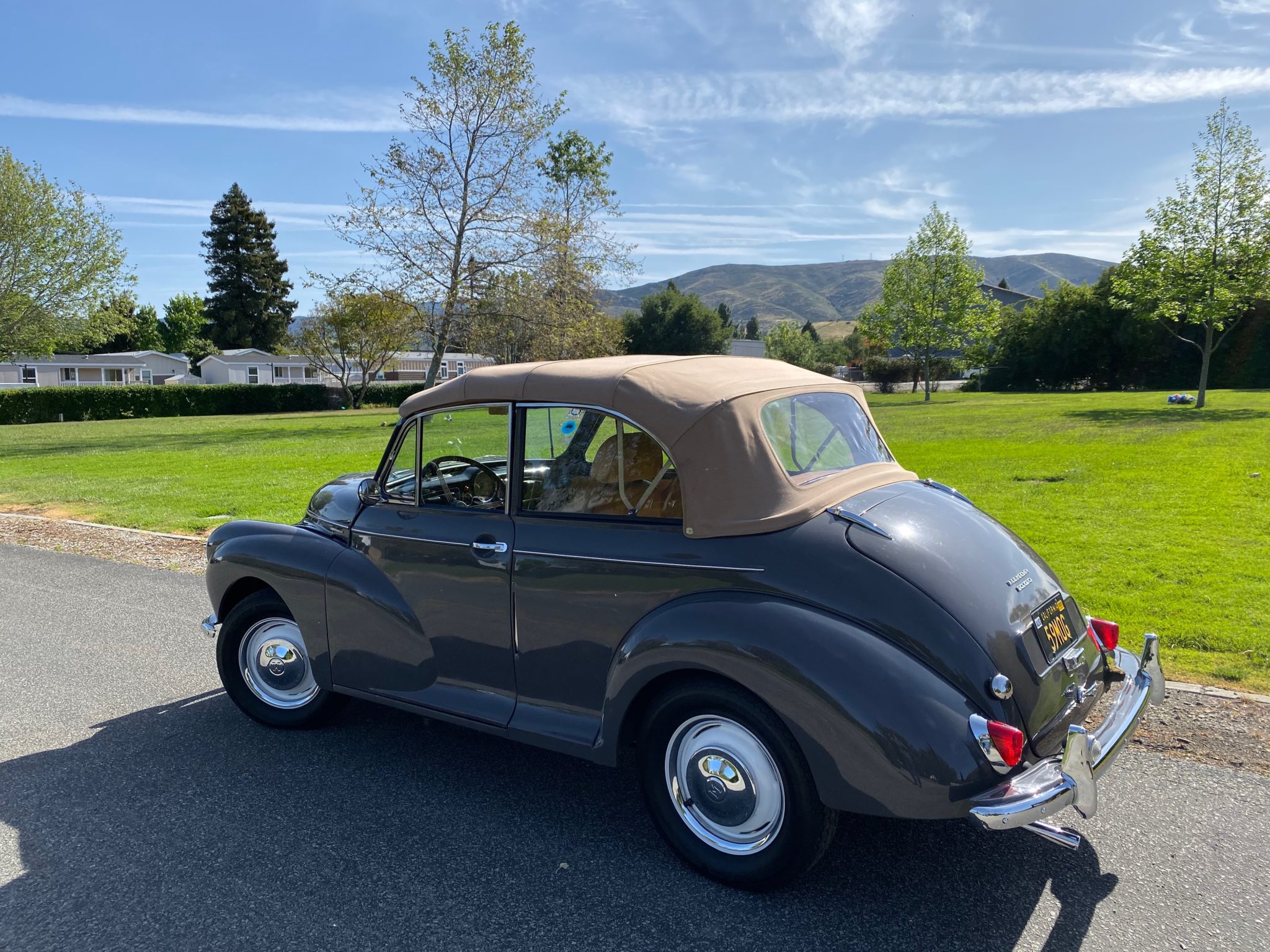 Powder-coated 14″ steel wheels with chrome hubcaps and trim rings wear Vredestein Sprint Classic tires showing 2010 date codes. The wheel cylinders and brake shoes were reportedly changed 5k miles ago, and the steering and suspension components were lubricated more recently. A front sway bar has also been installed along with replacement rear leaf spring shackles, pins, and polyurethane bushings.