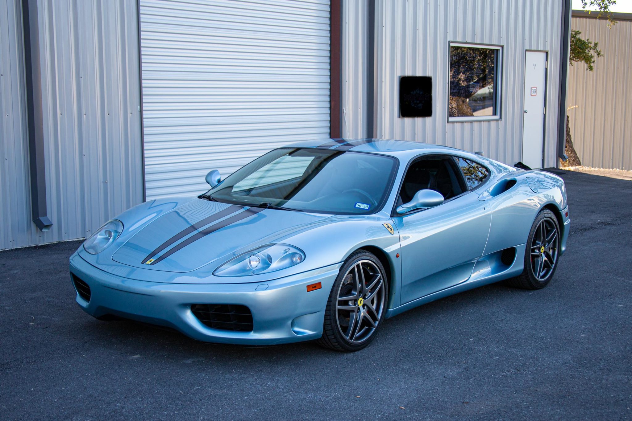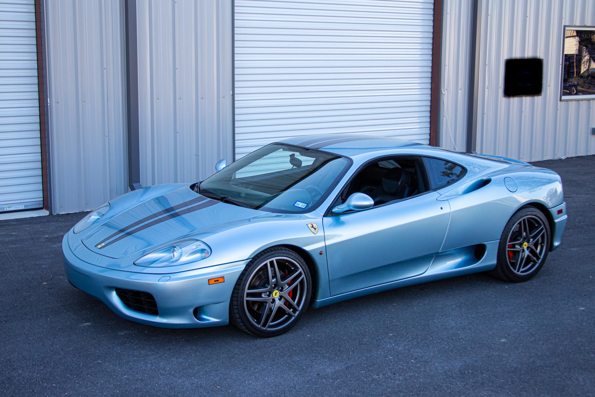 Factory alloys are replaced by 19″ F430 wheels wrapped in Michelin Pilot Sport A/S 3+ tires. Red brake calipers are paired with cross-drilled rotors at each corner, and the seller states a brake service has been performed within the last 500 kilometers.