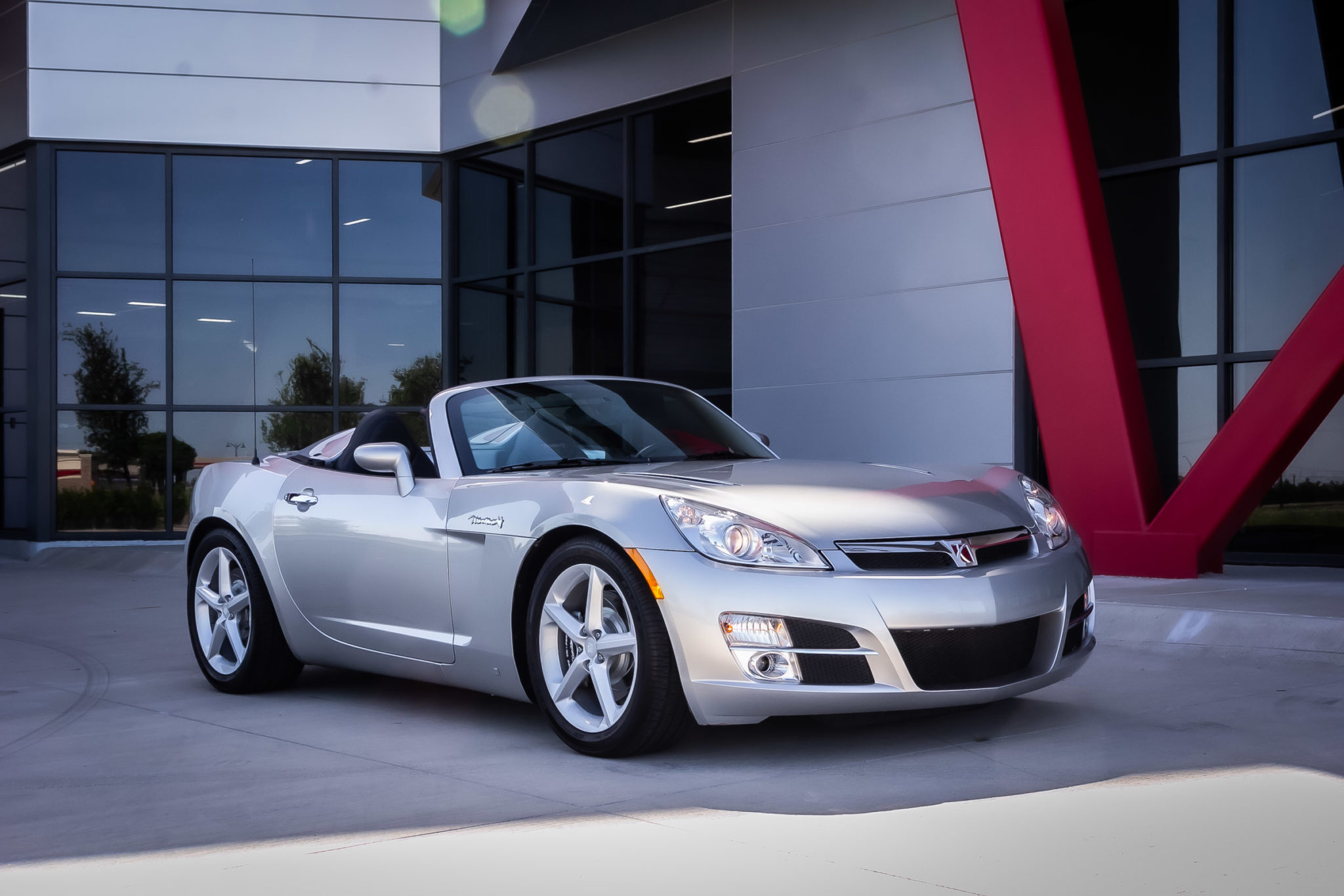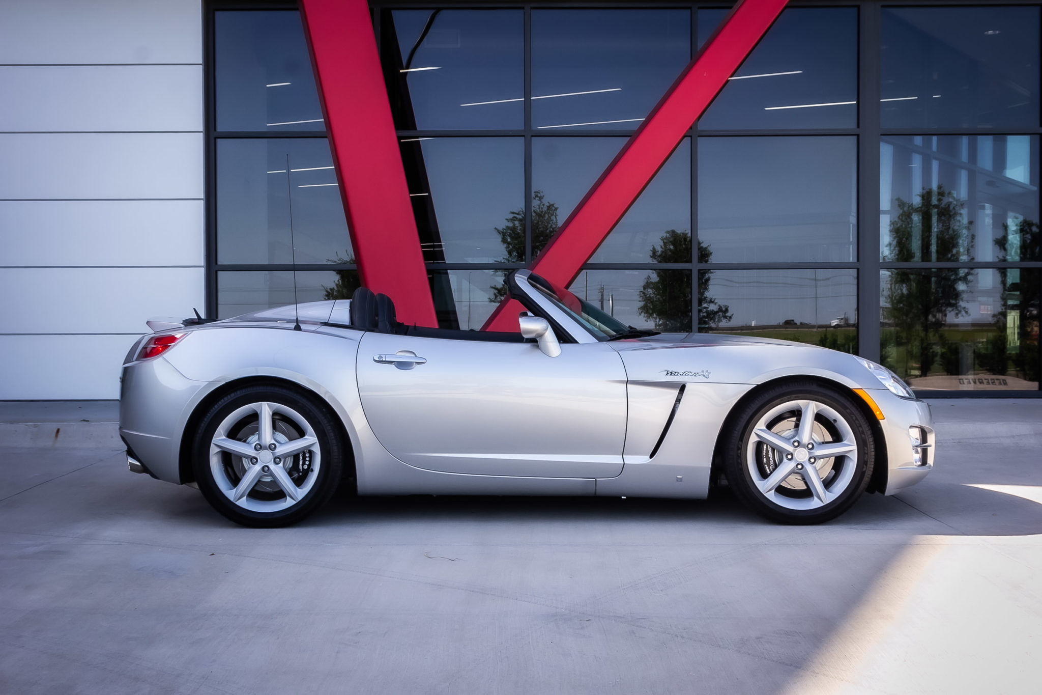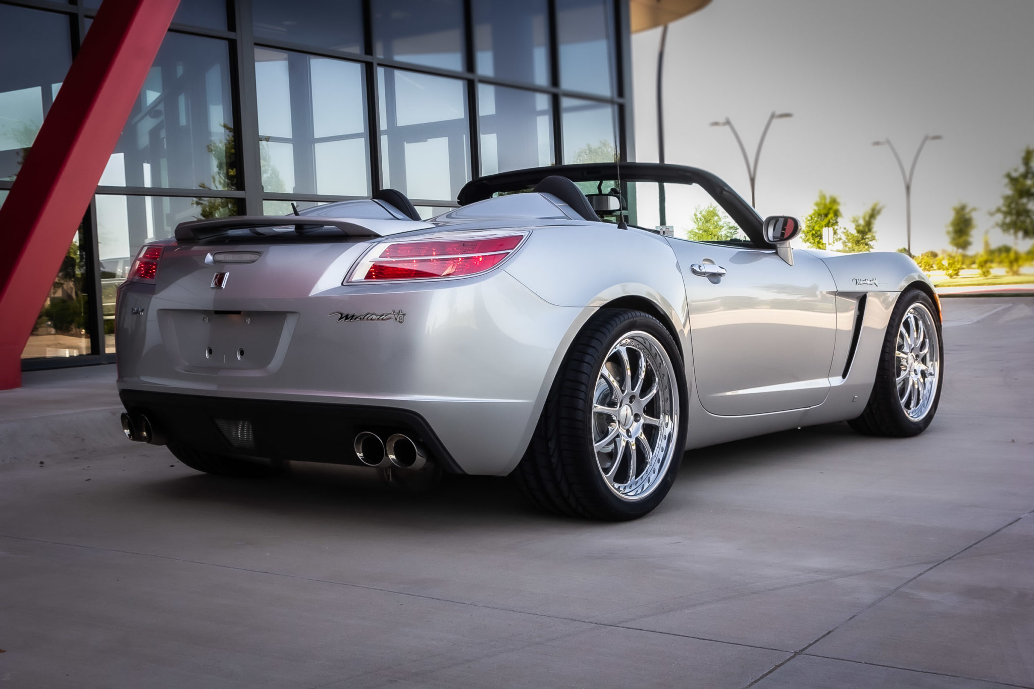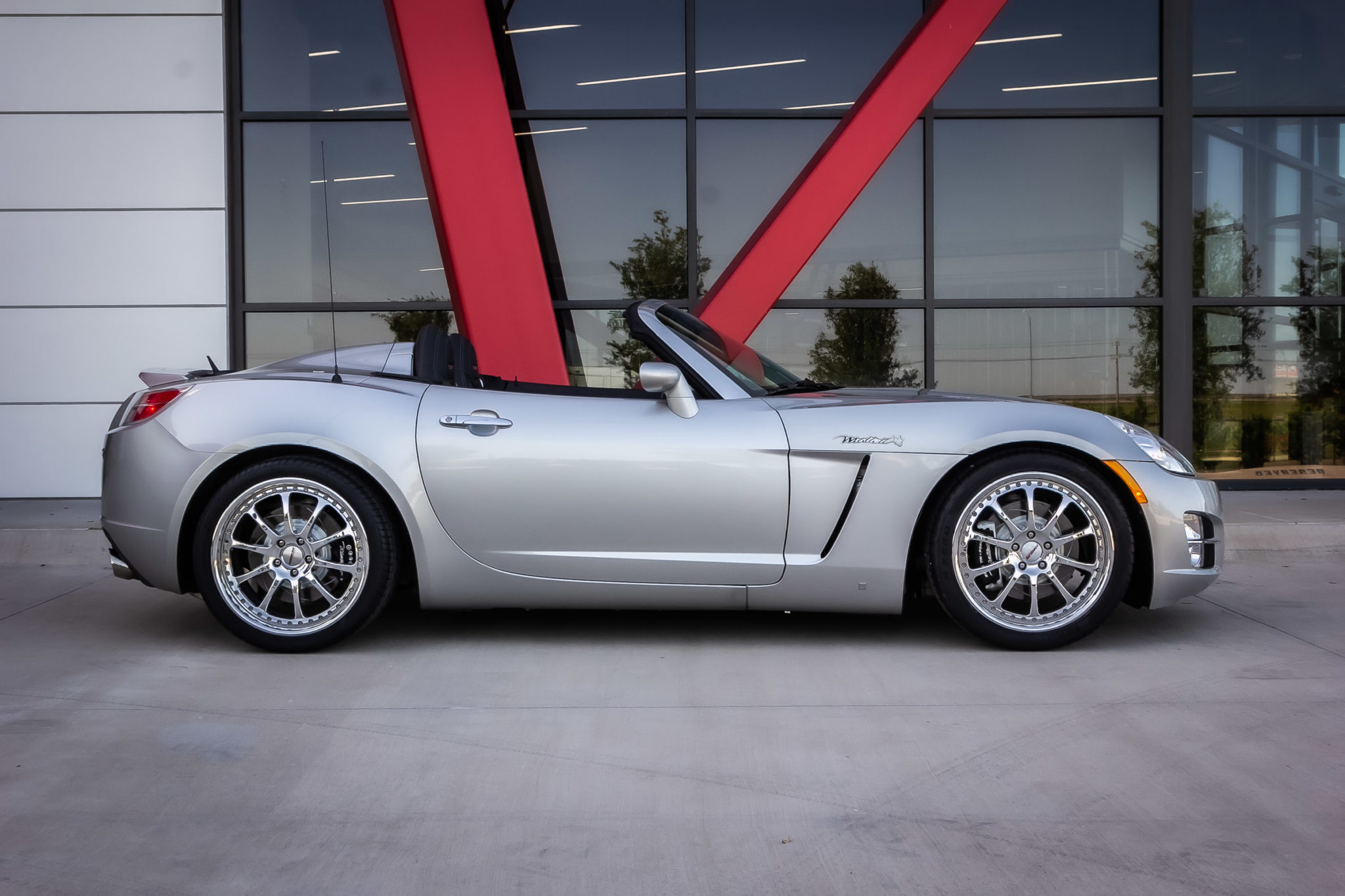 Chrome 19″ multi-piece Forgeline wheels are mounted with Pirelli P Zero tires, and painted Saturn wheels wearing Goodyear RS-A rubber are also included in the sale. Suspension modifications performed by Mallett included performance shocks and springs as well as polyurethane rear control arm and differential mount bushings. Stopping power is from a Mallett Big Brake kit featuring black calipers and slotted rotors.