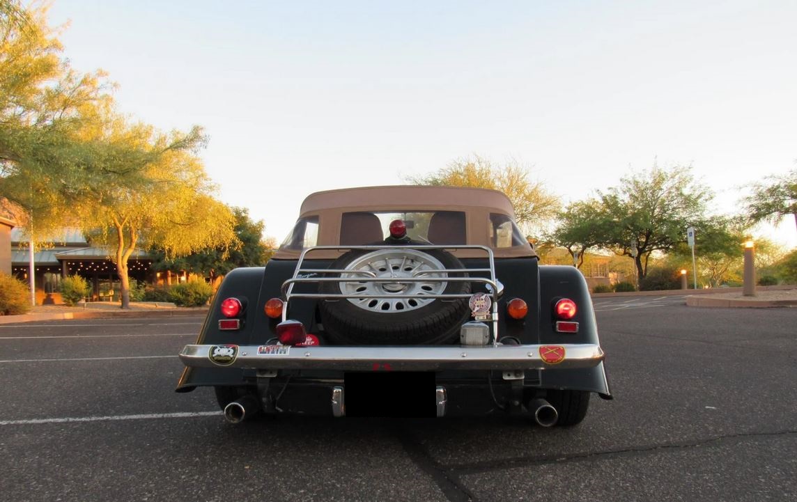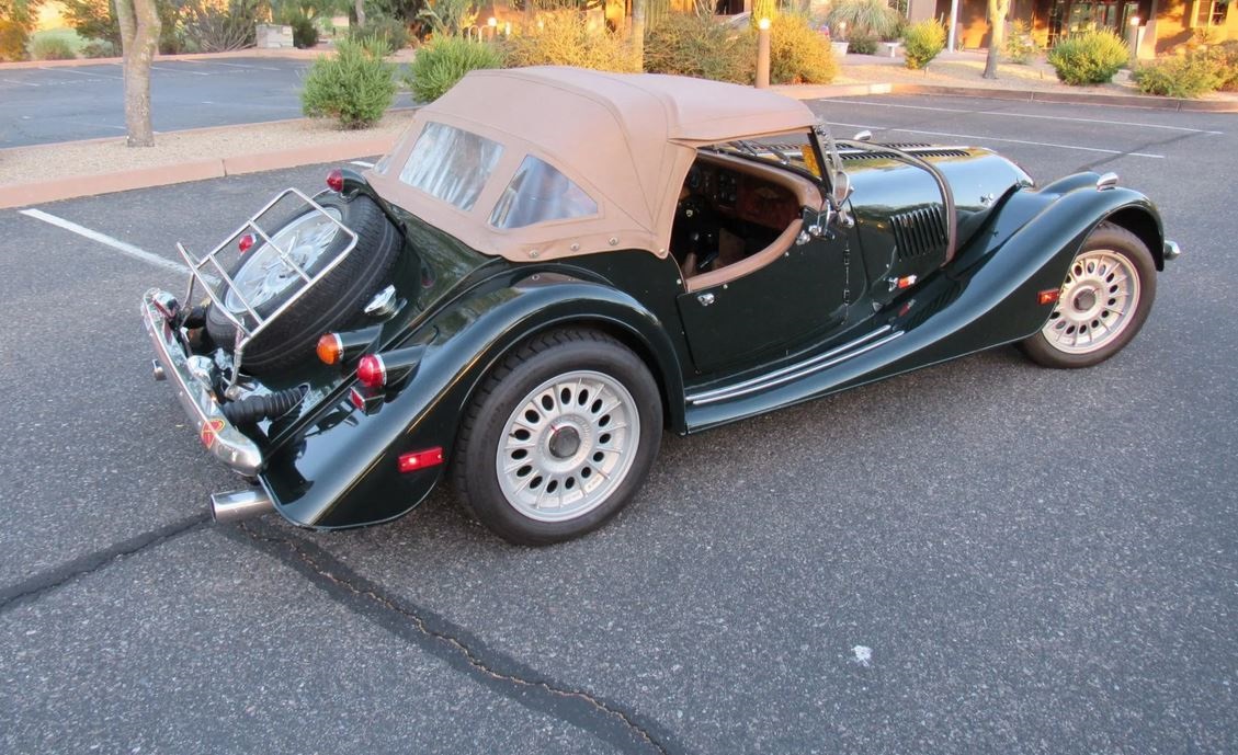 A tan factory soft top and side curtains with sliding windows are included in the sale along with the custom-made green Bimini sun top seen in the gallery. Center-lock 16″ alloy wheels were ordered by the seller and are mounted with BFGoodrich g-Force Sport Comp 2 tires, with a matching spare fitted out back. Five factory chrome wire wheels with Pirelli rubber are also included in the sale.