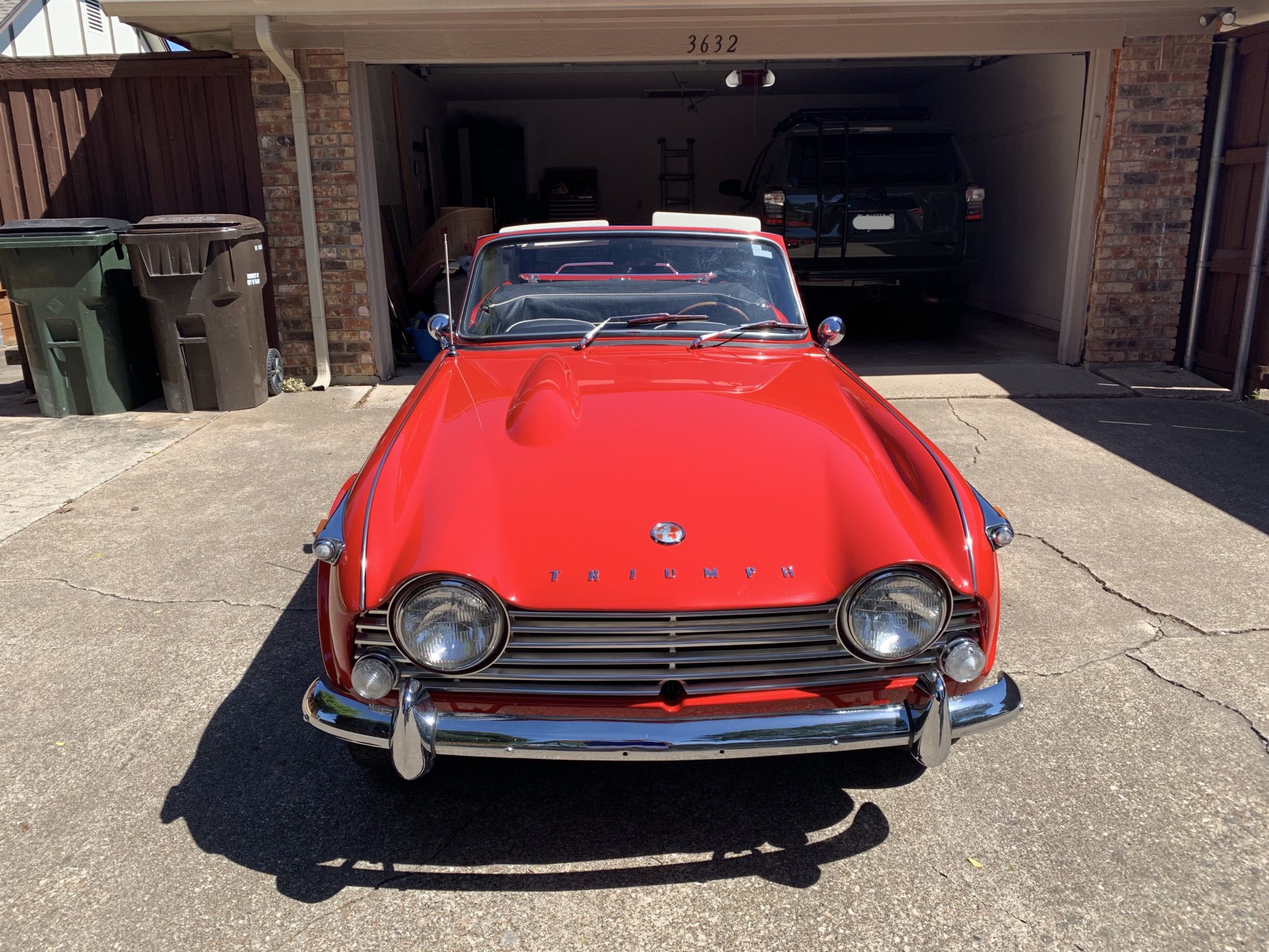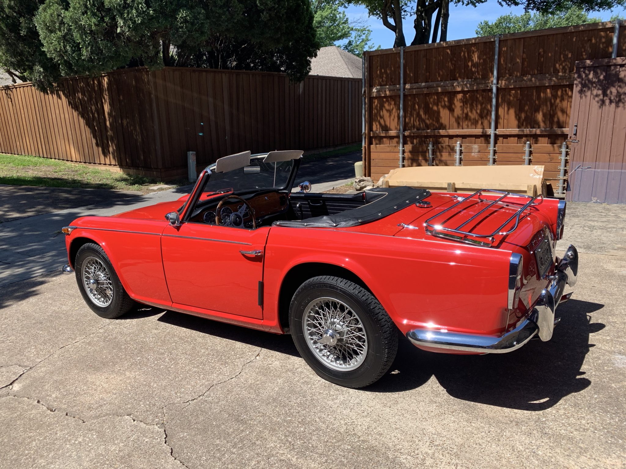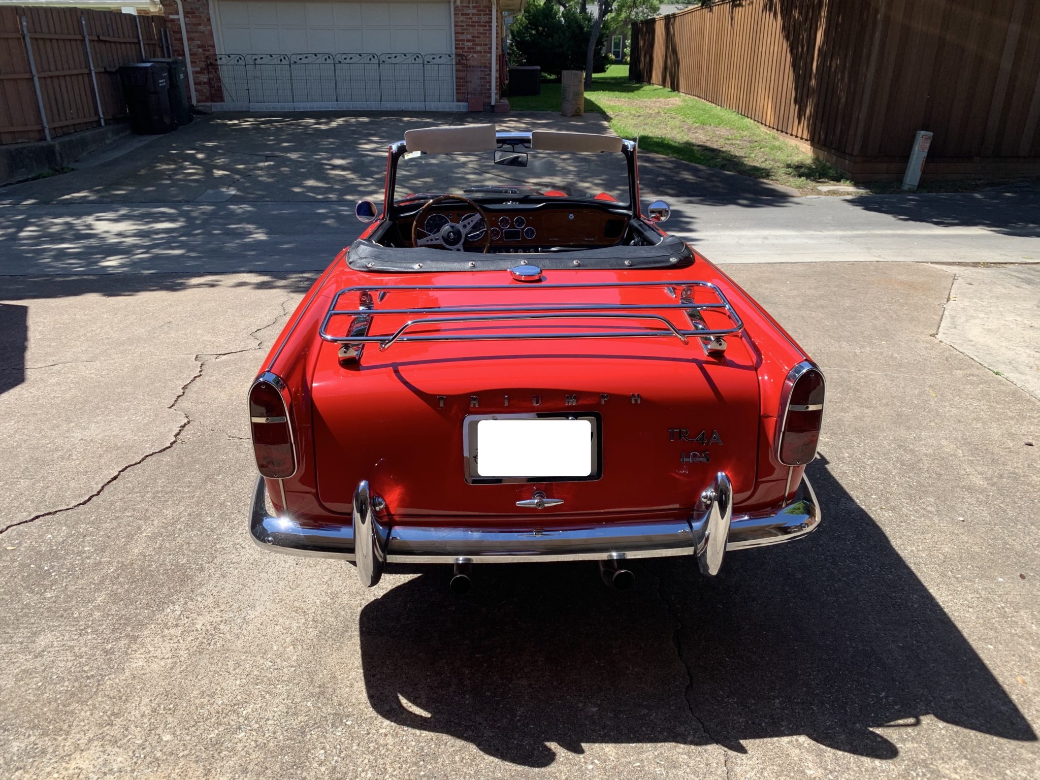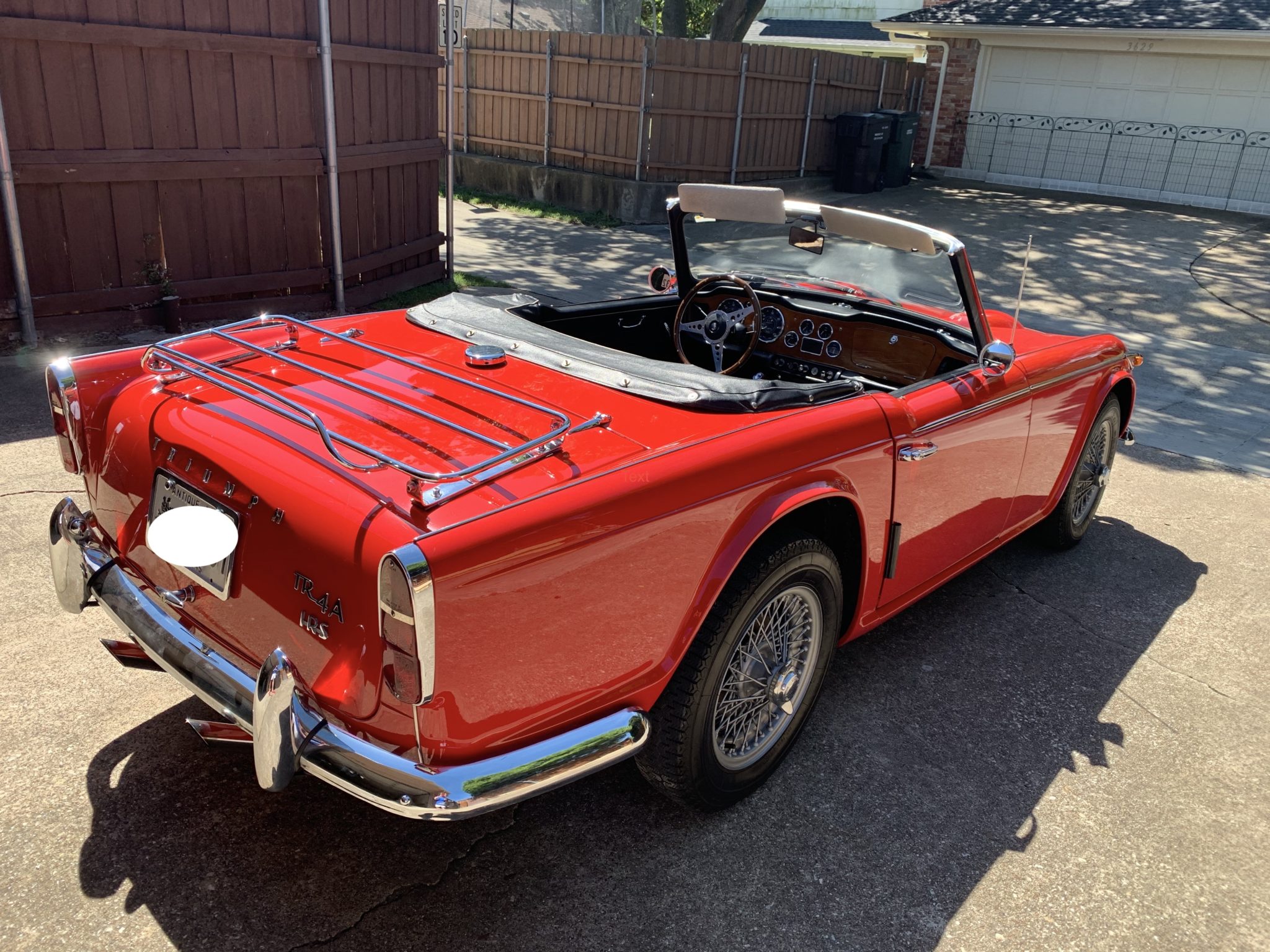Painted wire wheels fitted with chrome knock-offs are wrapped in Michelin XZX tires. This TR4A is equipped with an independent rear suspension, as denoted by the IRS badging on the rear of the car, and the suspension reportedly has been overhauled during the selling family’s ownership.