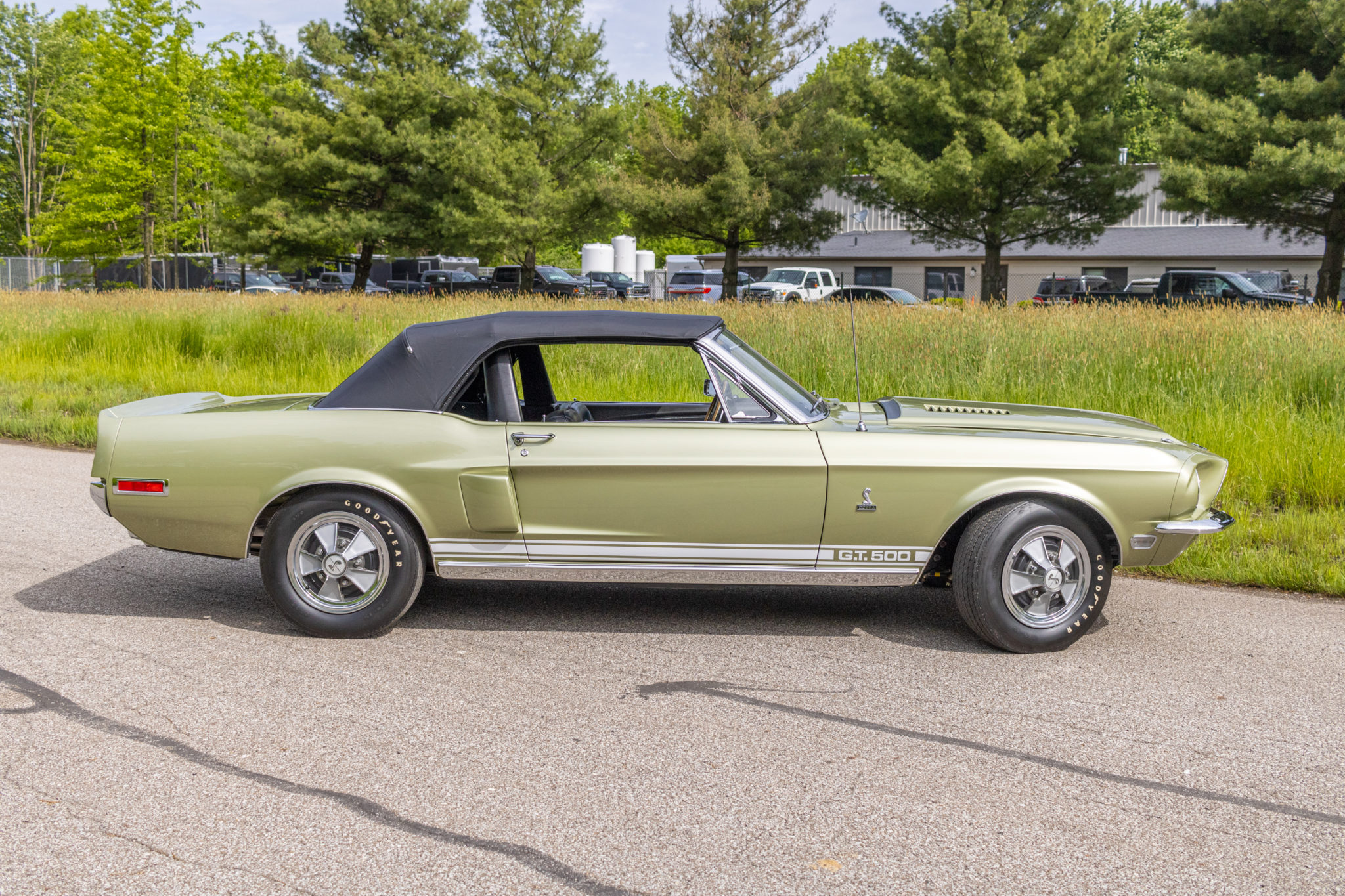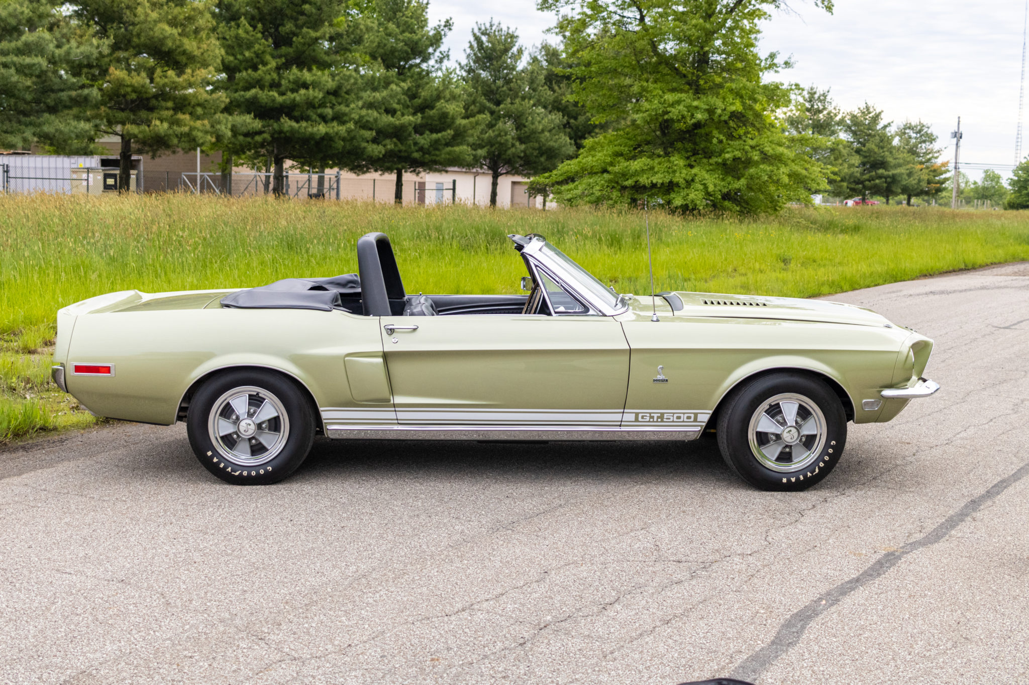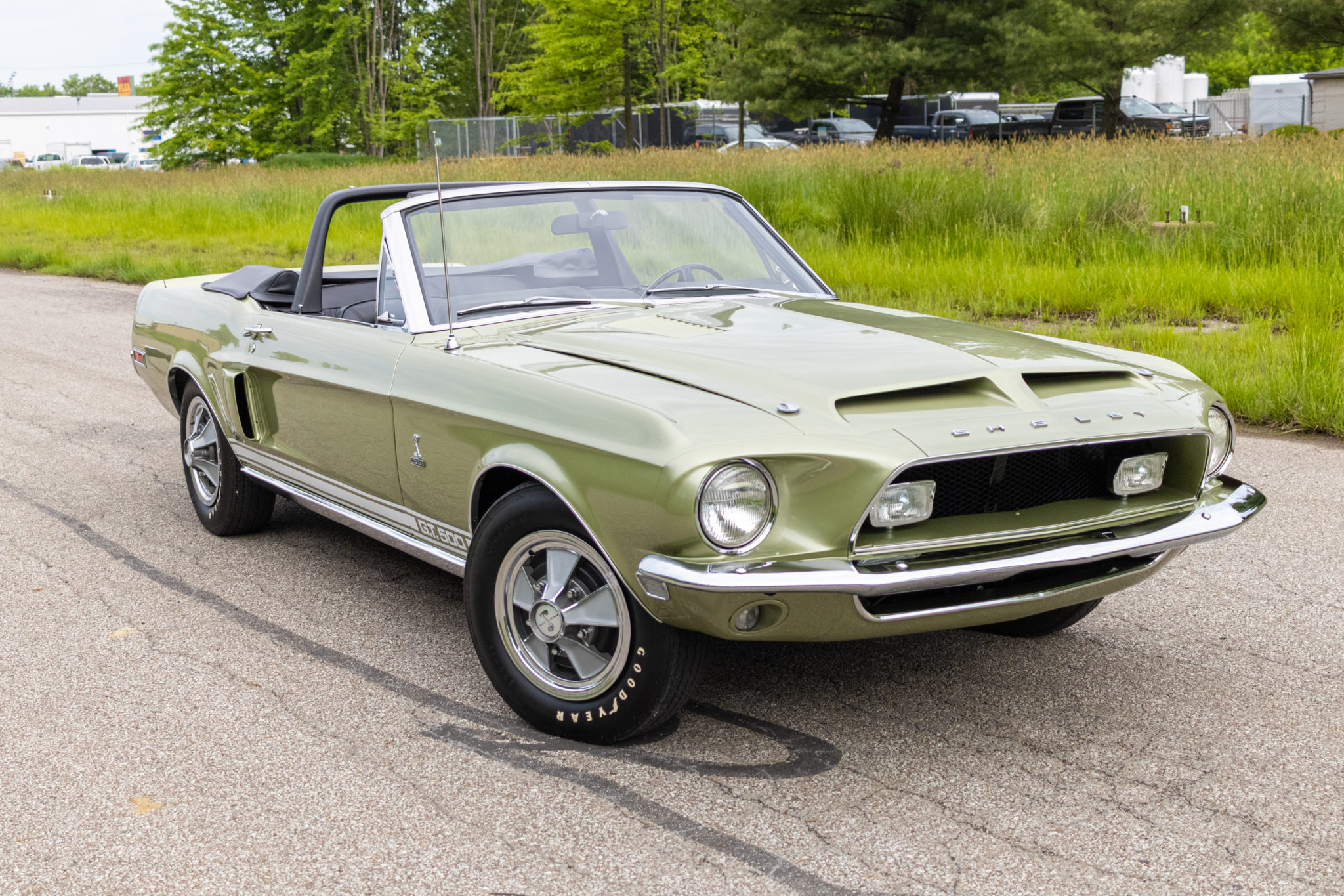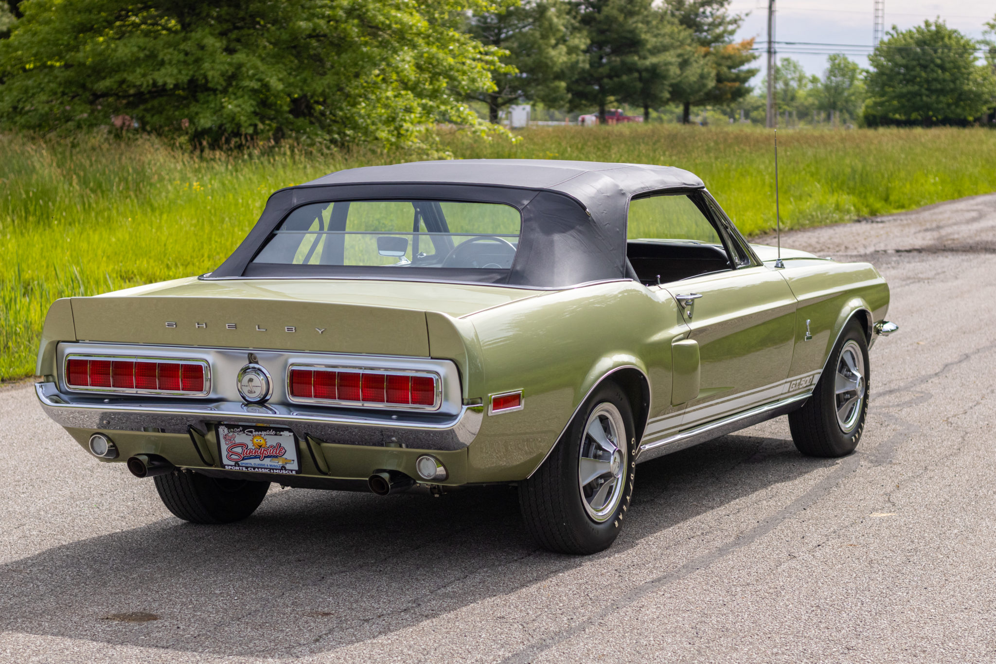 The power-operated black soft top features a glass rear window and can be seen raised and lowered. Steel wheels wear Shelby five-spoke wheel covers and 15″ Goodyear Speedway white-letter tires. Power-assisted steering and front disc brakes were equipped from the factory along with wheel lip moldings.