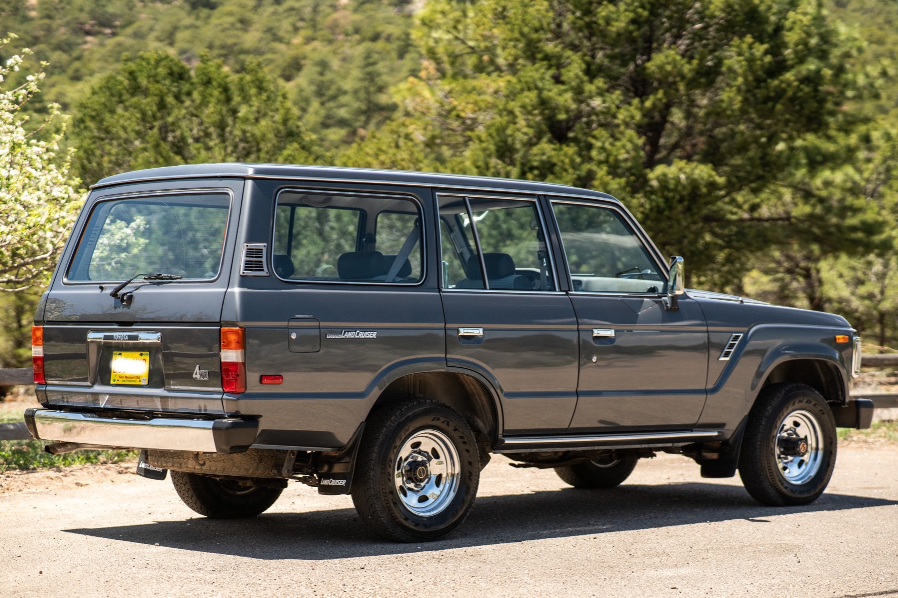 Factory chrome 15″ wheels feature manually-locking front hubs and are mounted with Pathfinder All-Terrain tires at each corner. A matching spare accompanies the truck.