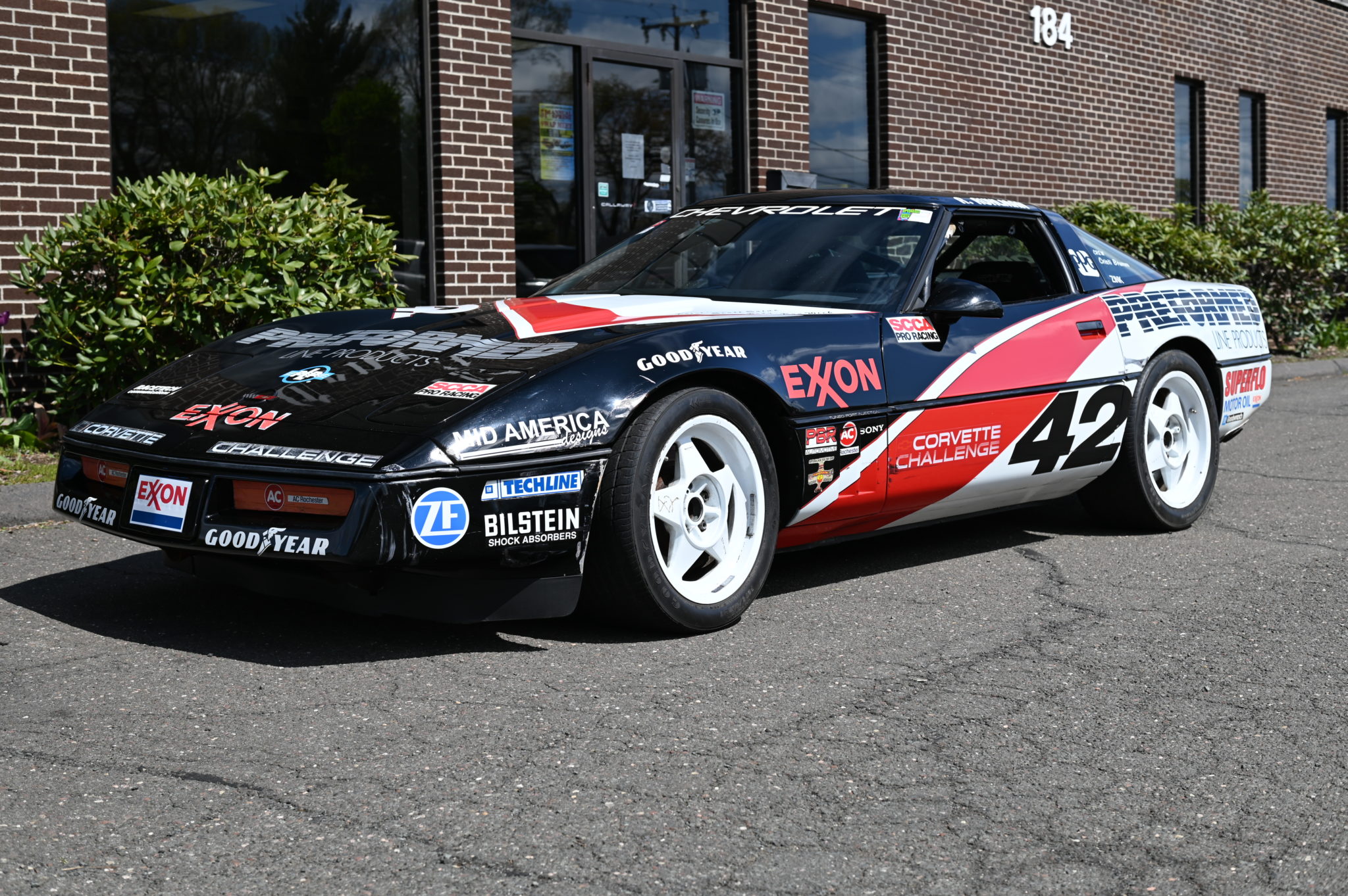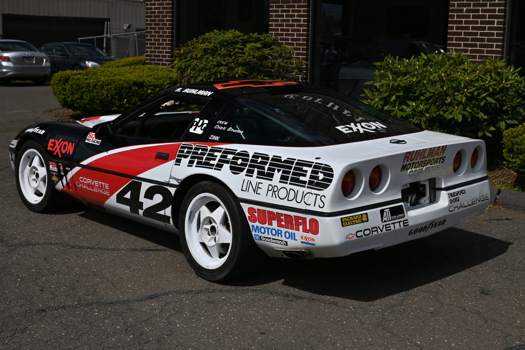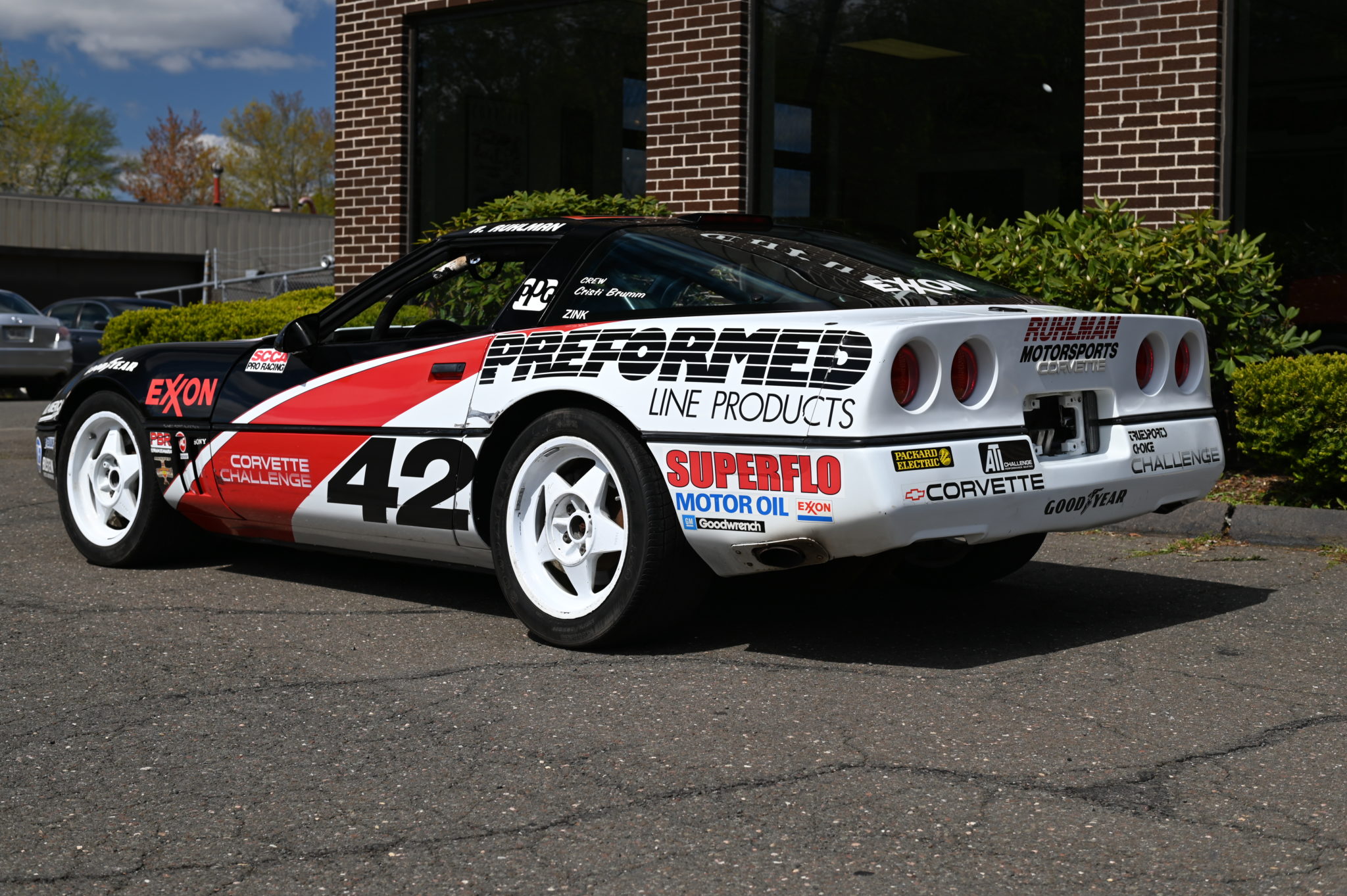 White 17″ Dymag wheels are marked with the car’s racing number in grease pencil and mounted with 275/40 Goodyear Eagle ZR40 tires at all four corners. Rub marks are shown on the left front corner and rear wheel arch as well as chips on the nose and scratches on the wheels. The FX3 Selective Ride suspension option was equipped on all Challenge cars, and Bilstein shocks and racing brake pads were added during conversion for track use.