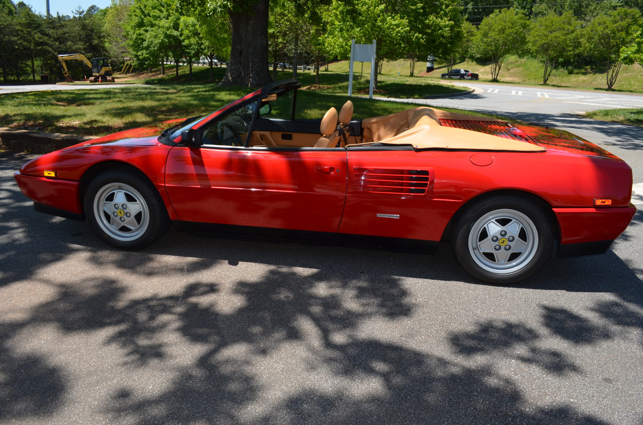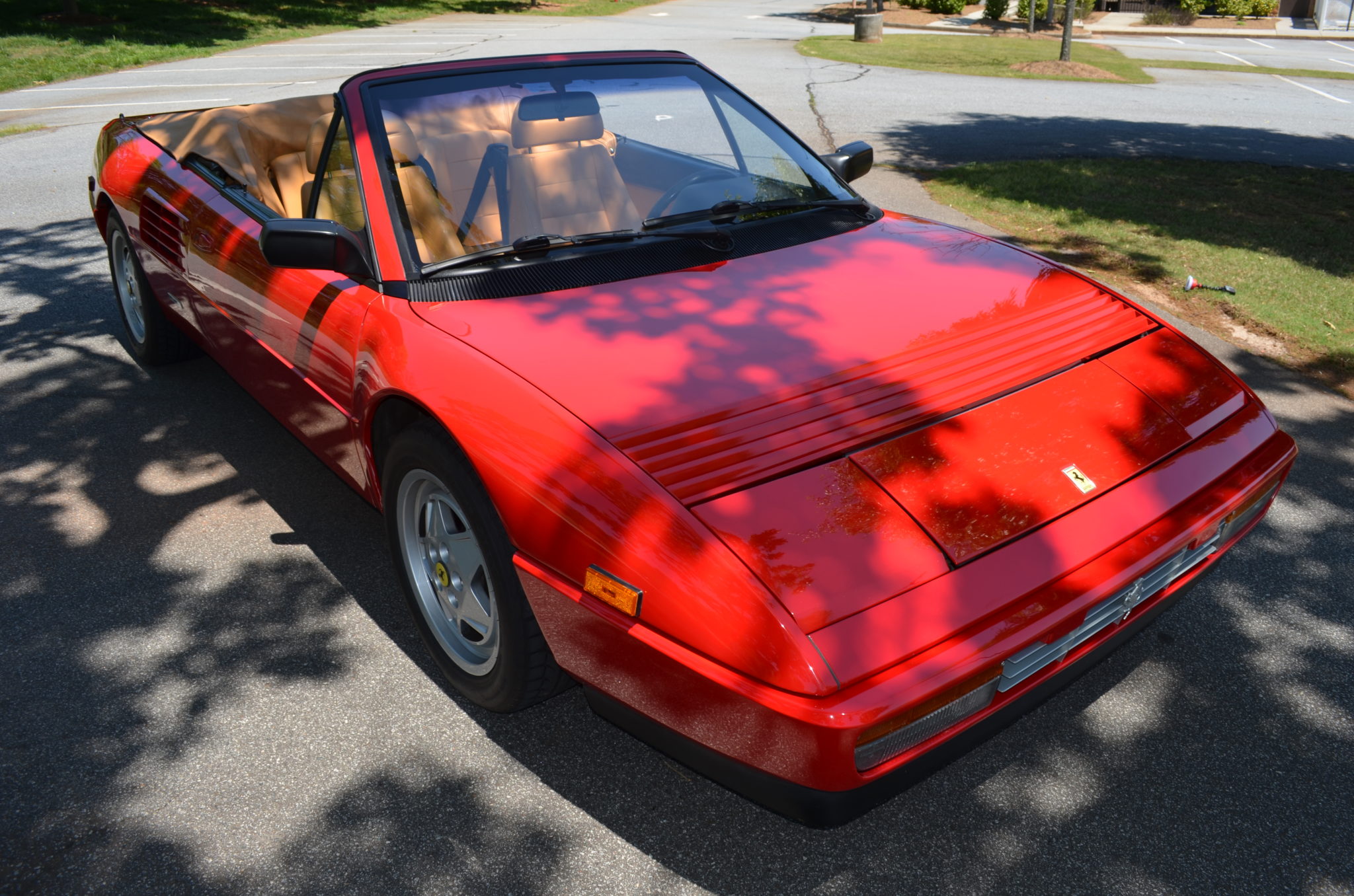 The 16″ five-spoke wheels show Ferrari castings and wear yellow prancing horse center caps as well as staggered-width BFGoodrich g-Force Sport Comp 2 tires. Standard equipment included anti-lock brakes, power steering, and adjustable suspension with two stiffness settings. The included inspection report notes a knock from the suspension when turning left at low speeds, and the brake and power steering fluids have been changed.