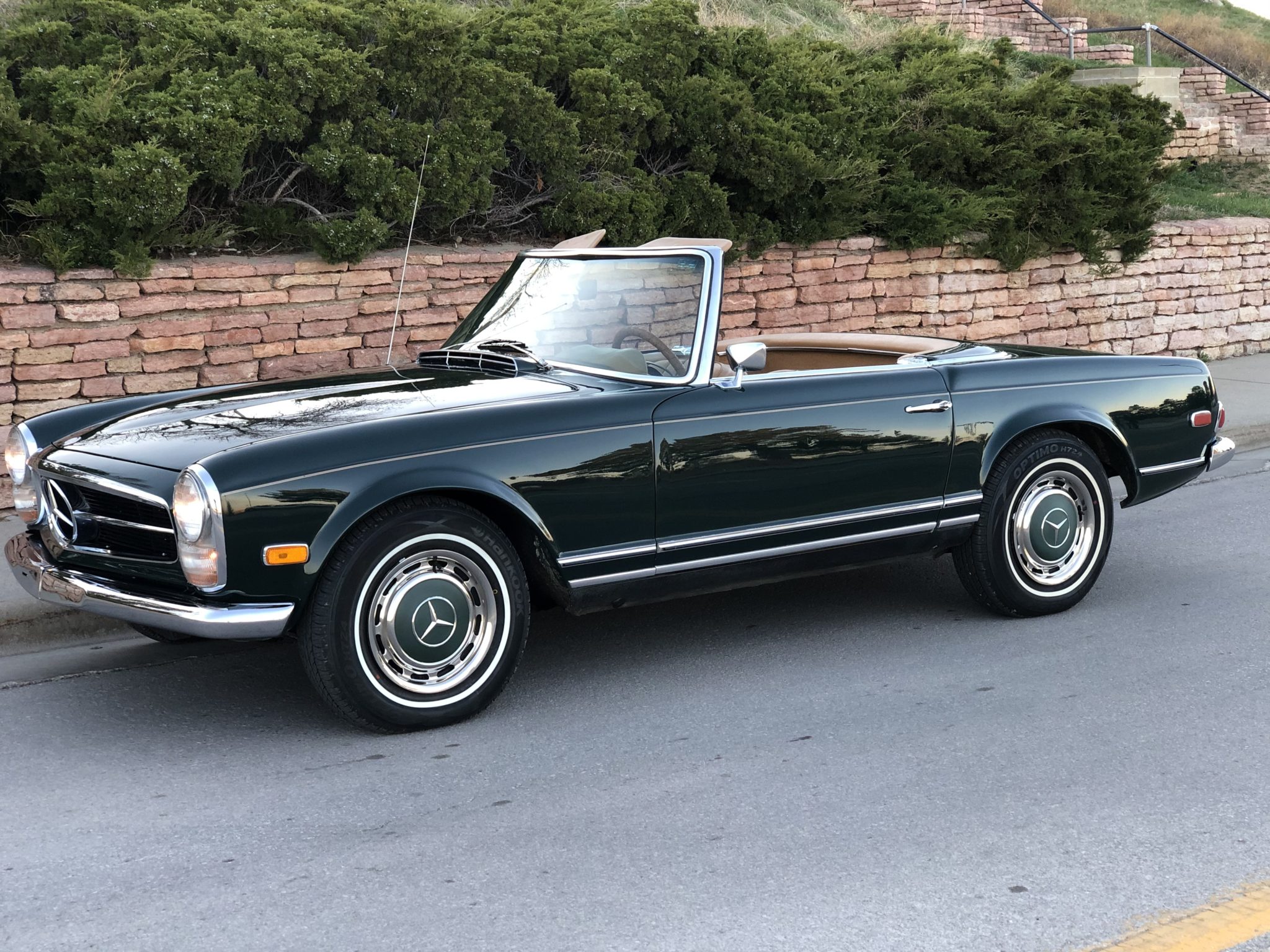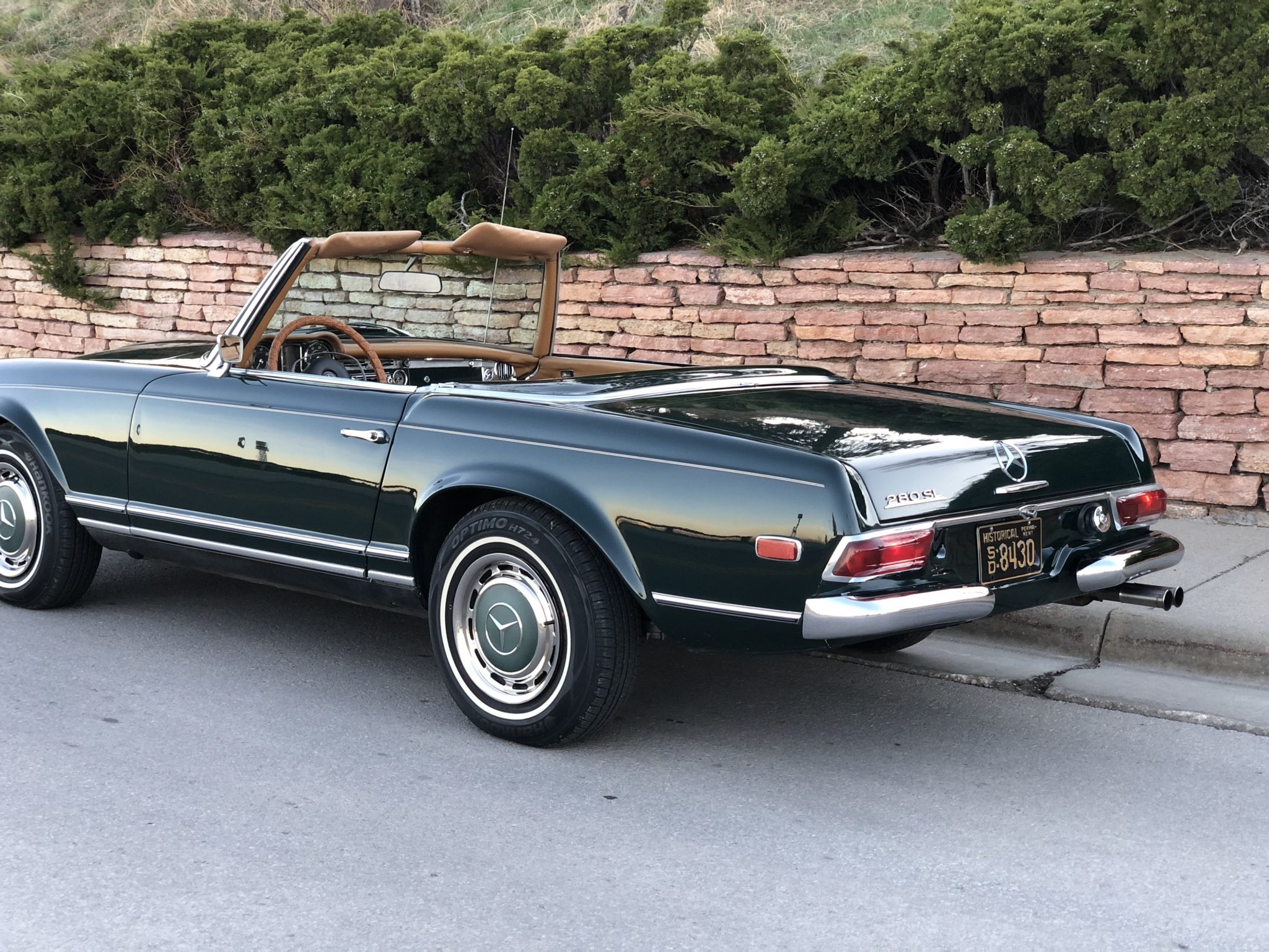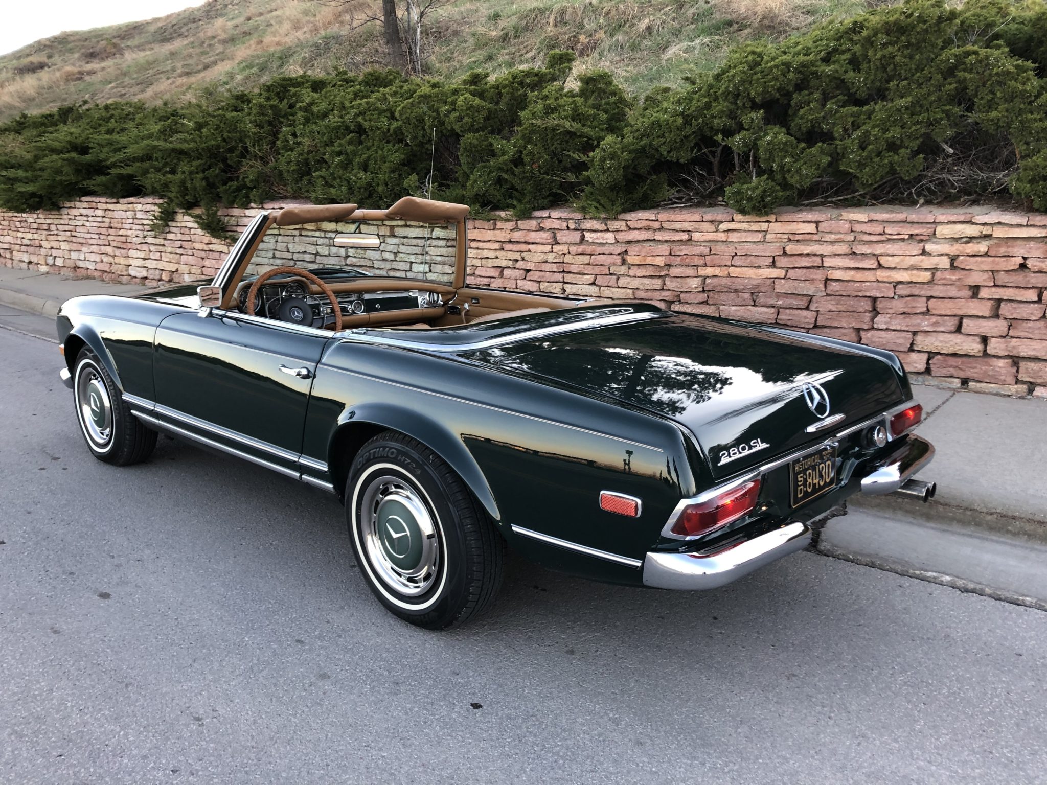 14″ steel wheels feature full covers with body-color centers and wear 205/75 Hankook Optimo H724 tires. Braking is from discs at all four corners, and the master cylinder and booster were replaced in 2014. The included Pagoda hardtop is installed in the photo above.