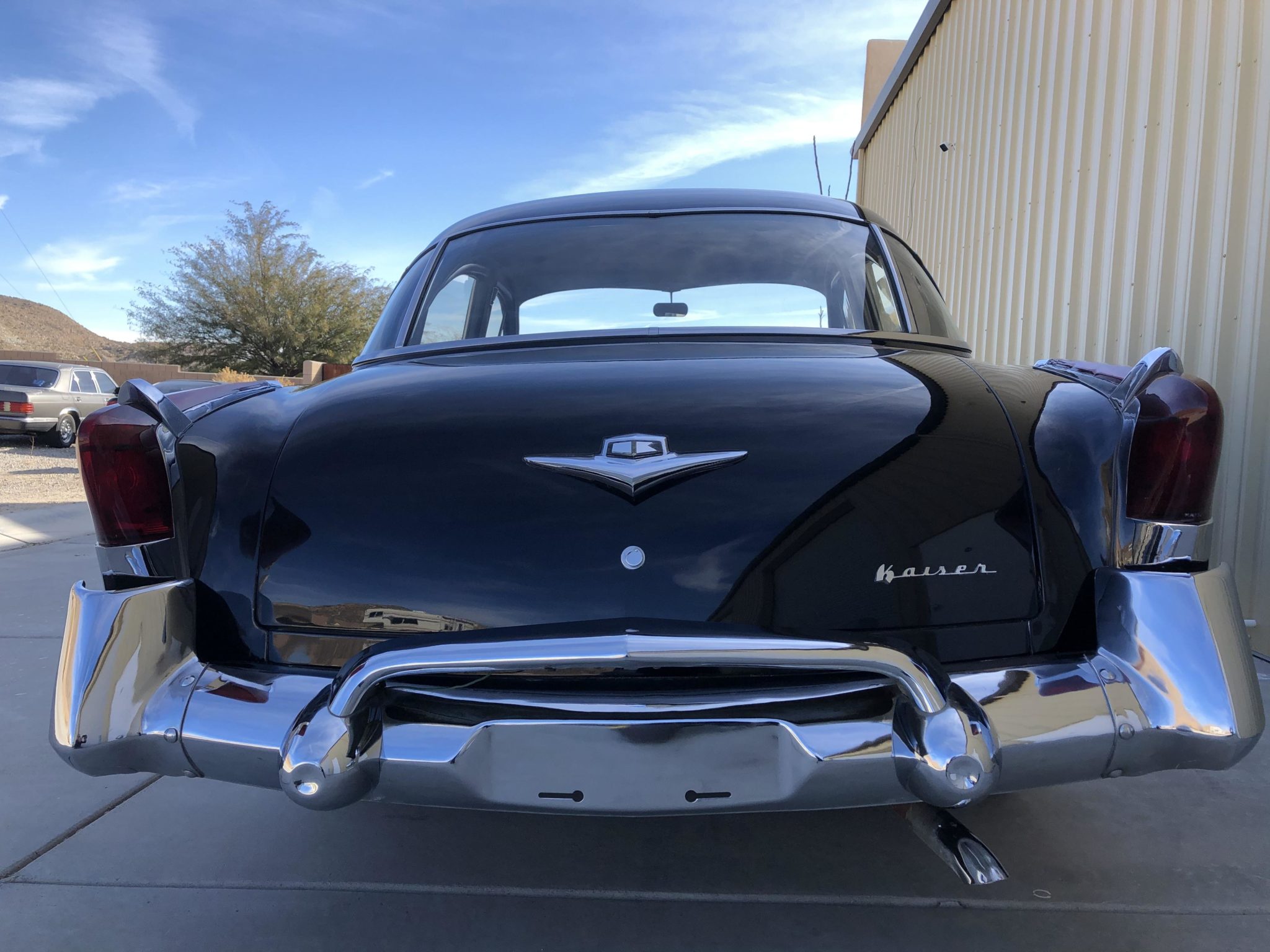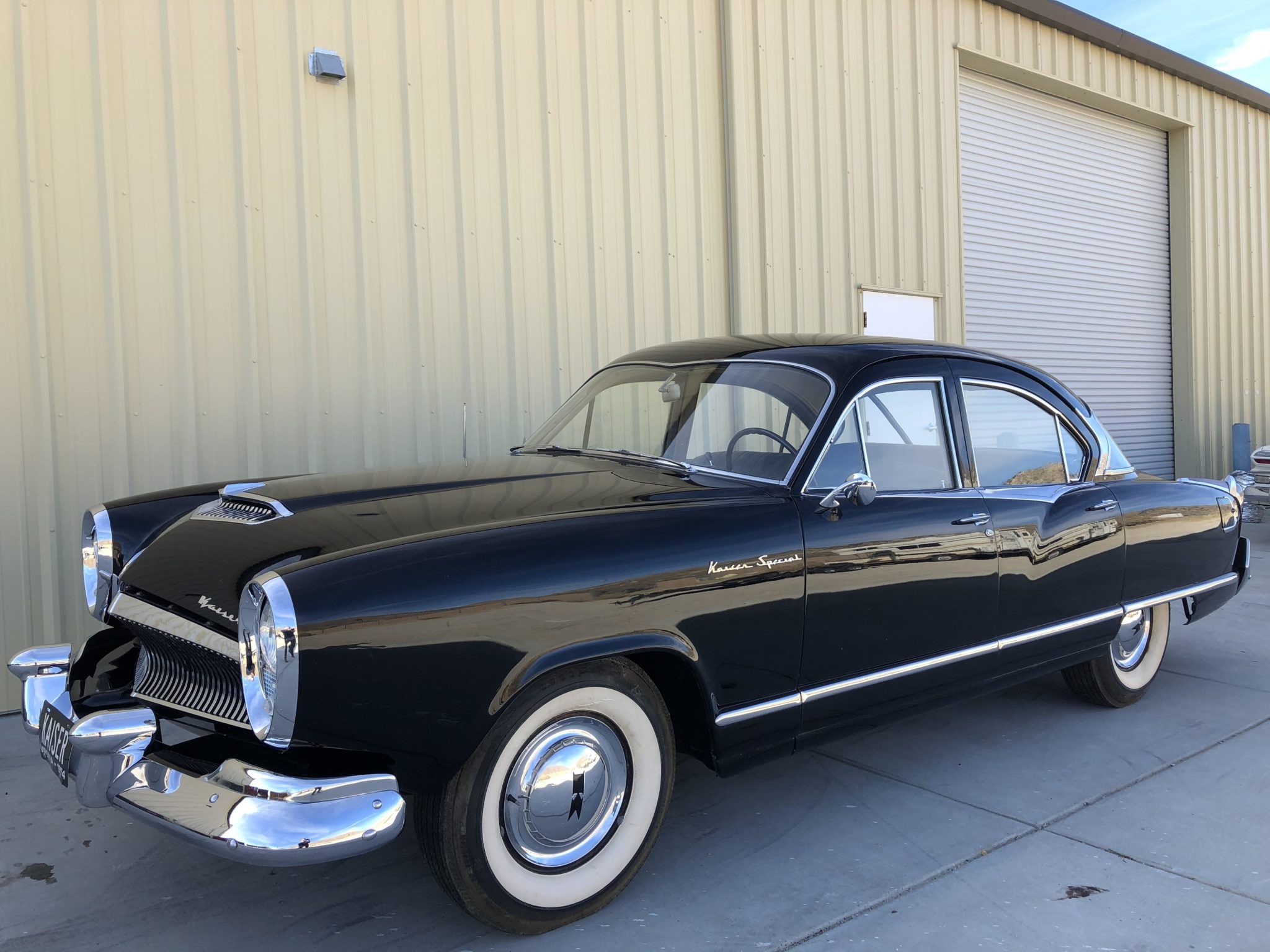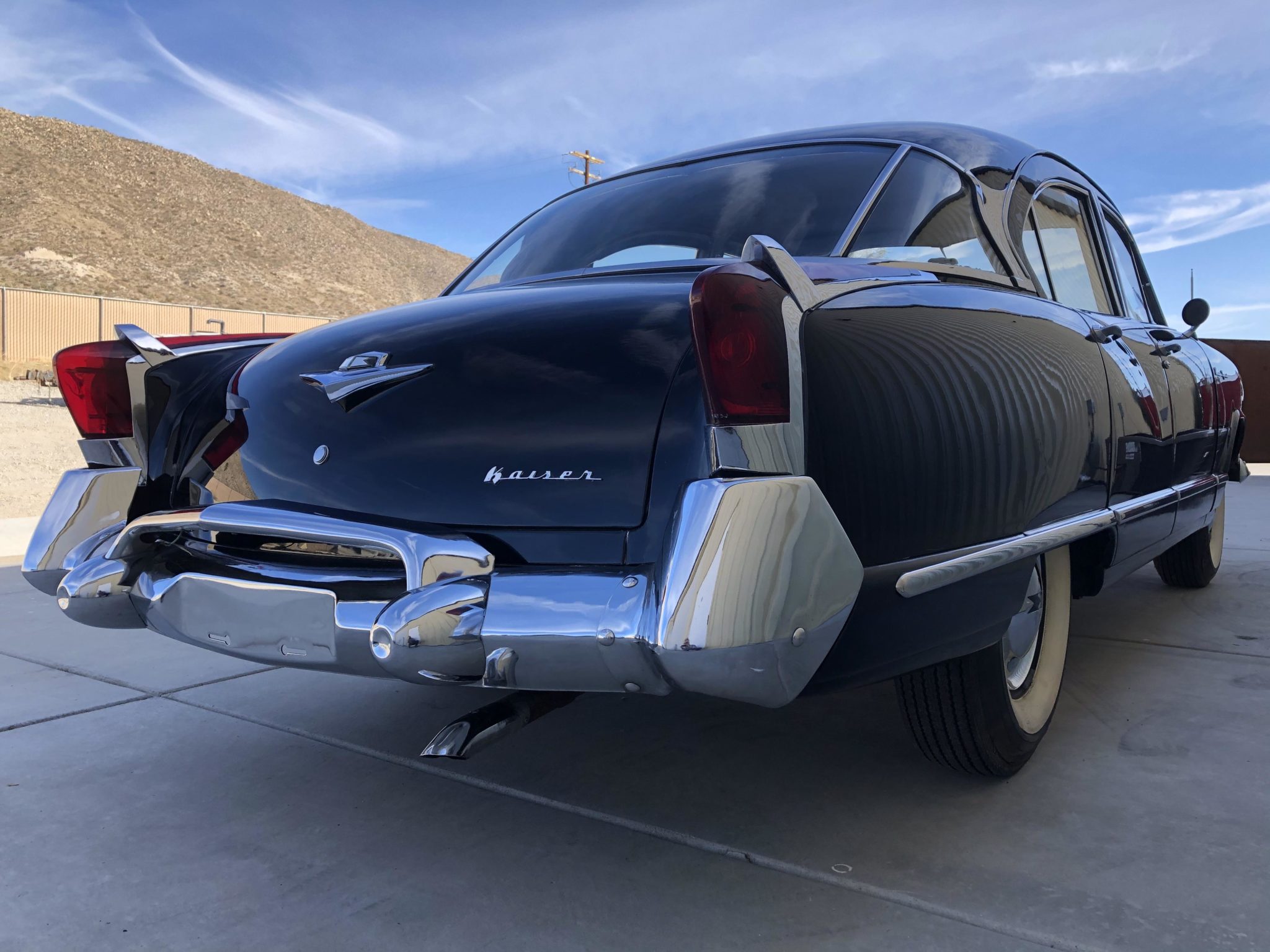 Black 15” steel wheels feature chrome Kaiser-branded covers with whitewall tires that the seller states are in need of replacement.