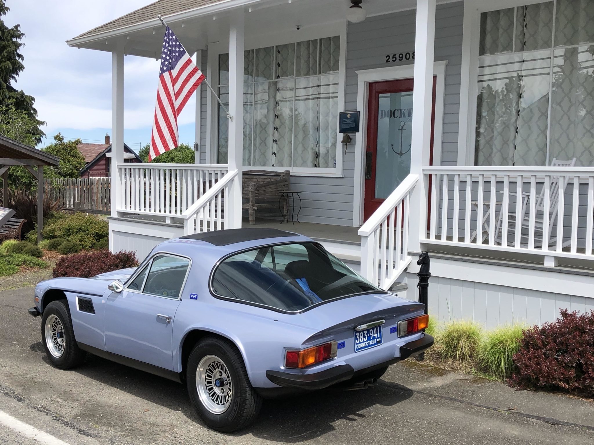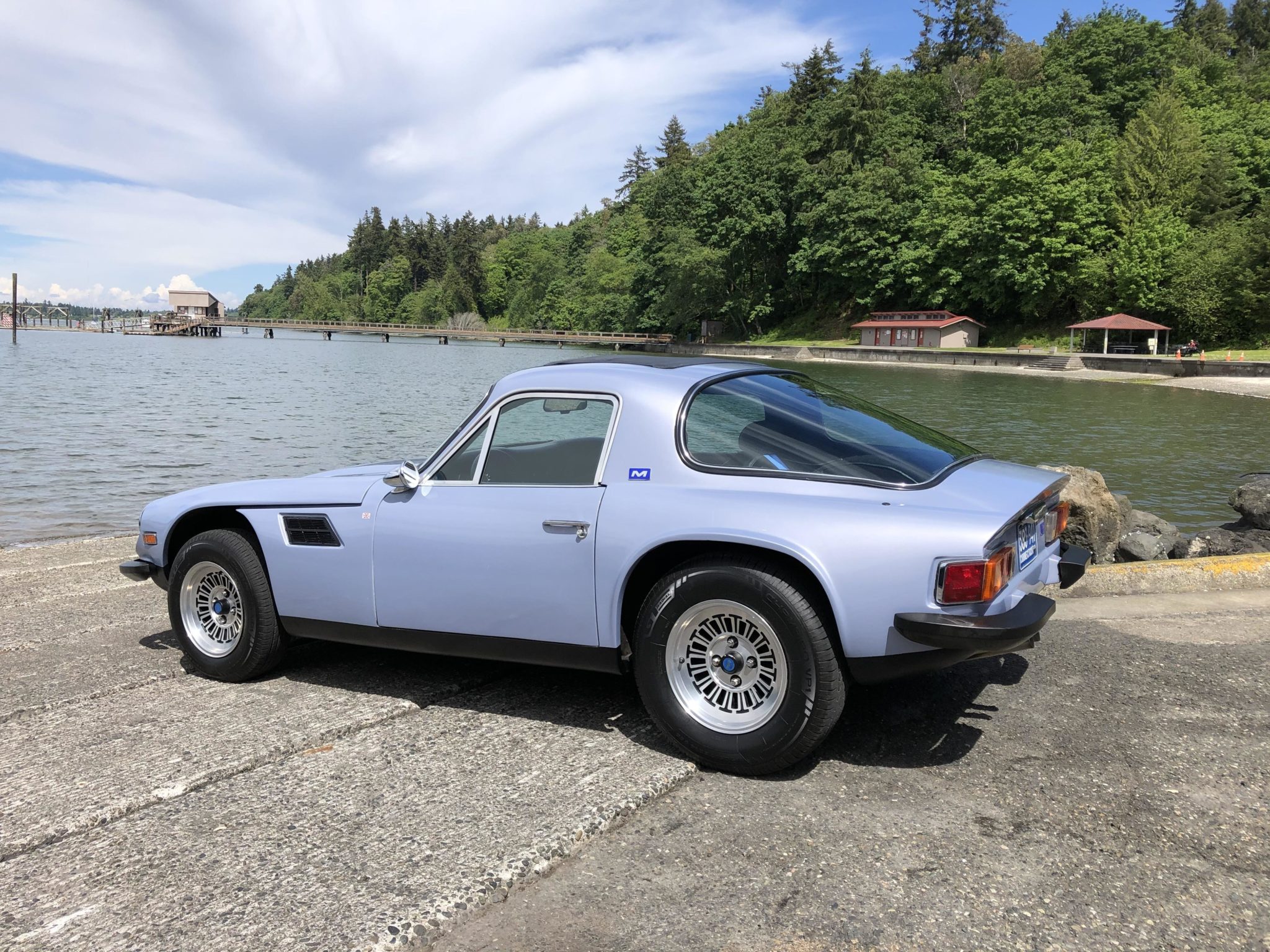 Factory 14″ T-slot wheels are wrapped in Champiro GT Radial tires measuring 185/75 on the front and 205/75 out back. Power-assisted front disc and rear drum brakes were fitted as standard, as was rack-and-pinion steering, double-wishbone front suspension, a Triumph-based independent rear suspension, and coil springs front and rear. SPAX adjustable coilover shocks have been installed at all four corners.
