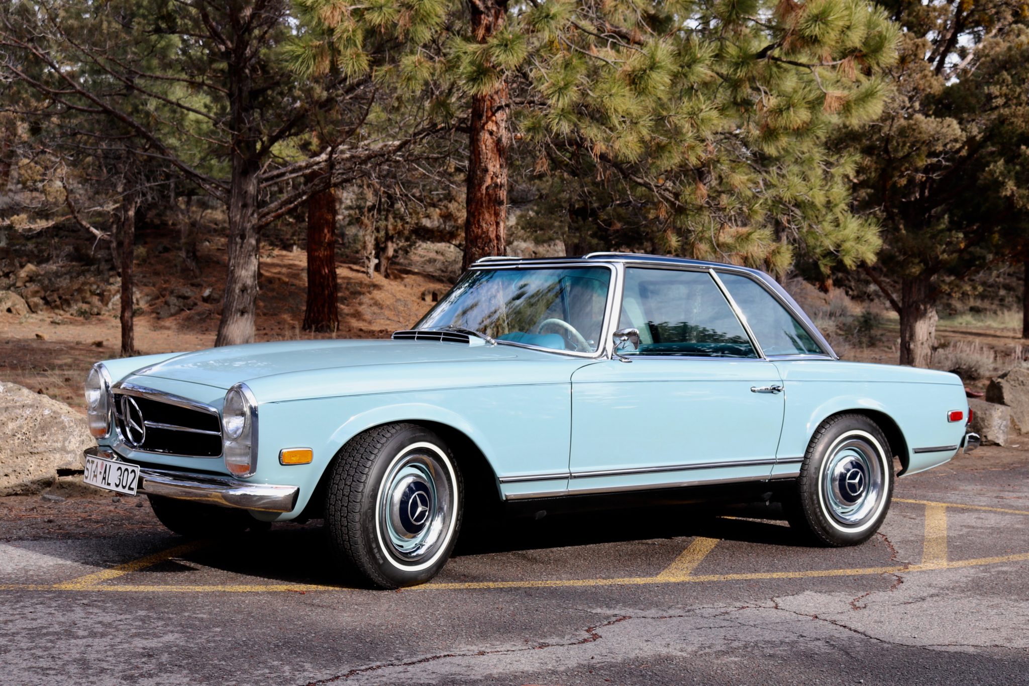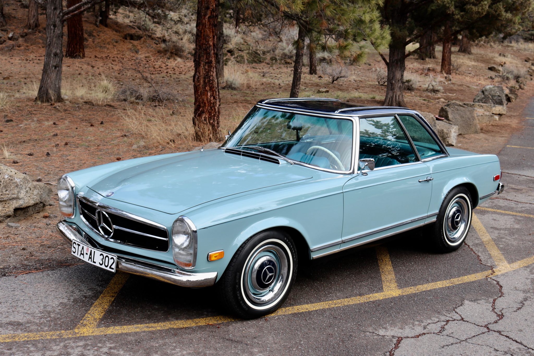 Body-colored 14” steel wheels wear chrome beauty rings and dark blue hubcaps, and are wrapped in Michelin Radial XH tires. Disc brakes are equipped at all four corners.