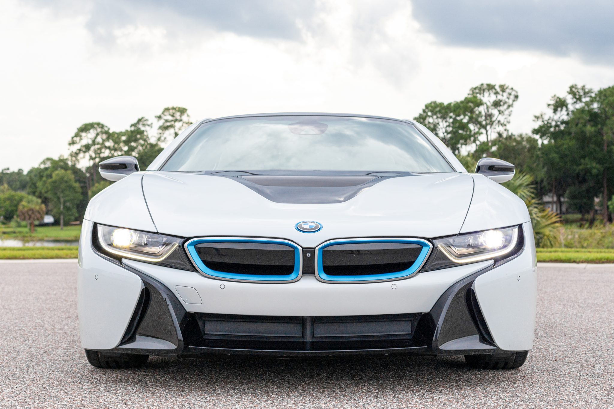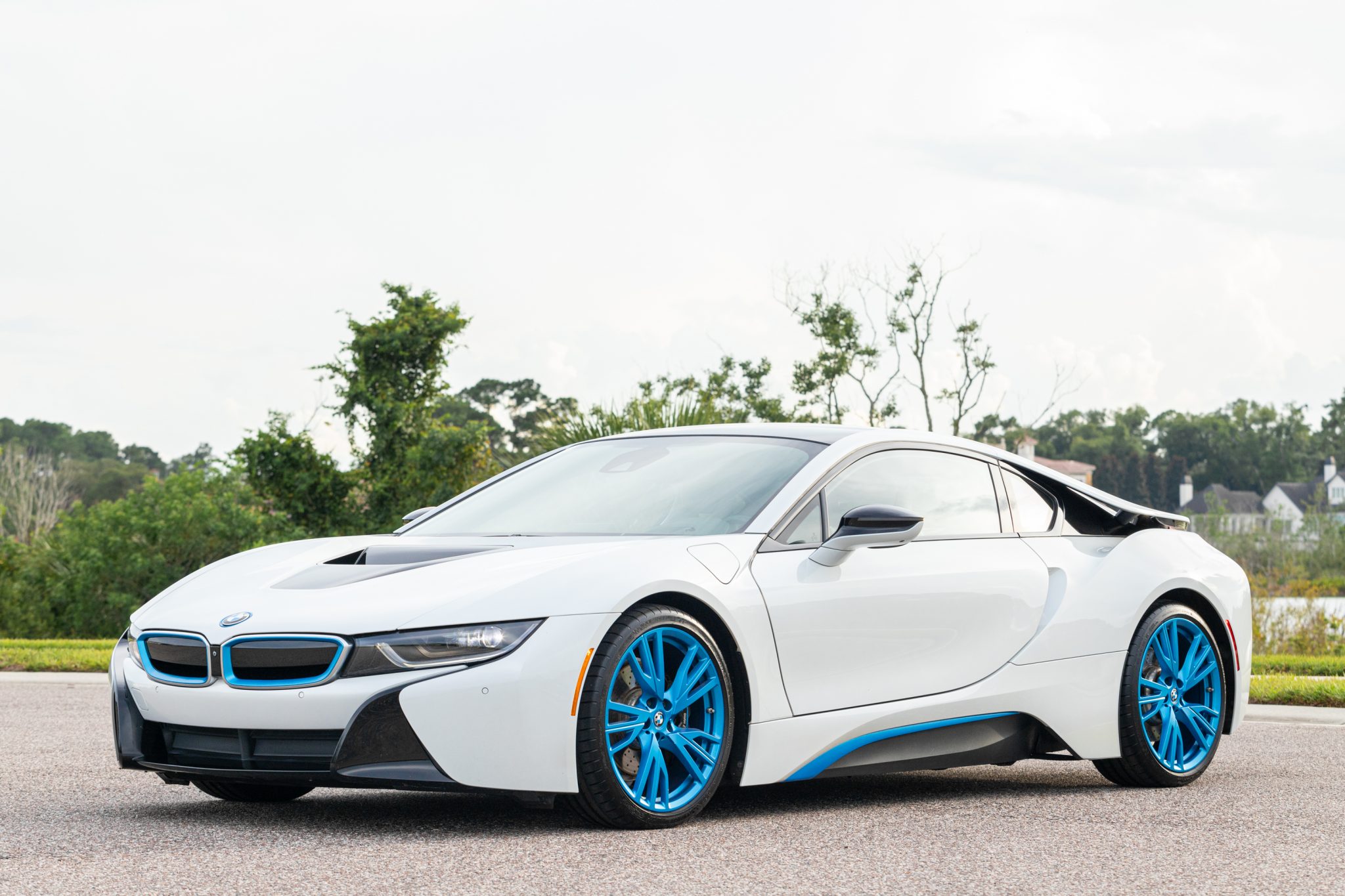 Factory 20″ Style 470 wheels have been powder-coated to match the i8’s blue exterior accents and are wrapped in 245/35 Michelin Pilot Super Sport tires. Brake calipers with i Blue accents and “BMW i” lettering are equipped as part of the Pure Impulse package.