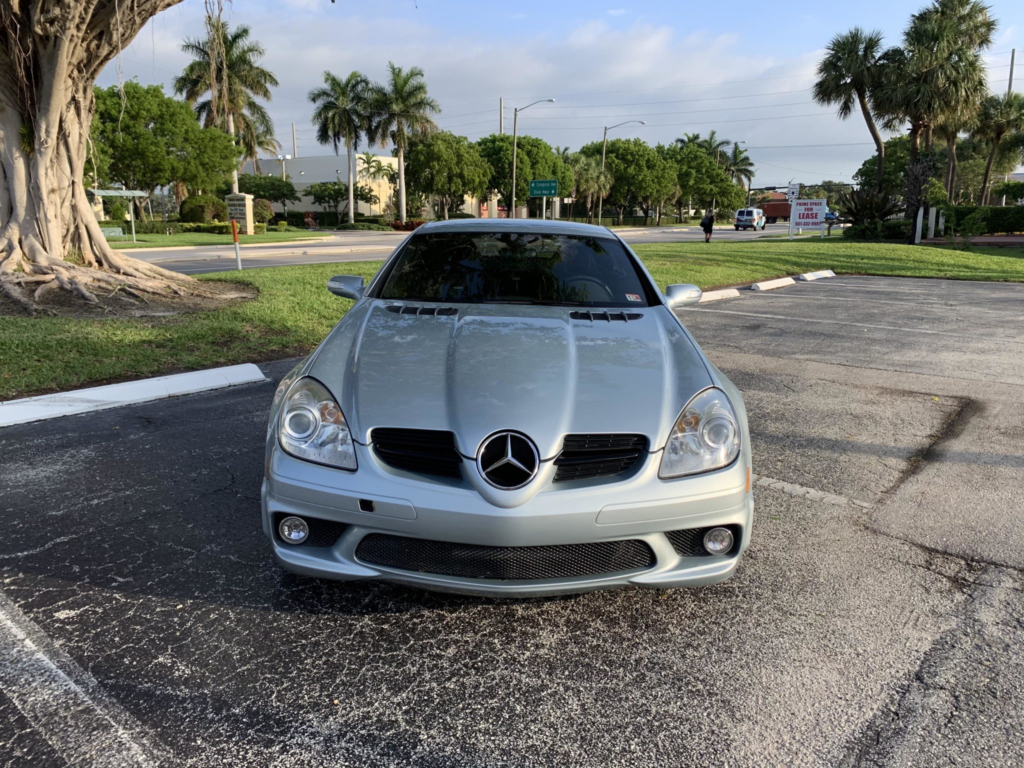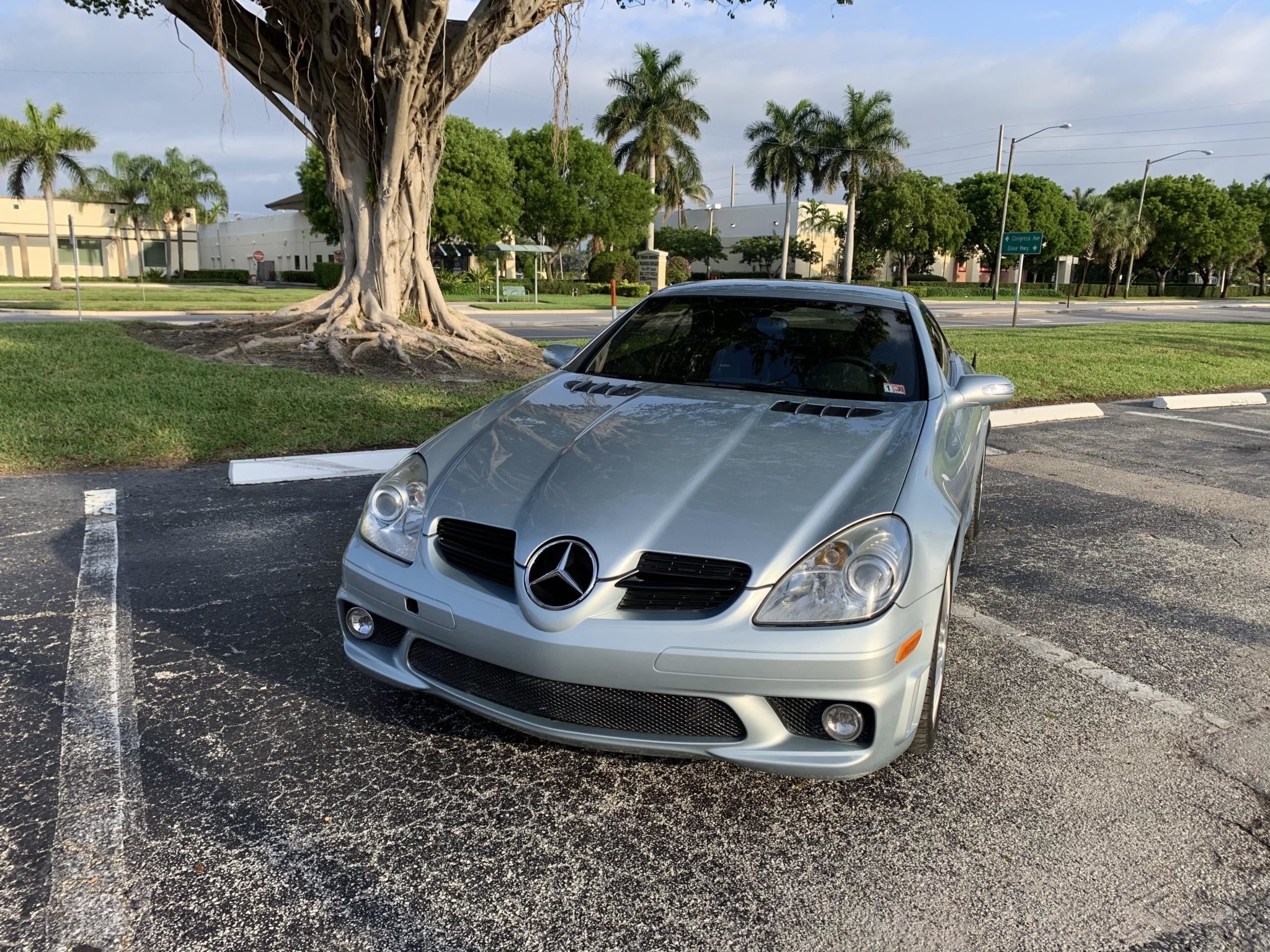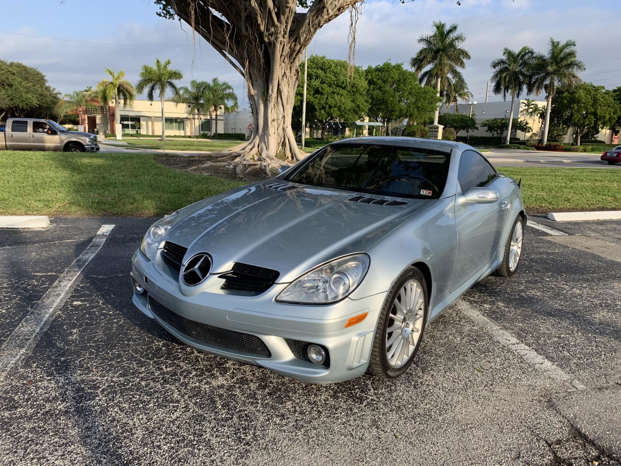 Multi-spoke 18″ AMG wheels wear Pirelli P Zero tires measuring 225/40 up front and 245/35 out back. The SLK55 came equipped with a lowered, sport-tuned suspension with stiffer springs, shocks, and sway bars, as well as silver-finished calipers and cross-drilled and slotted rotors at each corner. The front brake rotors and power steering pump were replaced in January 2020.