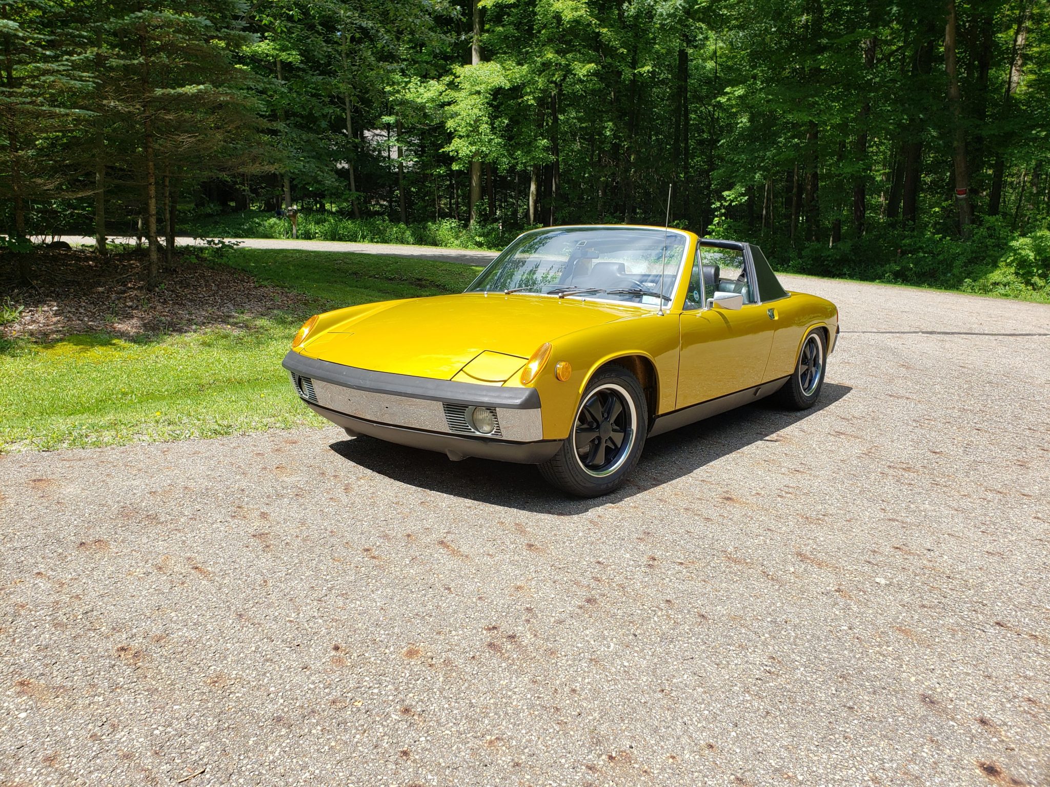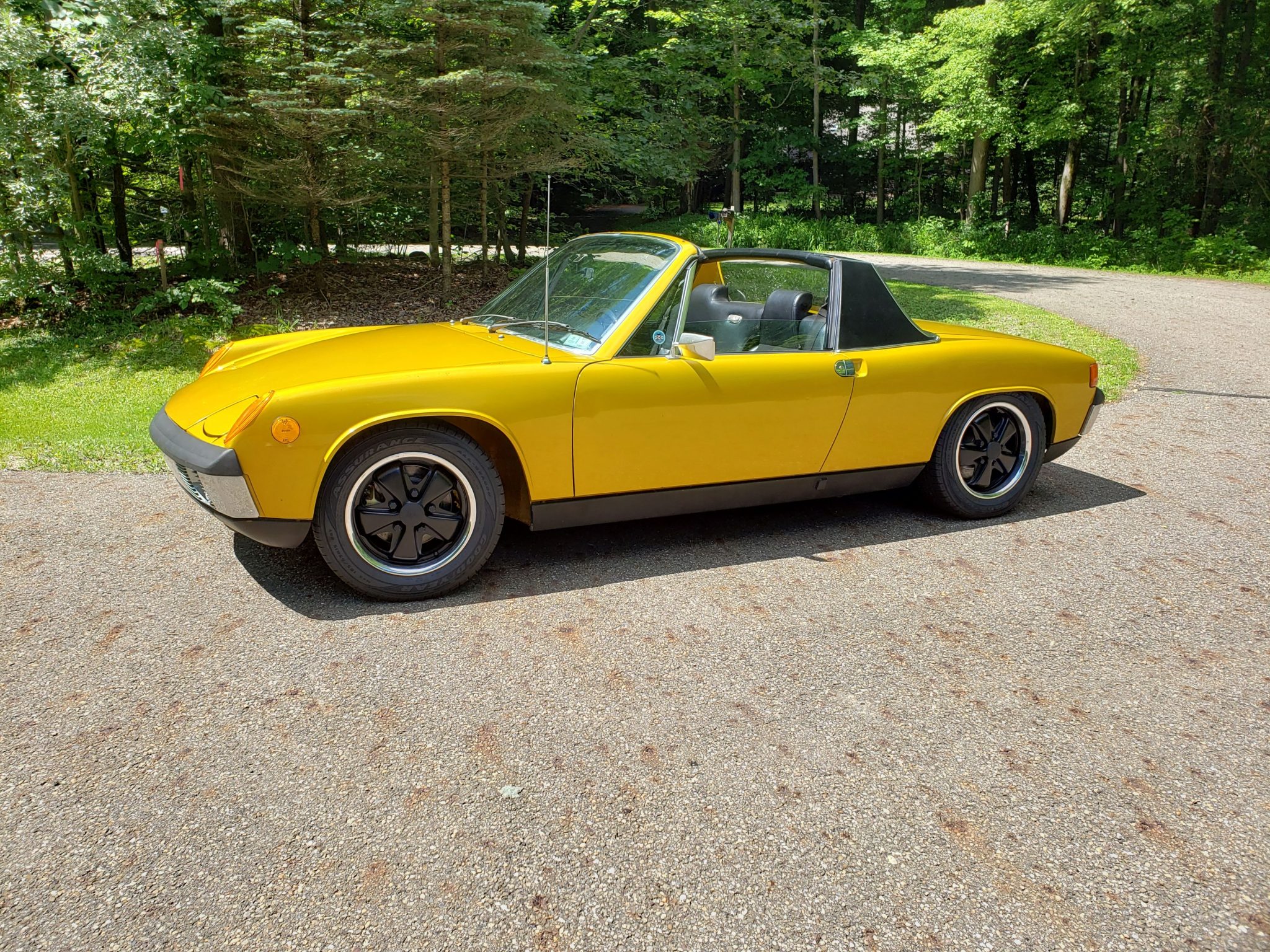 Black Fuchs wheels have polished outer lips, and the Goodyear Assurance tires have been replaced during current ownership. The car is equipped with four-wheel disc brakes, and each corner is shown with the wheels removed in the gallery.