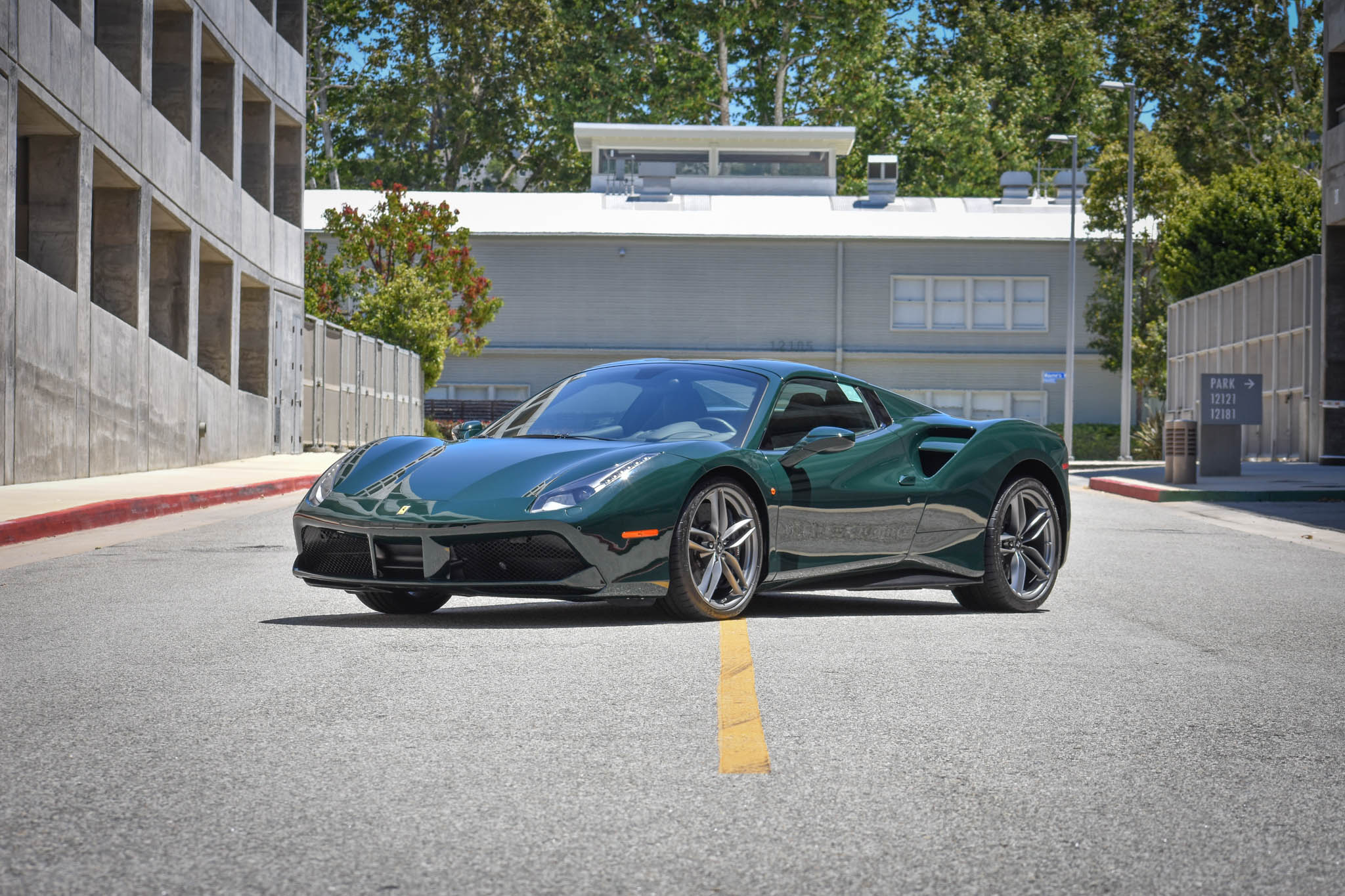 Optional dark-finished 20″ split-spoke wheels are mounted with Michelin Pilot Super Sport tires. Black-finished Brembo calipers are fitted over carbon ceramic rotors, and the car is equipped with adjustable magnetorheological dampers.