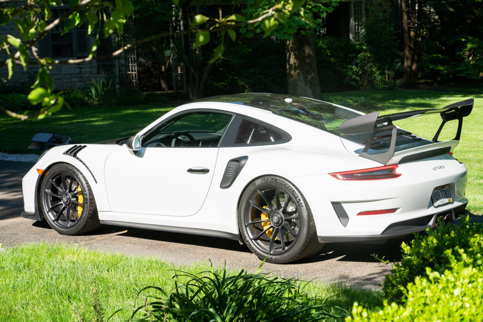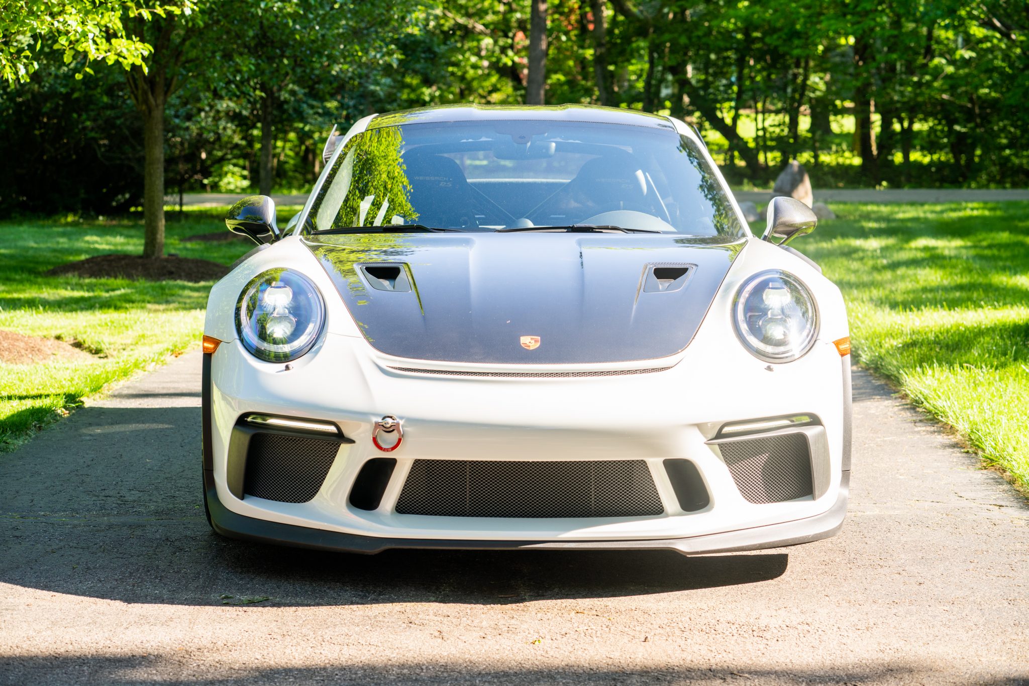 Factory 20″ front and 21″ rear center lock wheels are finished in satin black and wear Michelin Pilot Sport Cup 2 tires that were installed in November 2019 and measure 265/35 and 325/30. The Weissach Package included stiffer carbon composite anti-roll bars, and the seller also added a Rennline folding tow hook and tie down set. Porsche Ceramic Composite Brakes (PCCB) were optioned at a cost of $9,210 and feature yellow calipers along with 16.1″ front and 15.4″ rear rotors.