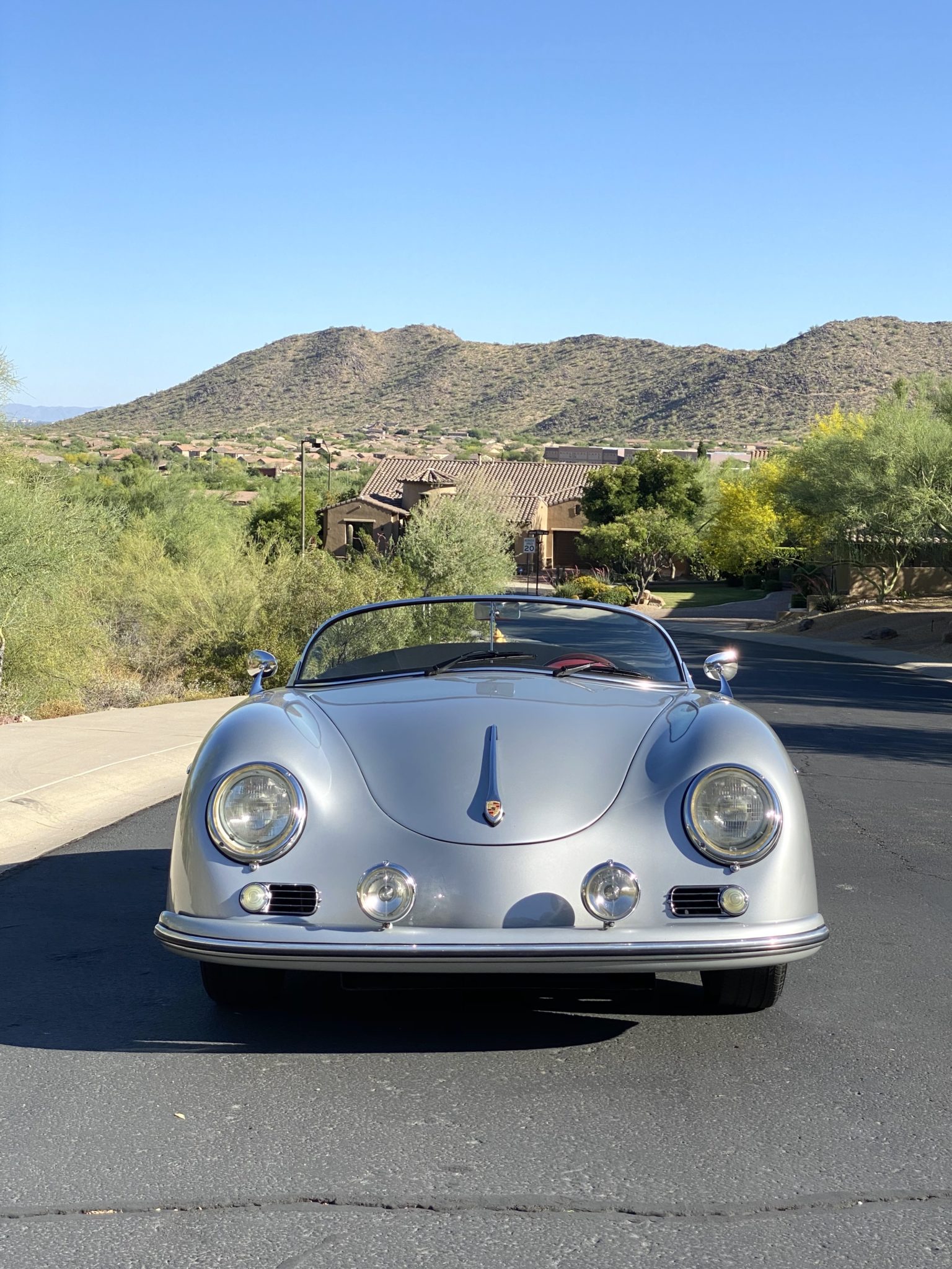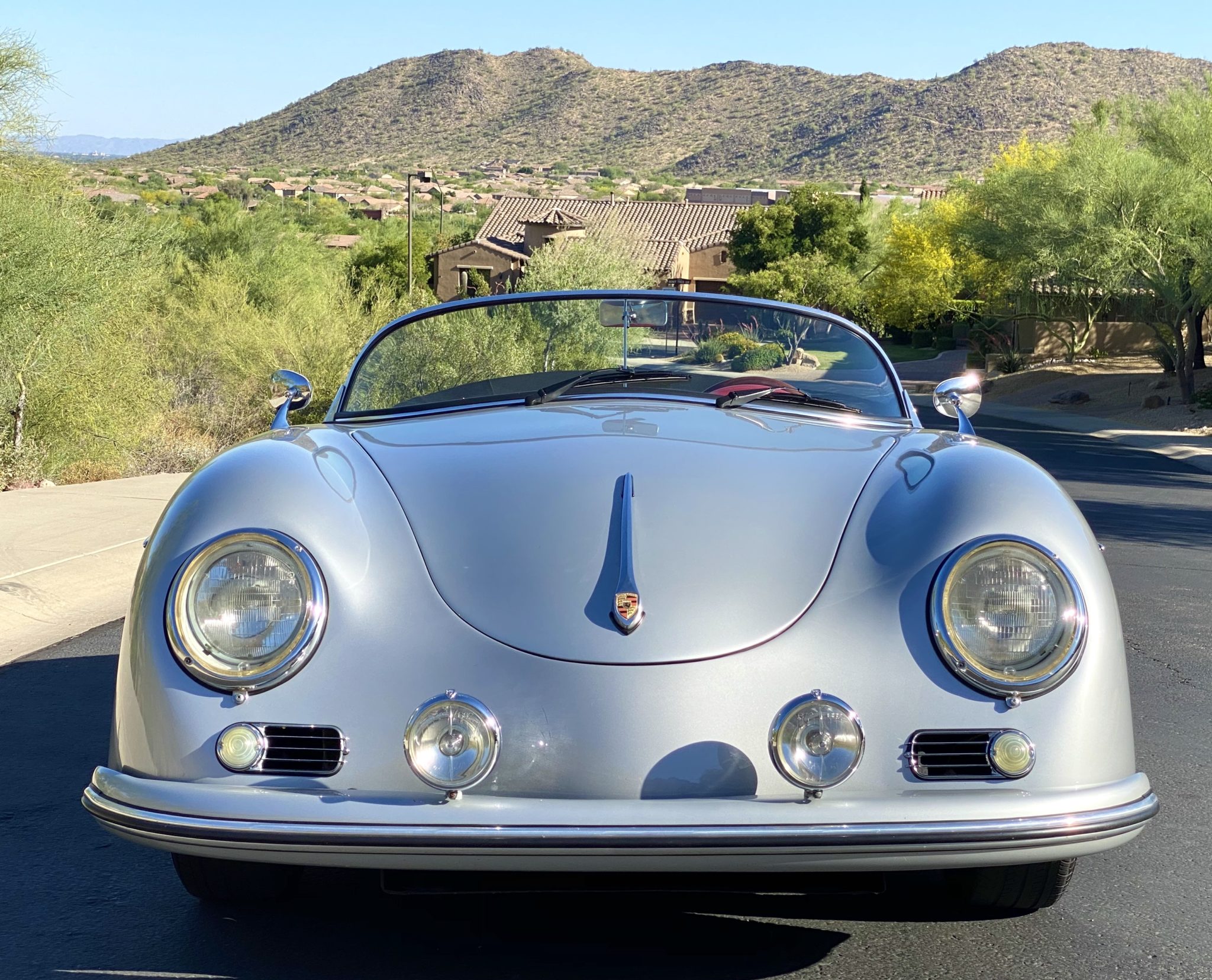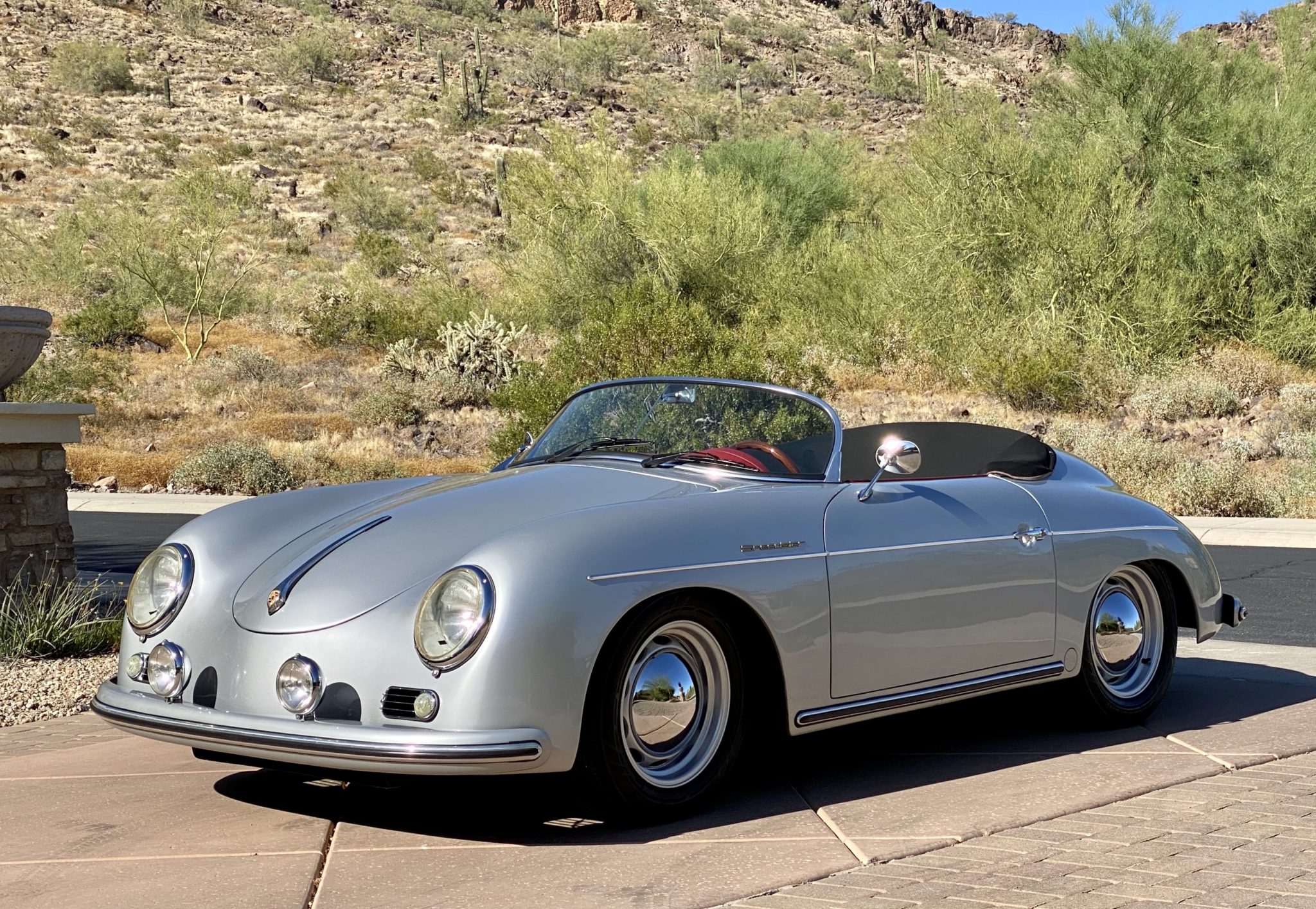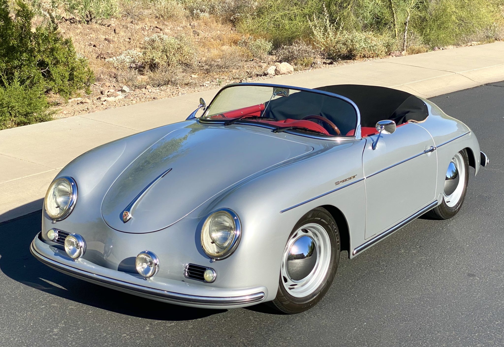The folding black top features removable side curtains and stows under a black mohair boot, and is shown raised in the gallery below. Steel 15″ wheels wear chrome hubcaps and Bridgestone Ecopia tires. Disc brakes were optioned at all four wheels.