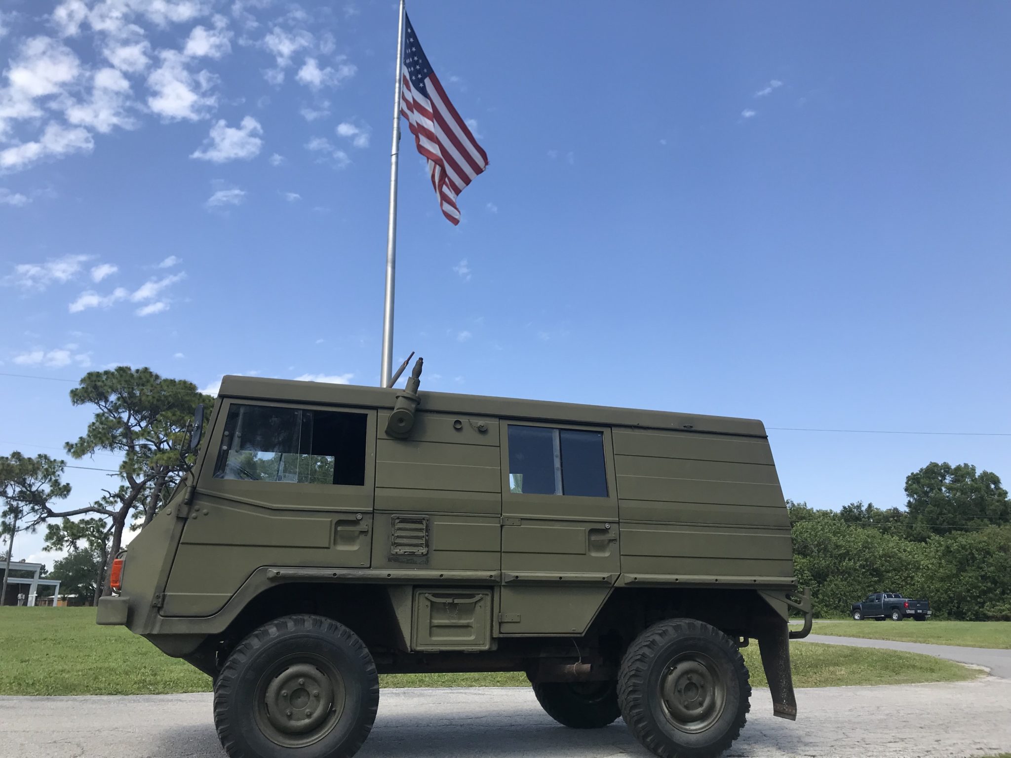 Body-colored 16″ steel wheels wear military-spec Maloya tires, and a matching spare with a BFGoodrich tire is mounted to the tailgate. The suspension features telescoping shocks and dual coil springs in the rear. The brake master cylinder and the wheel cylinders have reportedly been rebuilt.