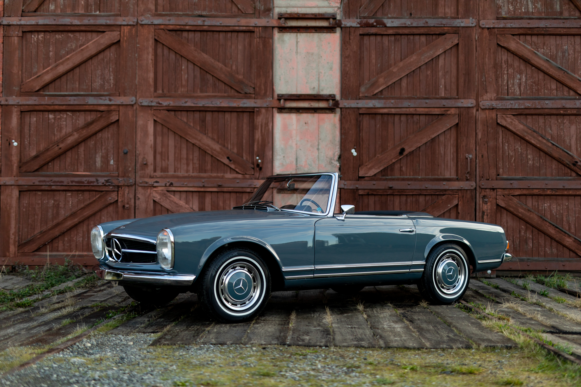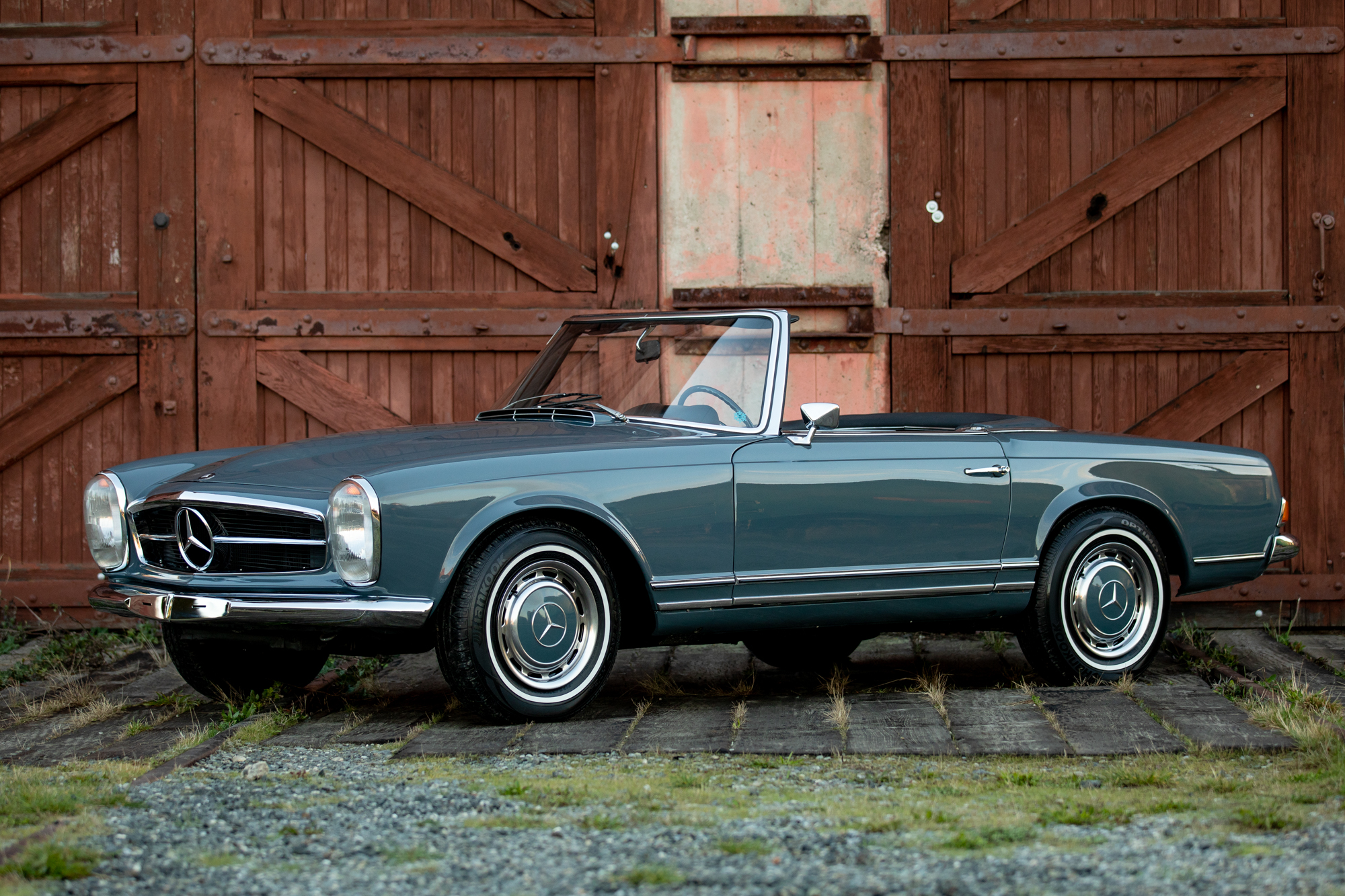 Factory 14” steel wheels wear color-matched and polished covers and 195/75 Hankook Optimo thin whitewall tires that were installed in September 2020. Braking is handled by power-assisted discs at all four wheels, and service at Coachwerks Restoration in September 2020 included rebuilt rear calipers and a brake fluid exchange.