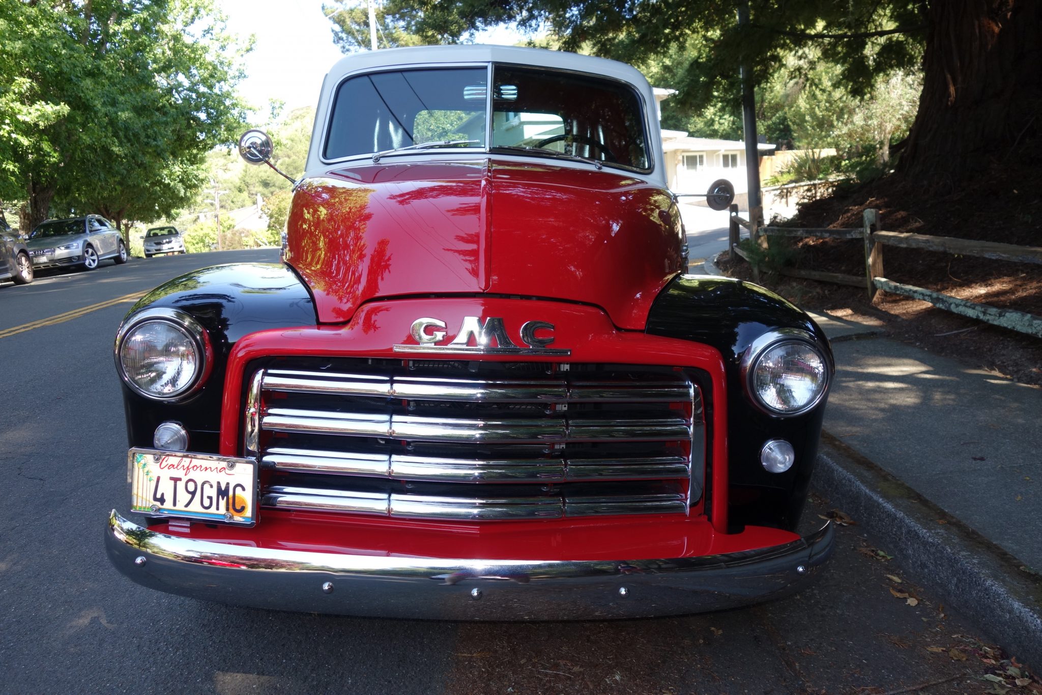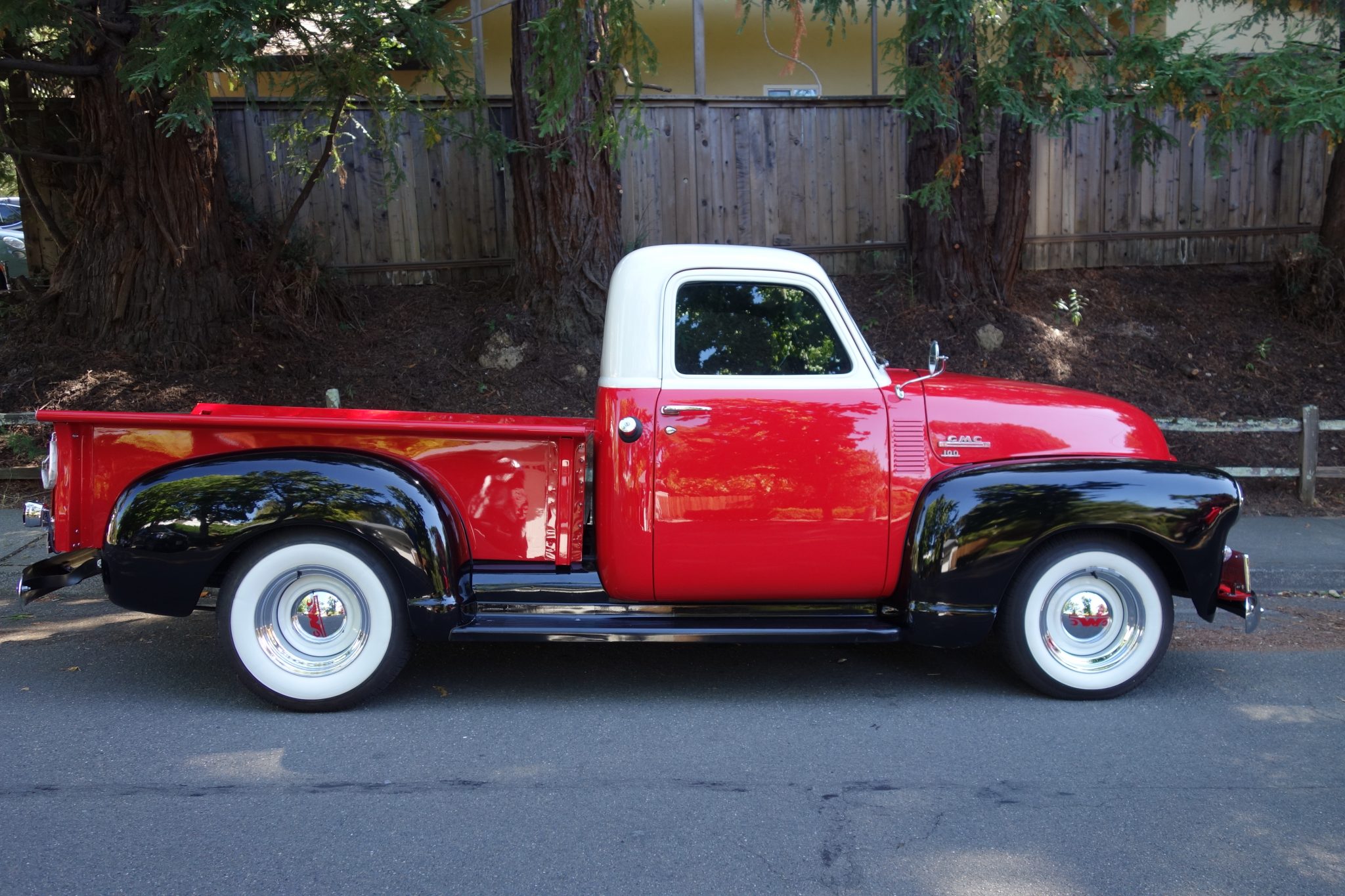 White-painted 15″ steel wheels with chrome GMC-branded hubcaps and trim rings are wrapped in Coker Classic wide-whitewall tires measuring 205/75 in front and 235/75 out back. The suspension has been modified with gas shocks and single leaf springs at each corner.